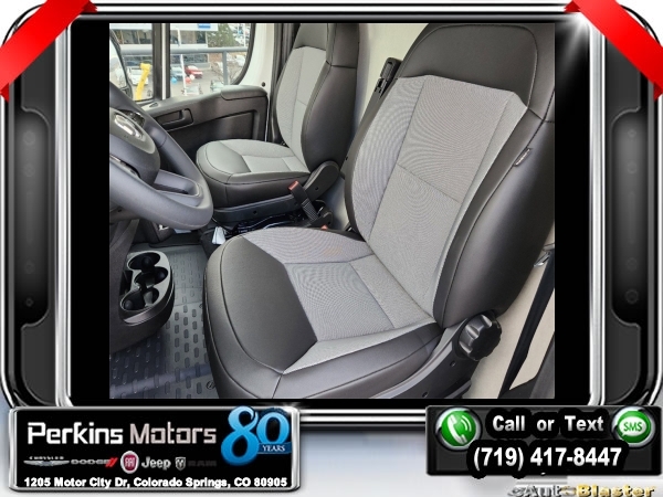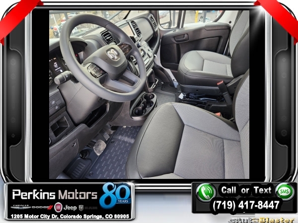 Factory MSRP: $55,665 $6,000 off MSRP! Priced below KBB Fair Purchase Price! Bright White Clearcoat 2024 Ram ProMaster 2500 High Roof FWD 9-Speed 948TE Automatic 3.6L V6 24V VVT<br><br>Check us out at www.perkinsmotors.com to see our specials! Since opening our doors in 1944, we’ve been proud to serve Colorado Springs, CO, and the surrounding areas of Pueblo, Castle Rock and Denver, CO. Throughout this time of being family owned for 80 years, we’ve maintained a firm commitment to our customers: to offer a wide selection of New Chrysler, Dodge, Fiat, Jeep, and Ram vehicles and quality pre-owned vehicles, and provide a quick, no-hassle car-buying process that ensures everyone drives off the lot satisfied with their purchase.<br><br>Convenience Group (Adaptive Cruise Control w/Stop & Go, Exterior Mirrors w/Heating Element, Exterior Mirrors w/Supplemental Signals, Front Fog Lamps, Power Adjust Mirrors, Power Folding/Heated Mirrors, Power-Adjustable Convex Aux Mirrors, Power-Folding Mirrors, and Rear Cargo LED Lamp), Power Group (100 Amp Battery, 115V Auxiliary Power Outlet, and 12V Rear Auxiliary Power Outlet), Quick Order Package 22B Tradesman w/Pass Seat (4-Way Manual Adjust Front Passenger Seat and Passenger Bucket Seat), 4 Speakers, 4-Wheel Disc Brakes, 4.08 Axle Ratio, ABS brakes, Air Conditioning, AM/FM radio: SiriusXM, Apple CarPlay/Android Auto, Black/Gray Seats, Bodyside moldings, Brake assist, Cargo Partition w/Sliding Window, Cloth Bucket Seats, Driver door bin, Driver Seat Armrest, Driver's Seat Mounted Armrest, Electronic Stability Control, Front anti-roll bar, Front Bucket Seats, Front License Plate Bracket, Front reading lights, Front wheel independent suspension, Heavy Duty Suspension, Illuminated entry, Low tire pressure warning, Manufacturer's Statement of Origin, MOPAR Cargo Compartment Floor Mat, Outside temperature display, Overhead airbag, Overhead console, ParkView Rear Back-Up Camera, Passenger door bin, Power steering, Power windows, Radio: Uconnect 5 w/7 Display, Remote keyless entry, Steering wheel mounted audio controls, Tachometer, Telescoping steering wheel, Traction control, Trip computer, Turn signal indicator mirrors, Variably intermittent wipers, Wheel Center Cap, and Wheels: 16 x 6.0 Steel.