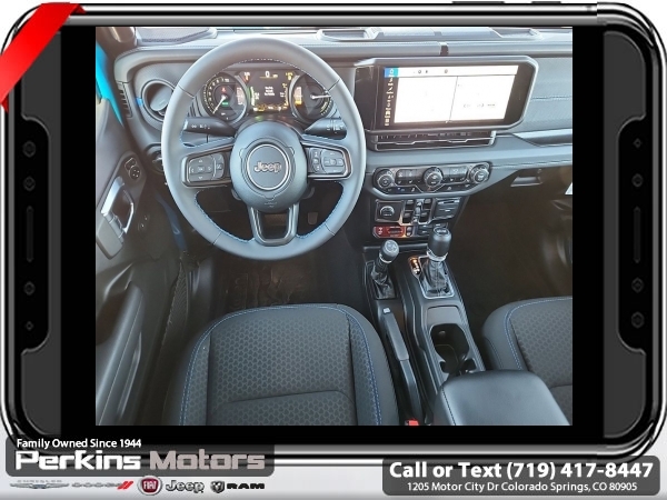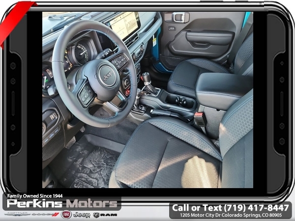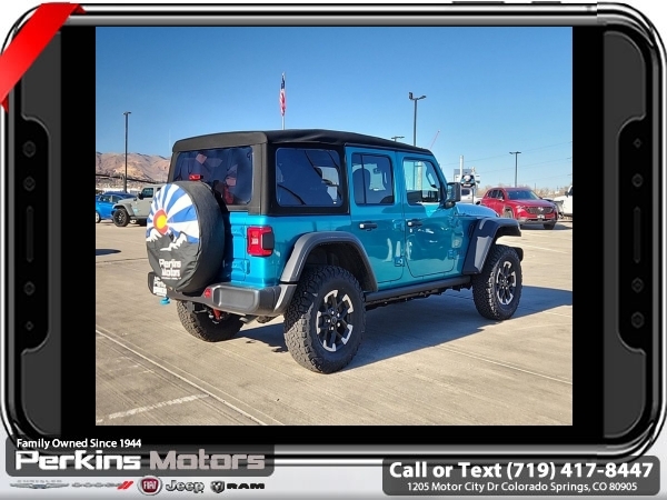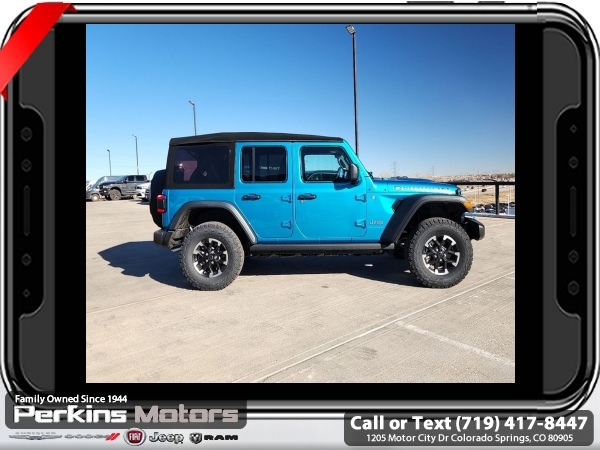 Factory MSRP: $67,645 $17,000 off MSRP! Priced below KBB Fair Purchase Price! Bikini Pearl Coat 2024 Jeep Wrangler Rubicon 4xe 4WD 8-Speed Automatic 2.0L I4 DOHC<br>2.0L I4 DOHC.<br>Check us out at www.perkinsmotors.com to see our specials! Since opening our doors in 1944, we’ve been proud to serve Colorado Springs, CO, and the surrounding areas of Pueblo, Castle Rock and Denver, CO. Throughout this time of being family owned for 80 years, we’ve maintained a firm commitment to our customers: to offer a wide selection of New Chrysler, Dodge, Fiat, Jeep, and Ram vehicles and quality pre-owned vehicles, and provide a quick, no-hassle car-buying process that ensures everyone drives off the lot satisfied with their purchase.<br><br>Convenience Group (Heated Front Seats, Heated Steering Wheel, Remote Start System, and Universal Garage Door Opener), Quick Order Package 29V Rubicon, Technology Group (12.3 Touchscreen Display, 4G LTE Wi-Fi Hot Spot, Alpine Premium Audio System, Apple CarPlay, Auto-Dimming Rear-View Mirror, Connected Travel & Traffic Services, Connectivity - US/Canada, Disassociated Touchscreen Display, Google Android Auto, GPS Navigation, HD Radio, Integrated Center Stack Radio, Integrated Off-Road Camera, Integrated Voice Command w/Bluetooth, Radio: Uconnect 5 Nav w/12.3 Display, SiriusXM Radio Service, and SiriusXM w/360L), 2.0L I4 DOHC, 4-Wheel Disc Brakes, 4.10 Rear Axle Ratio, 8 Speakers, ABS brakes, Air Conditioning, Alloy wheels, AM/FM radio: SiriusXM, Apple CarPlay/Android Auto, Automatic temperature control, Brake assist, Compass, Cruise Control, Delay-off headlights, Driver door bin, Driver vanity mirror, Dual front impact airbags, Dual front side impact airbags, Electronic Stability Control, Front anti-roll bar, Front Bucket Seats, Front Center Armrest w/Storage, Front dual zone A/C, Front fog lights, Front License Plate Bracket, Front reading lights, Fully automatic headlights, Heated door mirrors, Illuminated entry, Integrated roll-over protection, Low tire pressure warning, MOPAR All-Weather Floor Mats, Occupant sensing airbag, Outside temperature display, Overhead airbag, Panic alarm, ParkView Rear Back-Up Camera, Passenger door bin, Passenger vanity mirror, Performance Suspension, Power door mirrors, Power steering, Power windows, Radio data system, Radio: Uconnect 5 w/12.3 Display, Rear anti-roll bar, Rear reading lights, Remote keyless entry, Security system, Split folding rear seat, Steering wheel mounted audio controls, Sustainable Premium Cloth Seats, Tachometer, Telescoping steering wheel, Tilt steering wheel, Traction control, Trip computer, Variably intermittent wipers, Voltmeter, and Wheels: 17 x 7.5 Machined w/Black Pockets. Sale price includes all manufacture's incentives and dealer discounts. Sale price not available on lease or compatible with special APR. $500 - 2024 National Jeep Celebration Event Bonus Cash. Exp. 04/30/2025 $7500 - 2024 National Retail Consumer Cash . Exp. 04/30/2025
