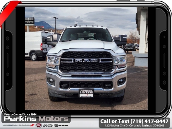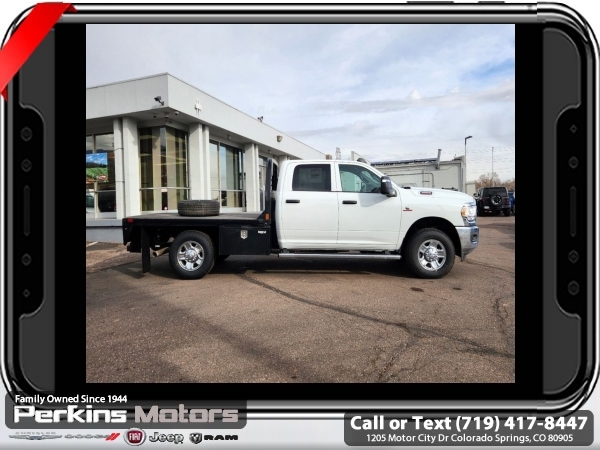 Factory MSRP: $73,175 $6,005 off MSRP! Bright White Clearcoat 2024 Ram 3500 Tradesman 4WD Aisin 6-Speed Automatic Cummins 6.7L I6 Turbodiesel<br>CM FLATBED WITH 2 BOXES.<br>Check us out at www.perkinsmotors.com to see our specials! Since opening our doors in 1944, we’ve been proud to serve Colorado Springs, CO, and the surrounding areas of Pueblo, Castle Rock and Denver, CO. Throughout this time of being family owned for 80 years, we’ve maintained a firm commitment to our customers: to offer a wide selection of New Chrysler, Dodge, Fiat, Jeep, and Ram vehicles and quality pre-owned vehicles, and provide a quick, no-hassle car-buying process that ensures everyone drives off the lot satisfied with their purchase.<br><br>Chrome Appearance Group (Bright Front Bumper, Bright Wheel Skins, Center Hub, Chrome Grille Surround, Chrome Headlamp Bezels, and Matte Black Mesh Grille w/Chrome), Electrical Accessory Group (Voltage Monitoring Auto Idle Up System), Heavy Duty Snow Plow Prep Group, Quick Order Package 2YA Tradesman (Black Exterior Truck Badging, Black Key Fob, Door Sill Scuff Pads, Glove Box, Halogen Quad Headlamps, Map/Courtesy Lamp, Matte Black Grille Surround, Overhead Console, Overhead Cupholder Lamp, and Rear Dome Lamp), 102 mph Maximum Speed, 115V Auxiliary Power Outlet, 3.73 Axle Ratio, 4-Wheel Disc Brakes, 40/20/40 Split Bench Seat, 400W Inverter, 4G LTE Wi-Fi Hot Spot, 6 Speakers, 8.4 Touchscreen Display, ABS brakes, Air Conditioning, All R1 Low Radios, All Radio-Equipped Vehicles, Apple CarPlay, Bluetooth Handsfree Phone & Audio, Compass, Connectivity - US/Canada, Cruise Control, Delay-off headlights, Driver door bin, Dual front impact airbags, Electric Shift-On-The-Fly Transfer Case, Electronic Stability Control, For Details, Visit DriveUconnect.com, For More Info, Call 800-643-2112, Front anti-roll bar, Front Bucket Seats, Front Fog Lamps, Front License Plate Bracket, Fully automatic headlights, Global Telematics Box Module (TBM), Google Android Auto, GPS Antenna Input, HD Vinyl 40/20/40 Split Bench Seat, Heated door mirrors, Integrated Center Stack Radio, Integrated Voice Command w/Bluetooth, Manual Adjust 4-Way Driver Seat, Manual Adjust 4-Way Front Passenger Seat, Manual DPF Regeneration, Manufacturer's Statement of Origin, MOPAR Front & Rear Rubber Floor Mats, Occupant sensing airbag, Outside temperature display, Overhead console, ParkView Rear Back-Up Camera, Passenger door bin, Passenger vanity mirror, Power 2-Way Driver Lumbar Adjust, Power door mirrors, Power steering, Power windows, Radio data system, Radio: Uconnect 3 w/5 Display, Radio: Uconnect 5 w/8.4 Display, Rear anti-roll bar, Rear Backup Alarm, Rear Folding Seat, Rear Sliding Window, Remote Keyless Entry, Remote USB Port - Charge Only, SiriusXM Radio Service, SiriusXM Satellite Radio, Storage Tray, Tachometer, Temperature & Compass Gauge, Tilt steering wheel, Tow Hooks, Traction control, Trailer Brake Control, Trailer Light Check, Tubular Side Steps, Turn signal indicator mirrors, Variably intermittent wipers, Voltmeter, Wheels: 18 x 8.0 Steel, and Wheels: 18 x 8 Steel Chrome ClaD. Sale price includes all manufacture's incentives and dealer discounts. Sale price not available on lease or compatible with special APR. $1500 - 2024 National Stellantis Loyalty Bonus Cash . Exp. 04/30/2025 $2500 - 2024 National Truck Month Bonus Cash. Exp. 04/30/2025 Price includes $9,995 in dealer added accessories.