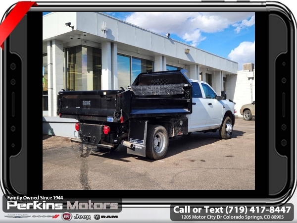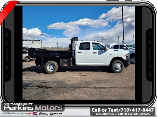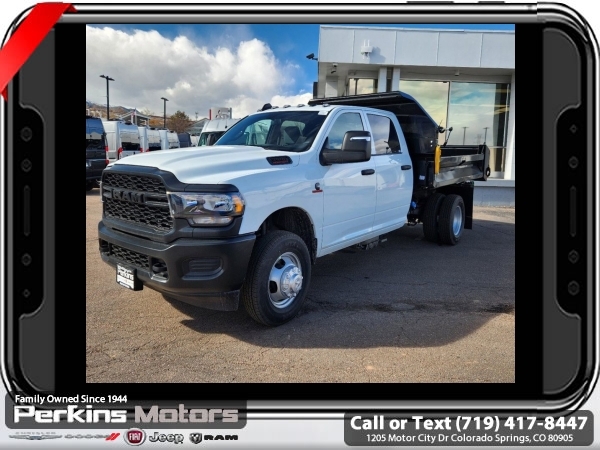 Factory MSRP: $72,090 Bright White Clearcoat 2024 Ram 3500 Tradesman 4WD Aisin 6-Speed Automatic Cummins 6.7L I6 Turbodiesel<br>KNAPHEIDE DUMP BED 12 DROP SIDES 2.5 YARDS.<br>Check us out at www.perkinsmotors.com to see our specials! Since opening our doors in 1944, we’ve been proud to serve Colorado Springs, CO, and the surrounding areas of Pueblo, Castle Rock and Denver, CO. Throughout this time of being family owned for 80 years, we’ve maintained a firm commitment to our customers: to offer a wide selection of New Chrysler, Dodge, Fiat, Jeep, and Ram vehicles and quality pre-owned vehicles, and provide a quick, no-hassle car-buying process that ensures everyone drives off the lot satisfied with their purchase.<br><br>Quick Order Package 2YA Tradesman (Black Exterior Truck Badging, Black Key Fob, Door Sill Scuff Pads, Glove Box, Halogen Quad Headlamps, Map/Courtesy Lamp, Matte Black Grille Surround, Overhead Console, Overhead Cupholder Lamp, and Rear Dome Lamp), 102 mph Maximum Speed, 11.50 Dual Wheels Rear Axle, 115V Auxiliary Power Outlet, 3.73 Axle Ratio, 4-Wheel Disc Brakes, 40/20/40 Split Bench Seat, 400W Inverter, 4G LTE Wi-Fi Hot Spot, 6 Speakers, 6000# Front Axle w/Hub Ext, 8.4 Touchscreen Display, ABS brakes, Air Conditioning, All R1 Low Radios, All Radio-Equipped Vehicles, Apple CarPlay, Bluetooth Handsfree Phone & Audio, Bright Wheel Skins, Center Hub, Compass, Connectivity - US/Canada, Cruise Control, Delay-off headlights, Driver door bin, Dual front impact airbags, Dual Rear Wheels, Electric Shift-On-The-Fly Transfer Case, Electronic Stability Control, Floor Covering Carpet, For Details, Visit DriveUconnect.com, For More Info, Call 800-643-2112, Front & Rear Floor Mats, Front anti-roll bar, Front Bucket Seats, Front License Plate Bracket, Fully automatic headlights, Global Telematics Box Module (TBM), Google Android Auto, GPS Antenna Input, HD Vinyl 40/20/40 Split Bench Seat, Heated door mirrors, Integrated Center Stack Radio, Integrated Voice Command w/Bluetooth, Manual Adjust 4-Way Driver Seat, Manual Adjust 4-Way Front Passenger Seat, Manufacturer's Statement of Origin, Occupant sensing airbag, Outside temperature display, Overhead console, Passenger door bin, Passenger vanity mirror, Power 2-Way Driver Lumbar Adjust, Power door mirrors, Power steering, Power windows, Radio data system, Radio: Uconnect 3 w/5 Display, Radio: Uconnect 5 w/8.4 Display, Rear anti-roll bar, Rear Folding Seat, Remote Keyless Entry, Remote USB Port - Charge Only, SiriusXM Radio Service, SiriusXM Satellite Radio, Storage Tray, Tachometer, Temperature & Compass Gauge, Tilt steering wheel, Tow Hooks, Traction control, Trailer Brake Control, Trailer Light Check, Turn signal indicator mirrors, Variably intermittent wipers, Voltmeter, Wheels: 17 x 6.0 Argent Steel, and Wheels: 18 x 8.0 SteeL. Sale price includes all manufacture's incentives and dealer discounts. Sale price not available on lease or compatible with special APR. $7335 - 2024 National Minimum Employee Pricing Discount . Exp. 06/30/2025 Price includes $18,995 in dealer added accessories.