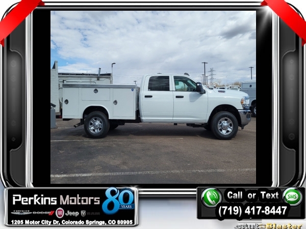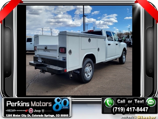 Factory MSRP: $58,655 Bright White Clearcoat 2024 Ram 2500 Tradesman 4WD 8-Speed Automatic 6.4L V8<br>ROYAL SERVICE BODY.<br>Check us out at www.perkinsmotors.com to see our specials! Since opening our doors in 1944, we’ve been proud to serve Colorado Springs, CO, and the surrounding areas of Pueblo, Castle Rock and Denver, CO. Throughout this time of being family owned for 80 years, we’ve maintained a firm commitment to our customers: to offer a wide selection of New Chrysler, Dodge, Fiat, Jeep, and Ram vehicles and quality pre-owned vehicles, and provide a quick, no-hassle car-buying process that ensures everyone drives off the lot satisfied with their purchase.<br><br>Chrome Appearance Group (Bright Front Bumper, Bright Rear Bumper, Center Hub, Chrome Grille Surround, Chrome Headlamp Bezels, Matte Black Mesh Grille w/Chrome, and Wheels: 18 x 8.0 Steel Chrome Clad), Heavy Duty Snow Plow Prep Group (220 Amp Alternator), Quick Order Package 2GA Tradesman, Tradesman Level 1 Equipment Group (Manual Folding Exterior Mirrors and Manual Telescoping Mirrors), 17 x 7.5 Steel Styled Wheels, 2 Way Rear Headrest Seat, 3.73 Axle Ratio, 4 Way Front Headrests, 4-Wheel Disc Brakes, 40/20/40 Split Bench Seat, 4G LTE Wi-Fi Hot Spot, 6 Speakers, 8.4 Touchscreen Display, ABS brakes, Active Noise Control System, Air Conditioning, All R1 Low Radios, All Radio Equipped Vehicles, AM/FM radio, Anti-Spin Differential Rear Axle, Apple CarPlay, Auto Power-Folding Mirrors, Black Exterior Mirrors, Bluetooth Handsfree Phone & Audio, Brake assist, Carpet Floor Covering, Compass, Connectivity - US/Canada, Cruise Control, Dash Pass Thru Wire Circuits, Delay-off headlights, Driver door bin, Dual front impact airbags, Dual front side impact airbags, Electric Shift-On-The-Fly Transfer Case, Electronic Stability Control, Electronically Controlled Throttle, Emergency communication system: SiriusXM Guardian, Exterior Mirrors Courtesy Lamps, Exterior Mirrors w/Heating Element, Exterior Mirrors w/Supplemental Signals, For Details, Visit DriveUconnect.com, For More Info, Call 800-643-2112, Forward & Reverse Utility Lights, Front & Rear Floor Mats, Front anti-roll bar, Front Center Armrest w/Storage, Front License Plate Bracket, Front reading lights, Fully automatic headlights, Global Telematics Box Module (TBM), Google Android Auto, GPS Antenna Input, Heavy Duty Vinyl 40/20/40 Split Bench Seat, I/P Mounted Auxiliary Switches, Illuminated entry, Integrated Center Stack Radio, Integrated Voice Command w/Bluetooth, Low tire pressure warning, Manual Adjust 4-Way Driver Seat, Manufacturer's Statement of Origin, Mirror Running Lights, Occupant sensing airbag, Outside temperature display, Overhead airbag, Overhead console, ParkView Rear Back-Up Camera, Passenger door bin, Passenger vanity mirror, Power Adjust Mirrors, Power Adjustable Convex Aux Mirrors, Power Heated Fold Telescope Mirrors, Power steering, Power Telescoping Mirrors, Power windows, Radio data system, Radio: Uconnect 3 w/5 Display, Radio: Uconnect 5 W w/8.4 Display, Rear anti-roll bar, Rear Folding Seat, Rear step bumper, Selectable Tire Fill Alert, SiriusXM Radio Service, SiriusXM Satellite Radio, Storage Tray, Tachometer, Tilt steering wheel, Tip Start, Tow Hooks, Traction control, Trailer Brake Control, Trailer Light Check, Variably intermittent wipers, and VoltmeteR. Sale price includes all manufacture's incentives and dealer discounts. Sale price not available on lease or compatible with special APR. $1000 - 2024 Bonus Cash . Exp. 12/02/2024 $2000 - 2024 West BC Bonus Cash . Exp. 12/02/2024 $500 - Exp. 01/02/2025 Price includes $13,995 in dealer added accessories.