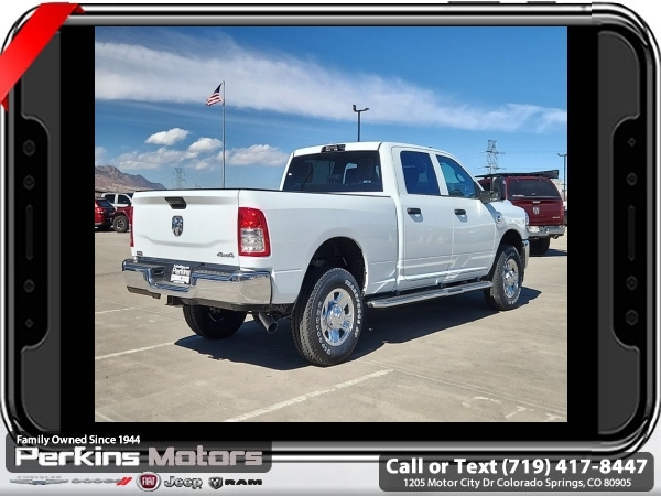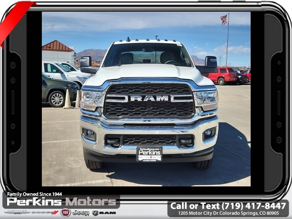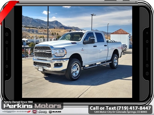 Factory MSRP: $75,455 $14,559 off MSRP! Bright White Clearcoat 2024 Ram 2500 Tradesman 4WD 6-Speed Automatic Cummins 6.7L I6 Turbodiesel<br><br>Check us out at www.perkinsmotors.com to see our specials! Since opening our doors in 1944, we’ve been proud to serve Colorado Springs, CO, and the surrounding areas of Pueblo, Castle Rock and Denver, CO. Throughout this time of being family owned for 80 years, we’ve maintained a firm commitment to our customers: to offer a wide selection of New Chrysler, Dodge, Fiat, Jeep, and Ram vehicles and quality pre-owned vehicles, and provide a quick, no-hassle car-buying process that ensures everyone drives off the lot satisfied with their purchase.<br><br>Chrome Appearance Group (Bright Front Bumper, Center Hub, Chrome Grille Surround, Chrome Headlamp Bezels, Matte Black Mesh Grille w/Chrome, and Wheels: 18 x 8.0 Steel Chrome Clad), Convenience Group (Air Conditioning ATC w/Dual Zone Control and Auto-Dimming Rear-View Mirror), Protection Group (Tow Hooks), Quick Order Package 2HA Tradesman, Snow Chief Group (Anti-Spin Differential Rear Axle, Auxiliary Switches Prep, Clearance Lamps, Dash Pass Thru Wire Circuits, and I/P Mounted Auxiliary Switches), Tradesman Level 1 Equipment Group (Manual Folding Exterior Mirrors and Manual Telescoping Mirrors), 115V Auxiliary Front Power Outlet, 17 x 7.5 Steel Styled Wheels, 2 Way Rear Headrest Seat, 220 Amp Alternator, 3.73 Axle Ratio, 4 Way Front Headrests, 4-Wheel Disc Brakes, 40/20/40 Split Bench Seat, 4G LTE Wi-Fi Hot Spot, 5th Wheel/Gooseneck Towing Prep Group, 6 Speakers, 8.4 Touchscreen Display, ABS brakes, Active Noise Control System, Air Conditioning, Alexa Built-In, All R1 High Radios, All Radio Equipped Vehicles, AM/FM radio, Apple CarPlay, Auto Power-Folding Mirrors, Black Exterior Mirrors, Brake assist, Chrome Flat Wheel-to-Wheel Side Steps, Compass, Connected Travel & Traffic Services, Connectivity - US/Canada, Cruise Control, CTR Stop Lamp w/Cargo View Camera, Delay-off headlights, Disassociated Touchscreen Display, Driver door bin, Dual Alternators Rated At 440 Amps, Dual front impact airbags, Dual front side impact airbags, Electric Shift-On-The-Fly Transfer Case, Electronic Stability Control, Electronically Controlled Throttle, Emergency communication system: SiriusXM Guardian, Exterior 115V AC Outlet, Exterior Mirrors Courtesy Lamps, Exterior Mirrors w/Heating Element, Exterior Mirrors w/Supplemental Signals, For Details, Visit DriveUconnect.com, For More Info, Call 800-643-2112, Forward & Reverse Utility Lights, Front anti-roll bar, Front Center Armrest w/Storage, Front License Plate Bracket, Front reading lights, Fully automatic headlights, Global Telematics Box Module (TBM), Google Android Auto, GPS Antenna Input, HD Radio, Heavy Duty Vinyl 40/20/40 Split Bench Seat, Illuminated entry, Integrated Center Stack Radio, Integrated Voice Command w/Bluetooth, Low tire pressure warning, Manual Adjust 4-Way Driver Seat, Manufacturer's Statement of Origin, Mirror Running Lights, MOPAR Front & Rear Rubber Floor Mats, MOPAR Spray In Bedliner, Occupant sensing airbag, Off-Road Information Pages, Outside temperature display, Overhead airbag, Overhead console, ParkSense Rear Park Assist System, ParkView Rear Back-Up Camera, Passenger door bin, Passenger vanity mirror, Power Adjust Mirrors, Power Adjustable Convex Aux Mirrors, Power Heated Fold Telescope Mirrors, Power steering, Power Telescoping Mirrors, Power windows, Radio data system, Radio: Uconnect 3 w/5 Display, Radio: Uconnect 5 Nav w/8.4 Display, Rear anti-roll bar, Rear Folding Seat, Rear step bumper, Rear Wheelhouse Liners, Selectable Tire Fill Al Sale price includes all manufacture's incentives and dealer discounts. Sale price not available on lease or compatible with special APR. $1000 - 2024West BC Trade Assist Bonus Cash. Exp. 06/30/2025 $1500 - 2024 National Stellantis Loyalty Bonus Cash . Exp. 06/30/2025 $6019 - 2024 National Minimum Employee Pricing Discount . Exp. 0
