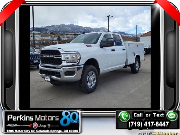 Factory MSRP: $58,655 Bright White Clearcoat 2024 Ram 2500 Tradesman 4WD 8-Speed Automatic 6.4L V8<br>ROYAL SERVICE BODY.<br>Check us out at www.perkinsmotors.com to see our specials! Since opening our doors in 1944, we’ve been proud to serve Colorado Springs, CO, and the surrounding areas of Pueblo, Castle Rock and Denver, CO. Throughout this time of being family owned for 80 years, we’ve maintained a firm commitment to our customers: to offer a wide selection of New Chrysler, Dodge, Fiat, Jeep, and Ram vehicles and quality pre-owned vehicles, and provide a quick, no-hassle car-buying process that ensures everyone drives off the lot satisfied with their purchase.<br><br>Chrome Appearance Group (Bright Front Bumper, Bright Rear Bumper, Center Hub, Chrome Grille Surround, Chrome Headlamp Bezels, Matte Black Mesh Grille w/Chrome, and Wheels: 18 x 8.0 Steel Chrome Clad), Heavy Duty Snow Plow Prep Group (220 Amp Alternator), Quick Order Package 2GA Tradesman, Tradesman Level 1 Equipment Group (Manual Folding Exterior Mirrors and Manual Telescoping Mirrors), 17 x 7.5 Steel Styled Wheels, 2 Way Rear Headrest Seat, 3.73 Axle Ratio, 4 Way Front Headrests, 4-Wheel Disc Brakes, 40/20/40 Split Bench Seat, 4G LTE Wi-Fi Hot Spot, 6 Speakers, 8.4 Touchscreen Display, ABS brakes, Active Noise Control System, Air Conditioning, All R1 Low Radios, All Radio Equipped Vehicles, AM/FM radio, Anti-Spin Differential Rear Axle, Apple CarPlay, Auto Power-Folding Mirrors, Black Exterior Mirrors, Bluetooth Handsfree Phone & Audio, Brake assist, Carpet Floor Covering, Compass, Connectivity - US/Canada, Cruise Control, Dash Pass Thru Wire Circuits, Delay-off headlights, Driver door bin, Dual front impact airbags, Dual front side impact airbags, Electric Shift-On-The-Fly Transfer Case, Electronic Stability Control, Electronically Controlled Throttle, Emergency communication system: SiriusXM Guardian, Exterior Mirrors Courtesy Lamps, Exterior Mirrors w/Heating Element, Exterior Mirrors w/Supplemental Signals, For Details, Visit DriveUconnect.com, For More Info, Call 800-643-2112, Forward & Reverse Utility Lights, Front & Rear Floor Mats, Front anti-roll bar, Front Center Armrest w/Storage, Front License Plate Bracket, Front reading lights, Fully automatic headlights, Global Telematics Box Module (TBM), Google Android Auto, GPS Antenna Input, Heavy Duty Vinyl 40/20/40 Split Bench Seat, I/P Mounted Auxiliary Switches, Illuminated entry, Integrated Center Stack Radio, Integrated Voice Command w/Bluetooth, Low tire pressure warning, Manual Adjust 4-Way Driver Seat, Manufacturer's Statement of Origin, Mirror Running Lights, Occupant sensing airbag, Outside temperature display, Overhead airbag, Overhead console, ParkView Rear Back-Up Camera, Passenger door bin, Passenger vanity mirror, Power Adjust Mirrors, Power Adjustable Convex Aux Mirrors, Power Heated Fold Telescope Mirrors, Power steering, Power Telescoping Mirrors, Power windows, Radio data system, Radio: Uconnect 3 w/5 Display, Radio: Uconnect 5 W w/8.4 Display, Rear anti-roll bar, Rear Folding Seat, Rear step bumper, Selectable Tire Fill Alert, SiriusXM Radio Service, SiriusXM Satellite Radio, Storage Tray, Tachometer, Tilt steering wheel, Tip Start, Tow Hooks, Traction control, Trailer Brake Control, Trailer Light Check, Variably intermittent wipers, and VoltmeteR. Sale price includes all manufacture's incentives and dealer discounts. Sale price not available on lease or compatible with special APR. $2000 - 2024 Denver BC Bonus Cash . Exp. 07/01/2024 $2000 - 2024 Denver BC Commercial Bonus Cash. Exp. 07/01/2024 Price includes $13,995 in dealer added accessories.