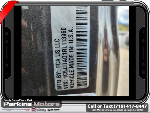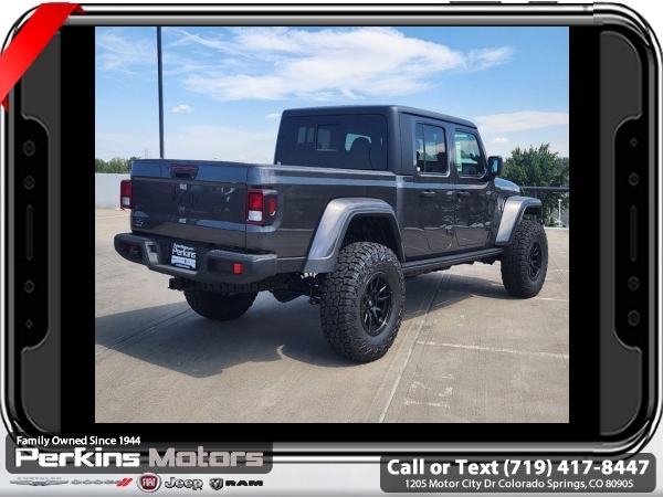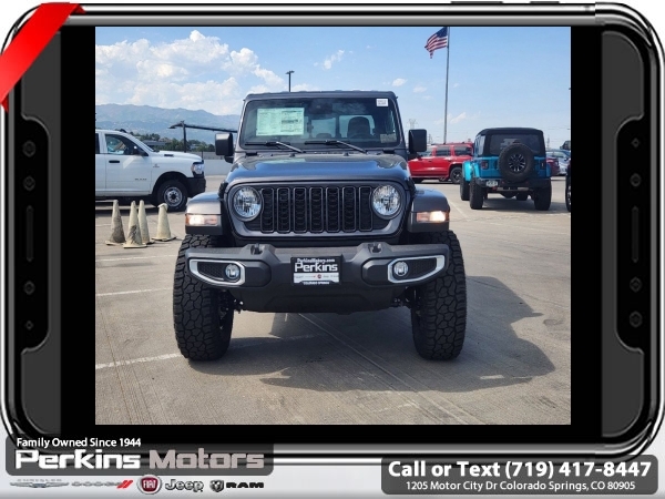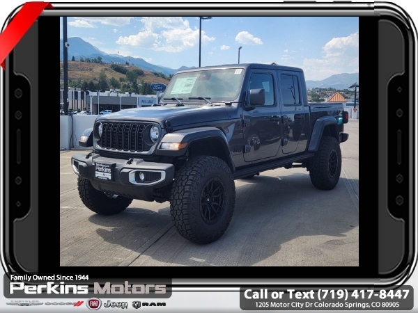 Factory MSRP: $53,045 $4,388 off MSRP! Granite Crystal Metallic Clearcoat 2024 Jeep Gladiator Sport 4WD 8-Speed Automatic 3.6L V6 24V VVT<br>Lift, Tires, Rims, Tent, Etc...<br>Check us out at www.perkinsmotors.com to see our specials! Since opening our doors in 1944, we’ve been proud to serve Colorado Springs, CO, and the surrounding areas of Pueblo, Castle Rock and Denver, CO. Throughout this time of being family owned for 80 years, we’ve maintained a firm commitment to our customers: to offer a wide selection of New Chrysler, Dodge, Fiat, Jeep, and Ram vehicles and quality pre-owned vehicles, and provide a quick, no-hassle car-buying process that ensures everyone drives off the lot satisfied with their purchase.<br><br>Max Tow Package w/4.10 Axle Ratio (110 MPH Vehicle Max Speed Calibration, 240 Amp Alternator, 4.10 Rear Axle Ratio, Anti-Spin Differential Rear Axle, Black Molded-In-Color Fender Flares (2-Piece), Dana M210 Wide Front Axle, and Daytime Running Lamp System), Quick Order Package 24S Sport S (Deep Tint Sunscreen Windows, Front 1-Touch Down Power Windows, Full Speed Forward Collision Warning Plus, Power Heated Mirrors, Premium Wrapped Steering Wheel, Sun Visors w/Illuminated Vanity Mirrors, and Wheels: 17 x 7.5 Gray), Trailer Tow & Aux Switch Group (Heavy-Duty Engine Cooling and Trailer Hitch Zoom), 12.3 Touchscreen Display, 3.73 Rear Axle Ratio, 4-Wheel Disc Brakes, 4G LTE Wi-Fi Hot Spot, 8 Speakers, ABS brakes, Air Conditioning, Alexa Built-In, AM/FM radio: SiriusXM with 360L, Apple CarPlay, Apple CarPlay/Android Auto, Black 3-Piece Hard Top, Brake assist, Cloth Low-Back Bucket Seats, Compass, Connectivity - US/Canada, Cruise Control, Delay-off headlights, Disassociated Touchscreen Display, Driver door bin, Driver vanity mirror, Dual front impact airbags, Dual front side impact airbags, Electronic Stability Control, Emergency communication system: Jeep Connect, Front anti-roll bar, Front Bucket Seats, Front Center Armrest w/Storage, Front fog lights, Front License Plate Bracket, Front reading lights, Google Android Auto, Integrated Center Stack Radio, Integrated roll-over protection, Low tire pressure warning, Manufacturer's Statement of Origin (DISC), MOPAR All-Weather Slush Mats, MOPAR Spray In Bedliner, Normal Duty Suspension, Occupant sensing airbag, Outside temperature display, Overhead airbag, ParkView Rear Back-Up Camera, Passenger door bin, Passenger vanity mirror, Power steering, Radio data system, Radio: Uconnect 5 w/12.3 Display, Rear anti-roll bar, Rear reading lights, Rear Sliding Window, SiriusXM Radio Service, SiriusXM w/360L, Split folding rear seat, Steering wheel mounted audio controls, Tachometer, Telescoping steering wheel, Tilt steering wheel, Traction control, Trip computer, Variably intermittent wipers, Voltmeter, and Wheels: 17 x 7.5 Black Steel Styled. Sale price includes all manufacture's incentives and dealer discounts. Sale price not available on lease or compatible with special APR. $3109 - 2024 National Minimum Employee Pricing Discount . Exp. 06/30/2025 $5000 - 2024 Bonus Cash . Exp. 06/30/2025 Price includes $13,995 in dealer added accessories.