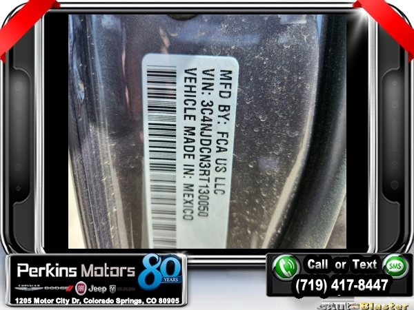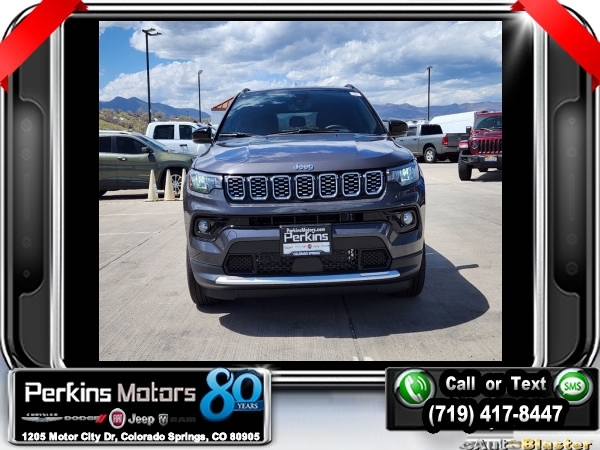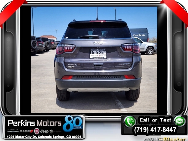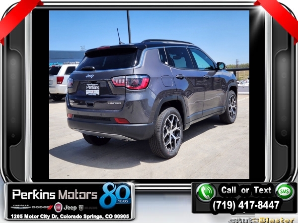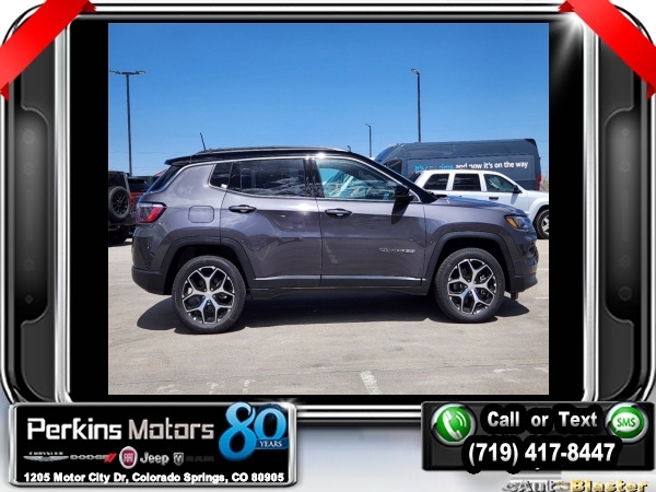 Factory MSRP: $35,935 $2,735 off MSRP! Priced below KBB Fair Purchase Price! Baltic Gray Metallic Clearcoat 2024 Jeep Compass Limited 4WD 8-Speed Automatic 2.0L I4 DOHC<br>4WD.<br>Check us out at www.perkinsmotors.com to see our specials! Since opening our doors in 1944, we’ve been proud to serve Colorado Springs, CO, and the surrounding areas of Pueblo, Castle Rock and Denver, CO. Throughout this time of being family owned for 80 years, we’ve maintained a firm commitment to our customers: to offer a wide selection of New Chrysler, Dodge, Fiat, Jeep, and Ram vehicles and quality pre-owned vehicles, and provide a quick, no-hassle car-buying process that ensures everyone drives off the lot satisfied with their purchase.<br><br>Quick Order Package 29G Limited, 4WD, 10.1 Touchscreen Display, 3.73 Final Drive Ratio, 4-Wheel Disc Brakes, 4G LTE Wi-Fi Hot Spot, 6 Speakers, ABS brakes, Air Conditioning, Alloy wheels, AM/FM radio: SiriusXM, Auto High-beam Headlights, Auto-dimming Rear-View mirror, Automatic temperature control, Brake assist, Bumpers: body-color, Compass, Cruise Control, Delay-off headlights, Disassociated Touchscreen Display, Driver door bin, Driver vanity mirror, Dual front impact airbags, Dual front side impact airbags, Electronic Stability Control, Emergency communication system: Jeep Connect, For Details, Visit DriveUconnect.com, For More Info, Call 800-643-2112, Four wheel independent suspension, Front anti-roll bar, Front Bucket Seats, Front Center Armrest w/Storage, Front dual zone A/C, Front fog lights, Front License Plate Bracket, Front reading lights, Fully automatic headlights, Global Telematics Box Module (TBM), Heated door mirrors, Heated front seats, Heated steering wheel, Illuminated entry, Knee airbag, Leather Shift Knob, Leather steering wheel, Leatherette Seats, Low tire pressure warning, Occupant sensing airbag, Outside temperature display, Overhead airbag, Overhead console, Panic alarm, ParkView Rear Back-Up Camera, Passenger door bin, Passenger vanity mirror, Power door mirrors, Power driver seat, Power steering, Power windows, Radio: Uconnect 5 w/10.1 Display, Rain sensing wipers, Rear anti-roll bar, Rear seat center armrest, Rear window defroster, Rear window wiper, Remote keyless entry, Roof rack: rails only, Security system, SiriusXM Guardian - Included Trial (B), SiriusXM Radio Service, Split folding rear seat, Spoiler, Steering wheel mounted audio controls, Tachometer, Telescoping steering wheel, Tilt steering wheel, Traction control, Trip computer, Turn signal indicator mirrors, Variably intermittent wipers, and Wheels: 18 x 7 Painted Diamond Cut AluminuM.<br><br>24/32 City/Highway MPG Sale price includes all manufacture's incentives and dealer discounts. Sale price not available on lease or compatible with special APR. $1000 - 2024 Denver BC Bonus Cash . Exp. 07/01/2024 $500 - 2024 National Retail Consumer Cash . Exp. 07/01/2024
