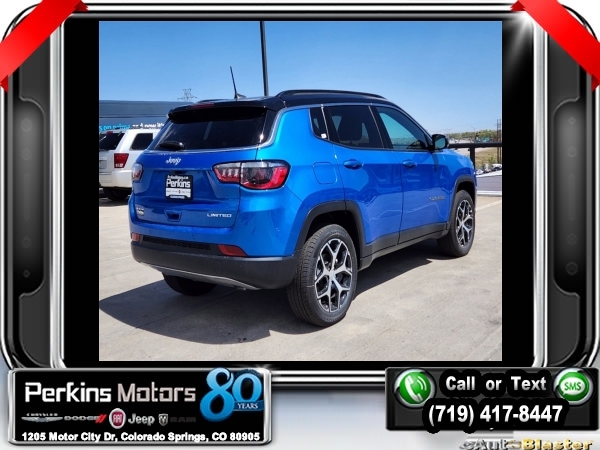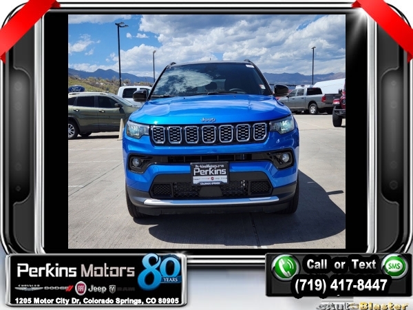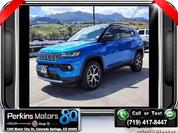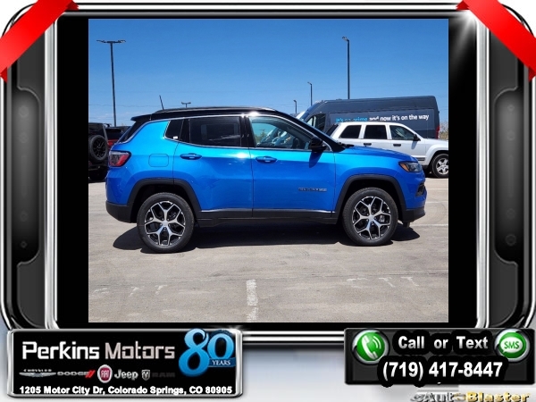 Factory MSRP: $35,935 $6,000 off MSRP! Priced below KBB Fair Purchase Price! Hydro Blue Pearlcoat 2024 Jeep Compass Limited 4WD 8-Speed Automatic 2.0L I4 DOHC<br>4WD.<br>Check us out at www.perkinsmotors.com to see our specials! Since opening our doors in 1944, we’ve been proud to serve Colorado Springs, CO, and the surrounding areas of Pueblo, Castle Rock and Denver, CO. Throughout this time of being family owned for 80 years, we’ve maintained a firm commitment to our customers: to offer a wide selection of New Chrysler, Dodge, Fiat, Jeep, and Ram vehicles and quality pre-owned vehicles, and provide a quick, no-hassle car-buying process that ensures everyone drives off the lot satisfied with their purchase.<br><br>Quick Order Package 29G Limited, 4WD, 10.1 Touchscreen Display, 3.73 Final Drive Ratio, 4-Wheel Disc Brakes, 4G LTE Wi-Fi Hot Spot, 6 Speakers, ABS brakes, Air Conditioning, Alloy wheels, AM/FM radio: SiriusXM, Auto High-beam Headlights, Auto-dimming Rear-View mirror, Automatic temperature control, Brake assist, Bumpers: body-color, Compass, Cruise Control, Delay-off headlights, Disassociated Touchscreen Display, Driver door bin, Driver vanity mirror, Dual front impact airbags, Dual front side impact airbags, Electronic Stability Control, Emergency communication system: Jeep Connect, For Details, Visit DriveUconnect.com, For More Info, Call 800-643-2112, Four wheel independent suspension, Front anti-roll bar, Front Bucket Seats, Front Center Armrest w/Storage, Front dual zone A/C, Front fog lights, Front License Plate Bracket, Front reading lights, Fully automatic headlights, Global Telematics Box Module (TBM), Heated door mirrors, Heated front seats, Heated steering wheel, Illuminated entry, Knee airbag, Leather Shift Knob, Leather steering wheel, Leatherette Seats, Low tire pressure warning, Occupant sensing airbag, Outside temperature display, Overhead airbag, Overhead console, Panic alarm, ParkView Rear Back-Up Camera, Passenger door bin, Passenger vanity mirror, Power door mirrors, Power driver seat, Power steering, Power windows, Radio: Uconnect 5 w/10.1 Display, Rain sensing wipers, Rear anti-roll bar, Rear seat center armrest, Rear window defroster, Rear window wiper, Remote keyless entry, Roof rack: rails only, Security system, SiriusXM Guardian - Included Trial (B), SiriusXM Radio Service, Split folding rear seat, Spoiler, Steering wheel mounted audio controls, Tachometer, Telescoping steering wheel, Tilt steering wheel, Traction control, Trip computer, Turn signal indicator mirrors, Variably intermittent wipers, and Wheels: 18 x 7 Painted Diamond Cut AluminuM.<br><br>24/32 City/Highway MPG Sale price includes all manufacture's incentives and dealer discounts. Sale price not available on lease or compatible with special APR. $1000 - 2024 JR Denver BC Bonus Cash DECRA. Exp. 06/03/2024 $1500 - 2024 JR Chrysler Capital Bonus Cash DECR5. Exp. 06/03/2024 $500 - 2024 DJR National Retail Consumer Cash 24CR1. Exp. 06/03/2024