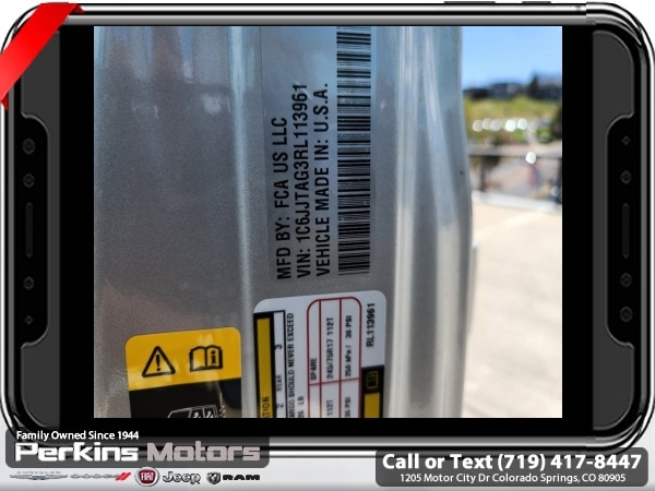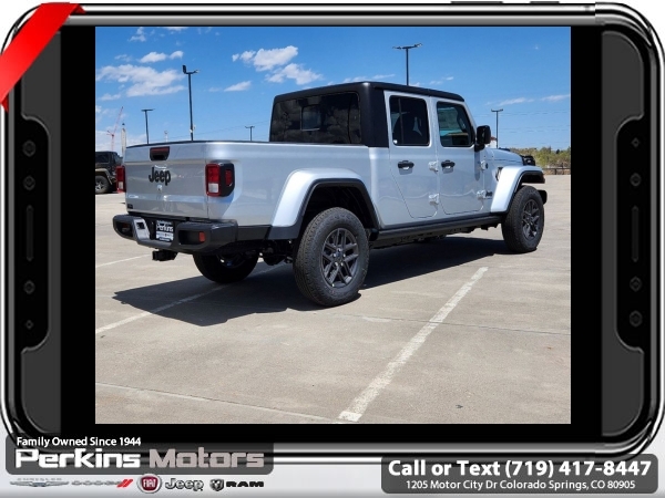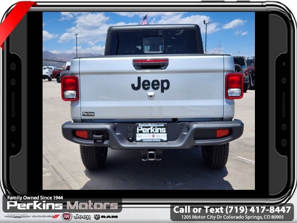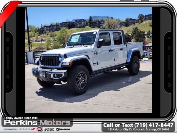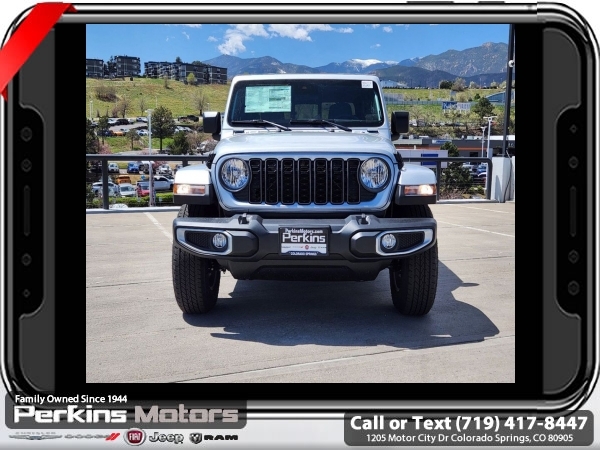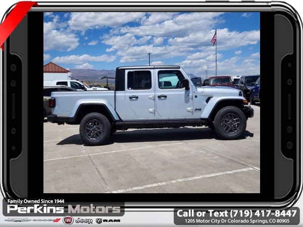 Factory MSRP: $53,045 $15,274 off MSRP! Priced below KBB Fair Purchase Price! Silver Zynith Clearcoat 2024 Jeep Gladiator Sport 4WD 8-Speed Automatic 3.6L V6 24V VVT<br><br>Check us out at www.perkinsmotors.com to see our specials! Since opening our doors in 1944, we’ve been proud to serve Colorado Springs, CO, and the surrounding areas of Pueblo, Castle Rock and Denver, CO. Throughout this time of being family owned for 80 years, we’ve maintained a firm commitment to our customers: to offer a wide selection of New Chrysler, Dodge, Fiat, Jeep, and Ram vehicles and quality pre-owned vehicles, and provide a quick, no-hassle car-buying process that ensures everyone drives off the lot satisfied with their purchase.<br><br>Max Tow Package w/4.10 Axle Ratio (110 MPH Vehicle Max Speed Calibration, 240 Amp Alternator, 4.10 Rear Axle Ratio, Anti-Spin Differential Rear Axle, Black Molded-In-Color Fender Flares (2-Piece), Class IV Receiver Hitch, Conventional Differential Front Axle, Dana M210 Wide Front Axle, Dana M220 Wide Rear Axle, and Daytime Running Lamp System), Quick Order Package 24S Sport S (Advanced Brake Assist, Automatic Headlamps, Body Color Fender Flares (2-Piece), Deep Tint Sunscreen Windows, Enhanced Adaptive Cruise Control, Front 1-Touch Down Power Windows, Full Speed Forward Collision Warning Plus, Normal Duty Plus Suspension, Power Heated Mirrors, Power Tailgate Lock, Premium Wrapped Steering Wheel, Remote Keyless Entry, Security Alarm, Speed Sensitive Power Locks, Sun Visors w/Illuminated Vanity Mirrors, and Wheels: 17 x 7.5 Gray), Trailer Tow & Aux Switch Group (Auxiliary Switches, Heavy-Duty Engine Cooling, and Trailer Hitch Zoom), 12.3 Touchscreen Display, 3.73 Rear Axle Ratio, 4-Wheel Disc Brakes, 4G LTE Wi-Fi Hot Spot, 8 Speakers, ABS brakes, Air Conditioning, Alexa Built-In, AM/FM radio: SiriusXM with 360L, Apple CarPlay, Apple CarPlay/Android Auto, Black 3-Piece Hard Top, Brake assist, Cloth Low-Back Bucket Seats, Compass, Connectivity - US/Canada, Cruise Control, Delay-off headlights, Disassociated Touchscreen Display, Driver door bin, Driver vanity mirror, Dual front impact airbags, Dual front side impact airbags, Electronic Stability Control, Emergency communication system: Jeep Connect, Freedom Panel Storage Bag, Front anti-roll bar, Front Bucket Seats, Front Center Armrest w/Storage, Front fog lights, Front License Plate Bracket, Front reading lights, Google Android Auto, Integrated Center Stack Radio, Integrated roll-over protection, Low tire pressure warning, Manufacturer's Statement of Origin (DISC), MOPAR All-Weather Slush Mats, MOPAR Spray In Bedliner, Normal Duty Suspension, Occupant sensing airbag, Outside temperature display, Overhead airbag, ParkView Rear Back-Up Camera, Passenger door bin, Passenger vanity mirror, Power steering, Radio data system, Radio: Uconnect 5 w/12.3 Display, Rear anti-roll bar, Rear reading lights, Rear Sliding Window, Rear Window Defroster, SiriusXM Radio Service, SiriusXM w/360L, Split folding rear seat, Steering wheel mounted audio controls, Tachometer, Telescoping steering wheel, Tilt steering wheel, Traction control, Trip computer, USB Host Flip, Variably intermittent wipers, Voltmeter, and Wheels: 17 x 7.5 Black Steel Styled. Sale price includes all manufacture's incentives and dealer discounts. Sale price not available on lease or compatible with special APR. $5000 - 2024 Bonus Cash . Exp. 06/30/2025
