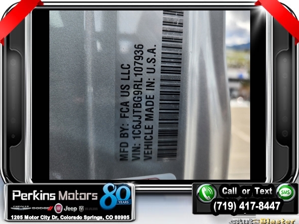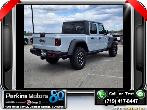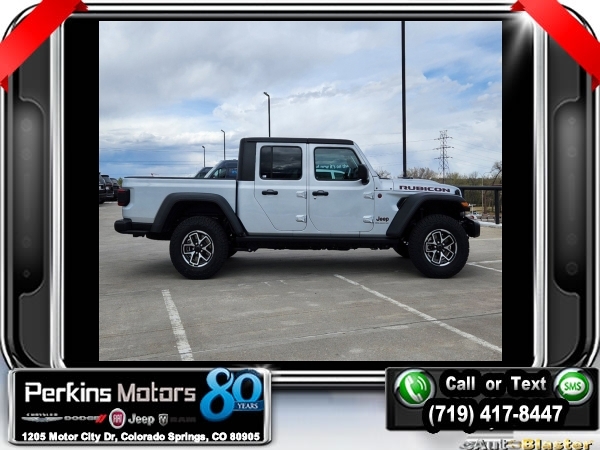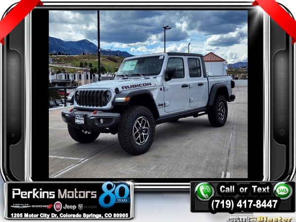 Factory MSRP: $61,400 $10,000 off MSRP! Priced below KBB Fair Purchase Price! Silver Zynith Clearcoat 2024 Jeep Gladiator Rubicon 4WD 8-Speed Automatic 3.6L V6 24V VVT<br><br>Check us out at www.perkinsmotors.com to see our specials! Since opening our doors in 1944, we’ve been proud to serve Colorado Springs, CO, and the surrounding areas of Pueblo, Castle Rock and Denver, CO. Throughout this time of being family owned for 80 years, we’ve maintained a firm commitment to our customers: to offer a wide selection of New Chrysler, Dodge, Fiat, Jeep, and Ram vehicles and quality pre-owned vehicles, and provide a quick, no-hassle car-buying process that ensures everyone drives off the lot satisfied with their purchase.<br><br>Convenience Group (Heated Front Seats, Remote Start System, SiriusXM Radio Service, SiriusXM w/360L, and Universal Garage Door Opener), Quick Order Package 24R Rubicon, 12.3 Touchscreen Display, 4-Wheel Disc Brakes, 4.10 Rear Axle Ratio, 4G LTE Wi-Fi Hot Spot, 8 Speakers, 97 MPH Vehicle Max Speed Calibration, ABS brakes, Air Conditioning, Alexa Built-In, Alloy wheels, AM/FM radio: SiriusXM with 360L, Apple CarPlay, Apple CarPlay/Android Auto, Automatic temperature control, Black 3-Piece Hard Top, Brake assist, Cloth Low-Back Bucket Seats, Compass, Connectivity - US/Canada, Cruise Control, Delay-off headlights, Driver door bin, Driver vanity mirror, Dual front impact airbags, Dual front side impact airbags, Electronic Stability Control, Emergency communication system: Jeep Connect, Front anti-roll bar, Front Bucket Seats, Front Center Armrest w/Storage, Front dual zone A/C, Front fog lights, Front License Plate Bracket, Front reading lights, Fully automatic headlights, Google Android Auto, Heated door mirrors, Illuminated entry, Integrated Center Stack Radio, Integrated roll-over protection, Low tire pressure warning, Manufacturer's Statement of Origin (DISC), MOPAR All-Weather Slush Mats, MOPAR Spray In Bedliner, Occupant sensing airbag, Outside temperature display, Overhead airbag, Panic alarm, Passenger door bin, Passenger vanity mirror, Performance Suspension, Power door mirrors, Power steering, Power windows, Radio data system, Radio: Uconnect 5 w/12.3 Display, Rear anti-roll bar, Rear reading lights, Remote keyless entry, Security system, Split folding rear seat, Steering wheel mounted audio controls, Tachometer, Telescoping steering wheel, Tilt steering wheel, Traction control, Trip computer, Variably intermittent wipers, Voltmeter, and Wheels: 17 x 7.5 Machined/Painted Black. Sale price includes all manufacture's incentives and dealer discounts. Sale price not available on lease or compatible with special APR. $3250 - 2024 Bonus Cash . Exp. 09/03/2024 $2,000 - Exp. 09/03/2024
