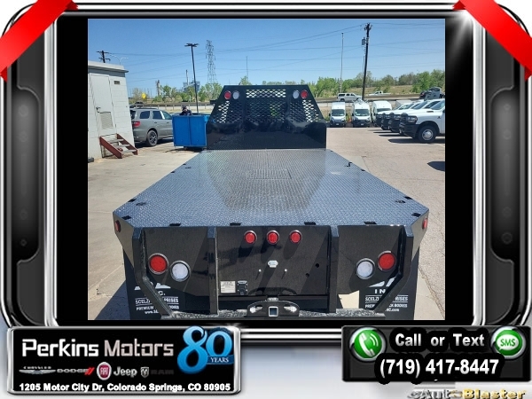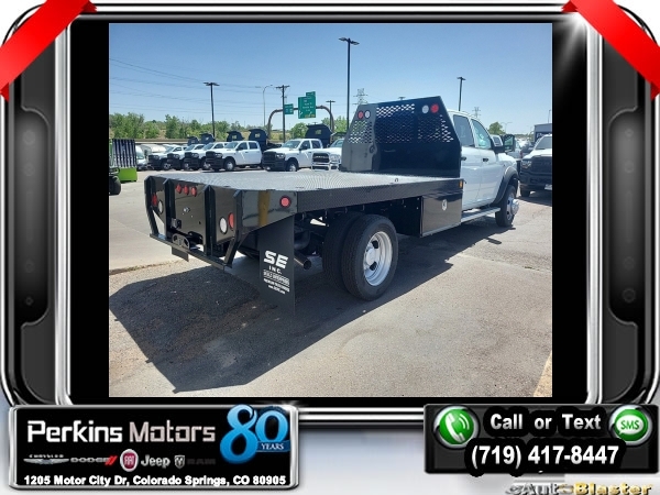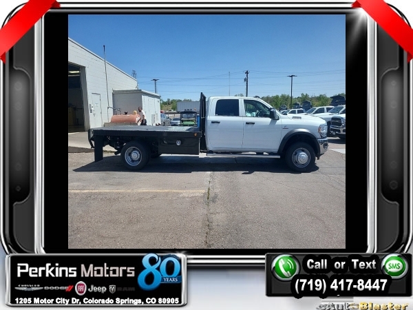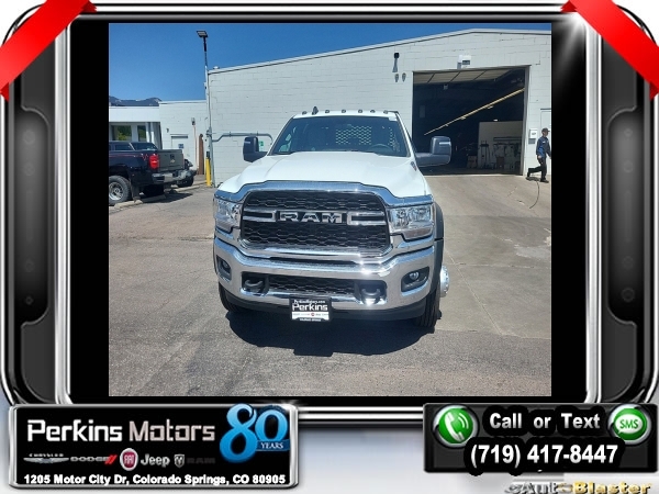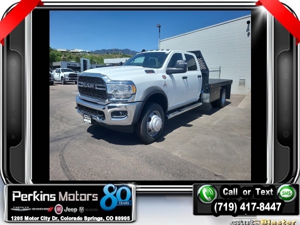 Factory MSRP: $80,695 Bright White Clearcoat 2024 Ram 5500HD Tradesman 4WD Aisin 6-Speed Automatic Cummins 6.7L I6 Turbodiesel<br>SCELZI FRONTRANGE FLATBED WITH TWO UNDERBODY BOXES.<br>Check us out at www.perkinsmotors.com to see our specials! Since opening our doors in 1944, we’ve been proud to serve Colorado Springs, CO, and the surrounding areas of Pueblo, Castle Rock and Denver, CO. Throughout this time of being family owned for 80 years, we’ve maintained a firm commitment to our customers: to offer a wide selection of New Chrysler, Dodge, Fiat, Jeep, and Ram vehicles and quality pre-owned vehicles, and provide a quick, no-hassle car-buying process that ensures everyone drives off the lot satisfied with their purchase.<br><br>Chrome Appearance Group (Bright Front Bumper, Center Hub, Chrome Grille Surround, and Matte Black Mesh w/Chrome Grille), Electrical Accessory Group (Voltage Monitoring Auto Idle Up System), Max Tow Package (4.89 Axle Ratio), Quick Order Package 2YA Tradesman (Black Exterior Truck Badging, Black Key Fob, Black Wheel Flares, Door Sill Scuff Pads, Glove Box, Halogen Quad Headlamps, Map/Courtesy Lamp, Matte Black Grille Surround, Overhead Console, Overhead Cupholder Lamp, and Rear Dome Lamp), 115V Auxiliary Power Outlet, 19.5 x 6.0 Steel Wheels, 4-Wheel Disc Brakes, 4.44 Axle Ratio, 40/20/40 Split Bench Seat, 400W Inverter, 6 Speakers, 87 mph Maximum Speed, ABS brakes, Air Conditioning, Black Exterior Mirrors, Compass, Cruise Control, Delay-off headlights, Driver door bin, Dual front impact airbags, Dual rear wheels, Electric Shift-On-The-Fly Transfer Case, Electronic Stability Control, Electronically Controlled Throttle, Emergency communication system: SiriusXM Guardian, For Details, Visit DriveUconnect.com, For More Info, Call 800-643-2112, Front anti-roll bar, Front Bucket Seats, Front Fog Lamps, Front License Plate Bracket, Front reading lights, Fully automatic headlights, Global Telematics Box Module (TBM), GPS Antenna Input, HD Vinyl 40/20/40 Split Bench Seat, Integrated Voice Command w/Bluetooth, Manual Adjust 4-Way Driver Seat, Manual Adjust 4-Way Front Passenger Seat, Manual Folding Exterior Mirrors, Occupant sensing airbag, Outside temperature display, Passenger door bin, Passenger vanity mirror, Power steering, Power windows, Radio data system, Radio: Uconnect 3 w/5 Display, Rear anti-roll bar, Rear Folding Seat, Remote Keyless Entry, SiriusXM Radio Service, Tachometer, Temperature & Compass Gauge, Tilt steering wheel, Traction control, Trailer Brake Control, Tubular Side Steps, Variably intermittent wipers, and VoltmeteR. Price includes $11,995 in dealer added accessories.