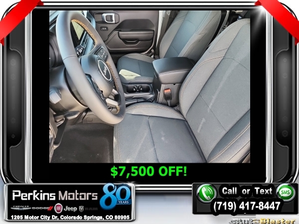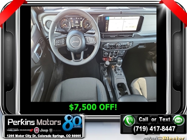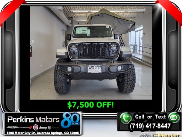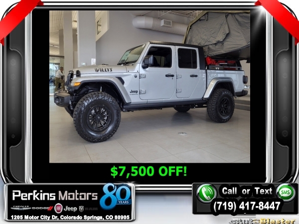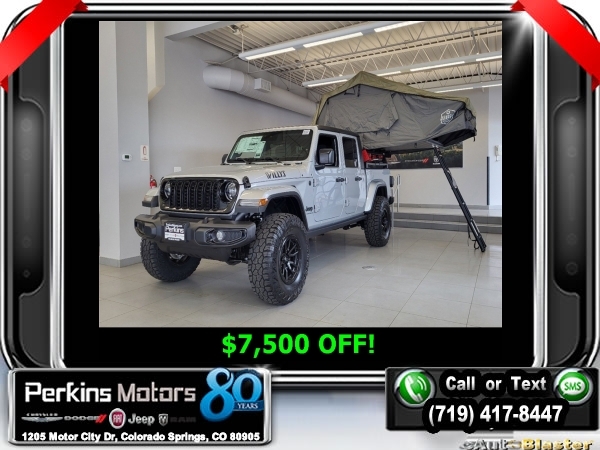 Factory MSRP: $54,230 Silver Zynith Clearcoat 2024 Jeep Gladiator Sport 4WD 8-Speed Automatic 3.6L V6 24V VVT<br>LIFT, TIRES, RIMS, TENT, ETC.....<br>Check us out at www.perkinsmotors.com to see our specials! Since opening our doors in 1944, we’ve been proud to serve Colorado Springs, CO, and the surrounding areas of Pueblo, Castle Rock and Denver, CO. Throughout this time of being family owned for 80 years, we’ve maintained a firm commitment to our customers: to offer a wide selection of New Chrysler, Dodge, Fiat, Jeep, and Ram vehicles and quality pre-owned vehicles, and provide a quick, no-hassle car-buying process that ensures everyone drives off the lot satisfied with their purchase.<br><br>Convenience Group (Air Conditioning w/Auto Temperature Control, Cluster 7.0 TFT Color Display, Emergency/Assistance Call, Front Door Locks 2-Door Passive Entry, Heated Front Seats, Heated Steering Wheel, Remote Start System, and Universal Garage Door Opener), Quick Order Package 24W Willys (240 Amp Alternator, 4-Wheel Drive Decal, 97 MPH Vehicle Max Speed Calibration, Advanced Brake Assist, Automatic Headlamps, Auxiliary Switches, Black Grille, Body Color Fender Flares (2-Piece), Class IV Receiver Hitch, Corning Gorilla Glass, Daytime Running Lamps LED Accents, Deep Tint Sunscreen Windows, E-Locker Rear Axle, Enhanced Adaptive Cruise Control, Front 1-Touch Down Power Windows, Front Heavy Duty Red Accent Shock Absorbers, Front LED Fog Lamps, Full Speed Forward Collision Warning Plus, Heavy-Duty Engine Cooling, LED Premium Reflector Headlamps, LED Taillamps, Mold In Color Bumper w/Gloss Black, MOPAR All-Weather Slush Mats, Off-Road Plus Mode, Power Heated Mirrors, Power Tailgate Lock, Premium Wrapped Steering Wheel, Protection Sill Rails, Rear Heavy Duty Red Accent Shock Absorbers, Remote Keyless Entry, Security Alarm, Speed Sensitive Power Locks, Sun Visors w/Illuminated Vanity Mirrors, Trailer Hitch Zoom, Wheels: 17 x 7.5 Painted Black, Willy's Suspension, and Willys Hood Decal), 110 MPH Vehicle Max Speed Calibration, 12.3 Touchscreen Display, 3.73 Rear Axle Ratio, 4-Wheel Disc Brakes, 4G LTE Wi-Fi Hot Spot, 8 Speakers, ABS brakes, Air Conditioning, Alexa Built-In, AM/FM radio: SiriusXM with 360L, Apple CarPlay, Apple CarPlay/Android Auto, Black 3-Piece Hard Top, Brake assist, Cloth Low-Back Bucket Seats, Compass, Connectivity - US/Canada, Cruise Control, Delay-off headlights, Disassociated Touchscreen Display, Driver door bin, Driver vanity mirror, Dual front impact airbags, Dual front side impact airbags, Electronic Stability Control, Emergency communication system: Jeep Connect, For Details, Visit DriveUconnect.com, Freedom Panel Storage Bag, Front anti-roll bar, Front Bucket Seats, Front Center Armrest w/Storage, Front fog lights, Front License Plate Bracket, Front reading lights, Google Android Auto, Integrated Center Stack Radio, Integrated roll-over protection, Low tire pressure warning, MOPAR Spray In Bedliner, Normal Duty Suspension, Occupant sensing airbag, Outside temperature display, Overhead airbag, ParkView Rear Back-Up Camera, Passenger door bin, Passenger vanity mirror, Power steering, Radio data system, Radio: Uconnect 5 w/12.3 Display, Rear anti-roll bar, Rear reading lights, Rear Sliding Window, Rear Window Defroster, SiriusXM Radio Service, SiriusXM w/360L, Split folding rear seat, Steering wheel mounted audio controls, Tachometer, Telescoping steering wheel, Tilt steering wheel, Traction control, Trip computer, Variably intermittent wipers, Voltmeter, and Wheels: 17 x 7.5 Black Steel StyleD. Price includes $13,990 in dealer added accessories.