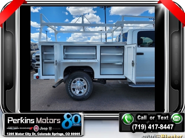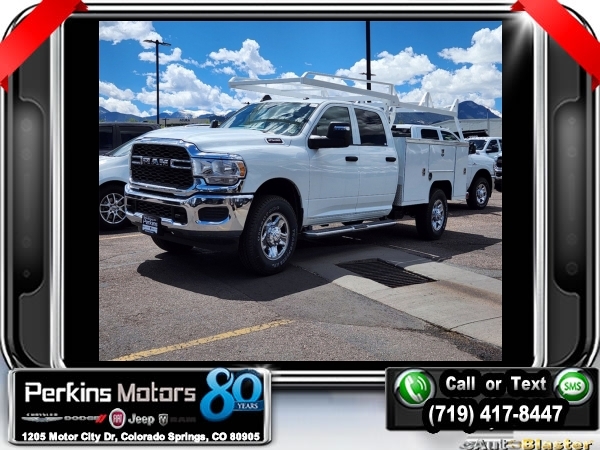 Factory MSRP: $58,785 Bright White Clearcoat 2024 Ram 2500 Tradesman 4WD 8-Speed Automatic 6.4L V8<br>SCELZI SERVICE BODY WITH LADDER RACK.<br>Check us out at www.perkinsmotors.com to see our specials! Since opening our doors in 1944, we’ve been proud to serve Colorado Springs, CO, and the surrounding areas of Pueblo, Castle Rock and Denver, CO. Throughout this time of being family owned for 80 years, we’ve maintained a firm commitment to our customers: to offer a wide selection of New Chrysler, Dodge, Fiat, Jeep, and Ram vehicles and quality pre-owned vehicles, and provide a quick, no-hassle car-buying process that ensures everyone drives off the lot satisfied with their purchase.<br><br>Chrome Appearance Group (Bright Front Bumper, Bright Rear Bumper, Center Hub, Chrome Grille Surround, Chrome Headlamp Bezels, Matte Black Mesh Grille w/Chrome, and Wheels: 18 x 8.0 Steel Chrome Clad), Heavy Duty Snow Plow Prep Group (220 Amp Alternator), Quick Order Package 2GA Tradesman, Tradesman Level 1 Equipment Group (Manual Folding Exterior Mirrors and Manual Telescoping Mirrors), 115V Auxiliary Front Power Outlet, 17 x 7.5 Steel Styled Wheels, 2 Way Rear Headrest Seat, 3.73 Axle Ratio, 4 Way Front Headrests, 4-Wheel Disc Brakes, 40/20/40 Split Bench Seat, 400W Inverter, 6 Speakers, ABS brakes, Active Noise Control System, Air Conditioning, AM/FM radio, Auto Power-Folding Mirrors, Black Exterior Mirrors, Brake assist, Chrome Flat Cab-Length Side Steps, Compass, Cruise Control, Dash Pass Thru Wire Circuits, Delay-off headlights, Driver door bin, Dual front impact airbags, Dual front side impact airbags, Electric Shift-On-The-Fly Transfer Case, Electronic Stability Control, Electronically Controlled Throttle, Emergency communication system: SiriusXM Guardian, Engine Block Heater, Exterior 115V AC Outlet, Exterior Mirrors Courtesy Lamps, Exterior Mirrors w/Heating Element, Exterior Mirrors w/Supplemental Signals, Forward & Reverse Utility Lights, Front anti-roll bar, Front Center Armrest w/Storage, Front License Plate Bracket, Front reading lights, Fully automatic headlights, Global Telematics Box Module (TBM), GPS Antenna Input, Heavy Duty Vinyl 40/20/40 Split Bench Seat, I/P Mounted Auxiliary Switches, Illuminated entry, Integrated Voice Command w/Bluetooth, Low tire pressure warning, Manual Adjust 4-Way Driver Seat, Mirror Running Lights, Occupant sensing airbag, Outside temperature display, Overhead airbag, Overhead console, ParkView Rear Back-Up Camera, Passenger door bin, Passenger vanity mirror, Power Adjust Mirrors, Power Adjustable Convex Aux Mirrors, Power Heated Fold Telescope Mirrors, Power steering, Power Telescoping Mirrors, Power windows, Radio data system, Radio: Uconnect 3 w/5 Display, Rear anti-roll bar, Rear Folding Seat, Rear step bumper, SiriusXM Radio Service, Storage Tray, Tachometer, Tilt steering wheel, Tip Start, Tow Hooks, Traction control, Trailer Brake Control, Trailer Light Check, Upfitter Electronic Module (VSIM), Variably intermittent wipers, and Voltmeter. Sale price includes all manufacture's incentives and dealer discounts. Sale price not available on lease or compatible with special APR. $2000 - 2024 Denver BC Bonus Cash . Exp. 07/01/2024 $2000 - 2024 Denver BC Commercial Bonus Cash. Exp. 07/01/2024 Price includes $15,995 in dealer added accessories.