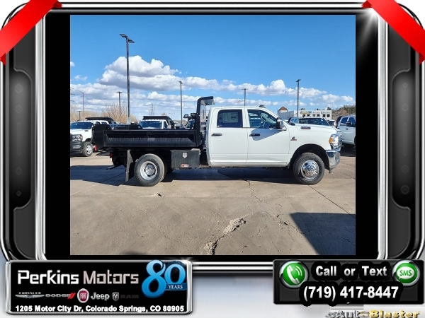 Factory MSRP: $74,915 Bright White Clearcoat 2024 Ram 3500 Tradesman 4WD Aisin 6-Speed Automatic Cummins 6.7L I6 Turbodiesel<br>KNAPHEIDE DUMP BED 12 DROP SIDES.<br>Check us out at www.perkinsmotors.com to see our specials! Since opening our doors in 1944, we’ve been proud to serve Colorado Springs, CO, and the surrounding areas of Pueblo, Castle Rock and Denver, CO. Throughout this time of being family owned for 80 years, we’ve maintained a firm commitment to our customers: to offer a wide selection of New Chrysler, Dodge, Fiat, Jeep, and Ram vehicles and quality pre-owned vehicles, and provide a quick, no-hassle car-buying process that ensures everyone drives off the lot satisfied with their purchase.<br><br>Chrome Appearance Group (Bright Front Bumper, Bright Wheel Skins, Center Hub, Chrome Grille Surround, Chrome Headlamp Bezels, and Matte Black Mesh Grille w/Chrome), Max Tow Package (12.0 Dual Wheel Rear Axle and Add 4.10 Axle Ratio), Quick Order Package 2YA Tradesman (Black Exterior Truck Badging, Black Key Fob, Door Sill Scuff Pads, Glove Box, Halogen Quad Headlamps, Map/Courtesy Lamp, Matte Black Grille Surround, Overhead Console, Overhead Cupholder Lamp, and Rear Dome Lamp), 102 mph Maximum Speed, 11.50 Dual Wheels Rear Axle, 4-Wheel Disc Brakes, 4.10 Axle Ratio, 40/20/40 Split Bench Seat, 4G LTE Wi-Fi Hot Spot, 6 Speakers, 6000# Front Axle w/Hub Ext, 8.4 Touchscreen Display, ABS brakes, Air Conditioning, All R1 Low Radios, All Radio-Equipped Vehicles, Apple CarPlay, Bluetooth Handsfree Phone & Audio, Compass, Connectivity - US/Canada, Cruise Control, Delay-off headlights, Driver door bin, Dual front impact airbags, Dual Rear Wheels, Electric Shift-On-The-Fly Transfer Case, Electronic Stability Control, Floor Covering Carpet, For Details, Visit DriveUconnect.com, For More Info, Call 800-643-2112, Front & Rear Floor Mats, Front anti-roll bar, Front Bucket Seats, Front License Plate Bracket, Fully automatic headlights, Global Telematics Box Module (TBM), Google Android Auto, GPS Antenna Input, HD Vinyl 40/20/40 Split Bench Seat, Heated door mirrors, Integrated Center Stack Radio, Integrated Voice Command w/Bluetooth, Manual Adjust 4-Way Driver Seat, Manual Adjust 4-Way Front Passenger Seat, Manufacturer's Statement of Origin, Occupant sensing airbag, Outside temperature display, Overhead console, Passenger door bin, Passenger vanity mirror, Power door mirrors, Power steering, Power windows, Radio data system, Radio: Uconnect 3 w/5 Display, Radio: Uconnect 5 w/8.4 Display, Rear anti-roll bar, Rear Folding Seat, Remote Keyless Entry, Remote USB Port - Charge Only, SiriusXM Radio Service, SiriusXM Satellite Radio, Storage Tray, Tachometer, Temperature & Compass Gauge, Tilt steering wheel, Tow Hooks, Traction control, Trailer Brake Control, Trailer Light Check, Turn signal indicator mirrors, Variably intermittent wipers, Voltmeter, Wheels: 17 x 6.0 Steel Chrome Clad, and Wheels: 18 x 8.0 SteeL. Price includes $18,995 in dealer added accessories.