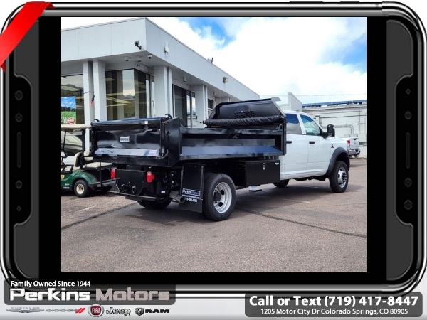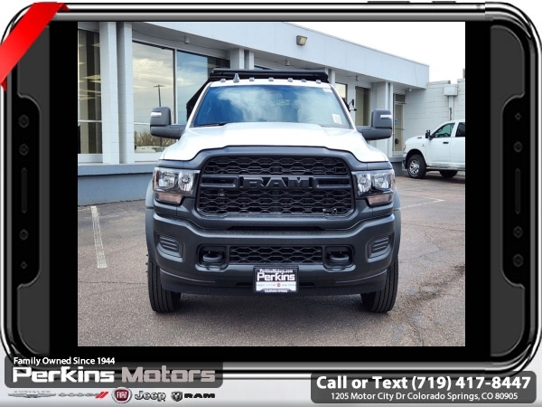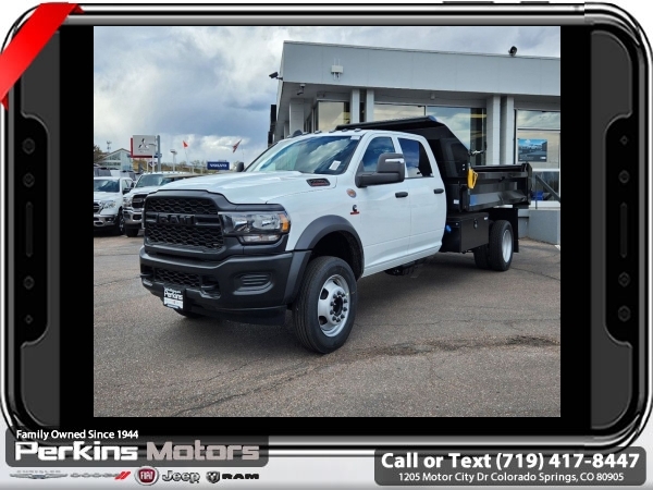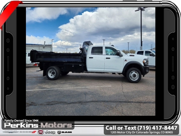 Factory MSRP: $79,395 Bright White Clearcoat 2024 Ram 5500HD Tradesman 4WD Aisin 6-Speed Automatic Cummins 6.7L I6 Turbodiesel<br>DUMP BED.<br>Check us out at www.perkinsmotors.com to see our specials! Since opening our doors in 1944, we’ve been proud to serve Colorado Springs, CO, and the surrounding areas of Pueblo, Castle Rock and Denver, CO. Throughout this time of being family owned for 80 years, we’ve maintained a firm commitment to our customers: to offer a wide selection of New Chrysler, Dodge, Fiat, Jeep, and Ram vehicles and quality pre-owned vehicles, and provide a quick, no-hassle car-buying process that ensures everyone drives off the lot satisfied with their purchase.<br><br>Heavy Duty Snow Plow Prep Group, Max Tow Package (4.89 Axle Ratio), Quick Order Package 2YA Tradesman (Black Exterior Truck Badging, Black Key Fob, Black Wheel Flares, Door Sill Scuff Pads, Glove Box, Halogen Quad Headlamps, Map/Courtesy Lamp, Matte Black Grille Surround, Overhead Console, Overhead Cupholder Lamp, and Rear Dome Lamp), SiriusXM Satellite Radio (For More Info, Call 800-643-2112 and SiriusXM Radio Service), 19.5 x 6.0 Steel Wheels, 4-Wheel Disc Brakes, 4.44 Axle Ratio, 40/20/40 Split Bench Seat, 4G LTE Wi-Fi Hot Spot, 6 Speakers, 8.4 Touchscreen Display, 87 mph Maximum Speed, ABS brakes, Air Conditioning, All R1 Low Radios, All Radio Equipped Vehicles, Apple CarPlay, Black Exterior Mirrors, Compass, Connectivity - US/Canada, Courtesy Lamps, Cruise Control, Delay-off headlights, Driver door bin, Dual front impact airbags, Dual rear wheels, Electronic Stability Control, Electronically Controlled Throttle, Emergency communication system: SiriusXM Guardian, For Details, Visit DriveUconnect.com, Front anti-roll bar, Front Bucket Seats, Front License Plate Bracket, Front reading lights, Fully automatic headlights, Global Telematics Box Module (TBM), Google Android Auto, GPS Antenna Input, HD Vinyl 40/20/40 Split Bench Seat, Heavy Duty Front Suspension Group, Integrated Center Stack Radio, Integrated Voice Command w/Bluetooth, Manual Adjust 4-Way Driver Seat, Manual Adjust 4-Way Front Passenger Seat, Manual DPF Regeneration, Manual Folding Exterior Mirrors, Manufacturer's Statement of Origin, Occupant sensing airbag, Outside temperature display, Passenger door bin, Passenger vanity mirror, Power 2-Way Driver Lumbar Adjust, Power steering, Power windows, Radio data system, Radio: Uconnect 3 w/5 Display, Radio: Uconnect 5 w/8.4 Display, Rear anti-roll bar, Rear Folding Seat, Remote Keyless Entry, Tachometer, Temperature & Compass Gauge, Tilt steering wheel, Traction control, Trailer Brake Control, Variably intermittent wipers, and VoltmeteR. Sale price includes all manufacture's incentives and dealer discounts. Sale price not available on lease or compatible with special APR. $1500 - 2024 National Stellantis Loyalty Bonus Cash . Exp. 06/30/2025 $8368 - 2024 National Minimum Employee Pricing Discount . Exp. 06/30/2025 Price includes $20,995 in dealer added accessories.