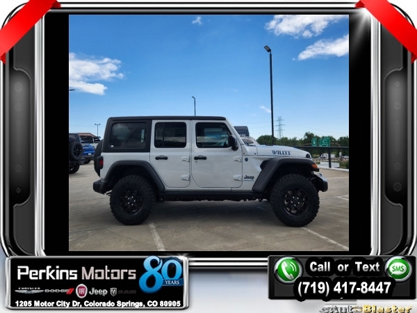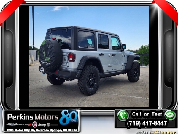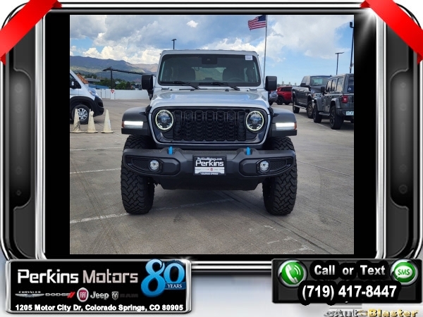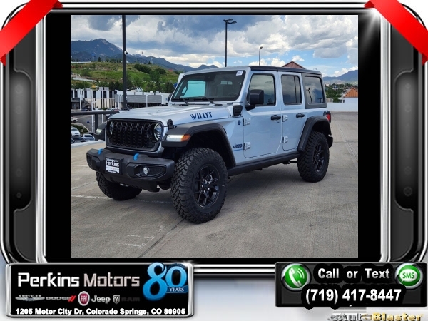 Factory MSRP: $61,615 $9,721 off MSRP! Priced below KBB Fair Purchase Price! Silver Zynith Clearcoat 2024 Jeep Wrangler Willys 4xe 4WD 8-Speed Automatic 2.0L I4 DOHC<br>2.0L I4 DOHC.<br>Check us out at www.perkinsmotors.com to see our specials! Since opening our doors in 1944, we’ve been proud to serve Colorado Springs, CO, and the surrounding areas of Pueblo, Castle Rock and Denver, CO. Throughout this time of being family owned for 80 years, we’ve maintained a firm commitment to our customers: to offer a wide selection of New Chrysler, Dodge, Fiat, Jeep, and Ram vehicles and quality pre-owned vehicles, and provide a quick, no-hassle car-buying process that ensures everyone drives off the lot satisfied with their purchase.<br><br>Convenience Group (2-Door Passive Entry, Front Door Locks and Universal Garage Door Opener), Quick Order Package 29W Willys (Black Grille, Conventional Differential Front Axle, Wheels: 17 x 7.5 Painted Black, and Willys 4xe Hood Decal), 2.0L I4 DOHC, 3.73 Rear Axle Ratio, 4-Wheel Disc Brakes, 8 Speakers, ABS brakes, Air Conditioning, Alloy wheels, Apple CarPlay/Android Auto, Automatic temperature control, Black 3-Piece Hard Top, Brake assist, Cloth Low-Back Bucket Seats, Compass, Cruise Control, Delay-off headlights, Driver door bin, Driver vanity mirror, Dual front impact airbags, Dual front side impact airbags, Electronic Stability Control, Front anti-roll bar, Front Bucket Seats, Front Center Armrest w/Storage, Front dual zone A/C, Front fog lights, Front License Plate Bracket, Front reading lights, Fully automatic headlights, Heated door mirrors, Illuminated entry, Integrated roll-over protection, Low tire pressure warning, Occupant sensing airbag, Outside temperature display, Overhead airbag, Panic alarm, ParkView Rear Back-Up Camera, Passenger door bin, Passenger vanity mirror, Power door mirrors, Power steering, Power windows, Radio data system, Radio: Uconnect 5 w/12.3 Display, Rear anti-roll bar, Rear reading lights, Remote keyless entry, Security system, Split folding rear seat, Sport Suspension, Steering wheel mounted audio controls, Tachometer, Telescoping steering wheel, Tilt steering wheel, Traction control, Trip computer, Variably intermittent wipers, Voltmeter, and Wheels: 20 x 8 Machined/Painted Gray. Sale price includes all manufacture's incentives and dealer discounts. Sale price not available on lease or compatible with special APR. $3000 - 2024 National Retail Consumer Cash . Exp. 07/01/2024 $3750 - Federal EV Tax Credit. Exp. 12/31/2024
