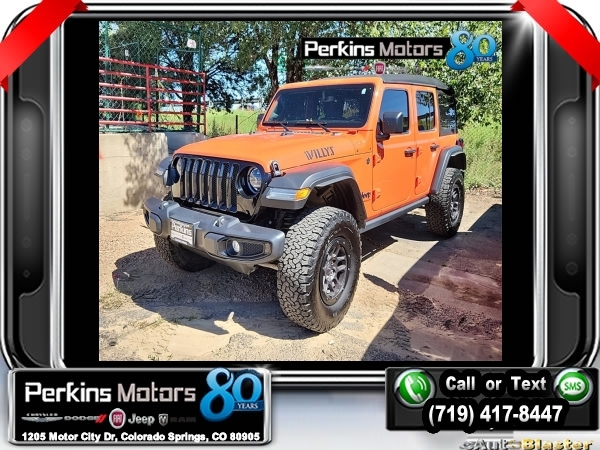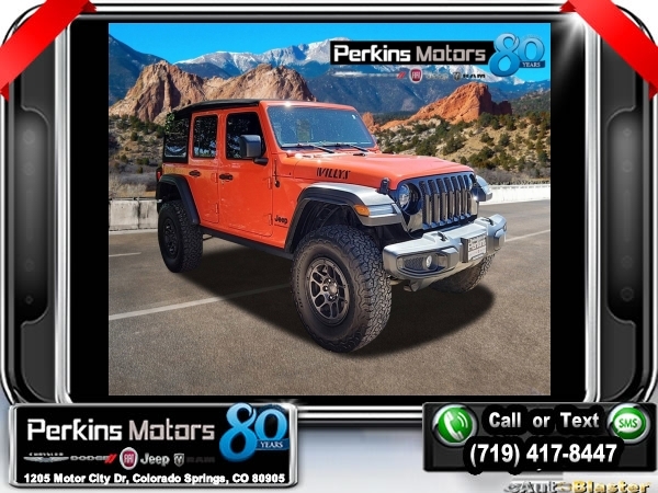 Punkn Metallic Clearcoat 4WD 2.0L I4 DOHC 8-Speed Automatic<br><br><br>CARFAX One-Owner. Clean CARFAX.<br><br>Check us out at www.perkinsmotors.com to see our specials! Since opening our doors in 1944, we’ve been proud to serve Colorado Springs, CO, and the surrounding areas of Pueblo, Castle Rock and Denver, CO. Throughout this time of being family owned for 80 years, we’ve maintained a firm commitment to our customers: to offer a wide selection of New Chrysler, Dodge, Fiat, Jeep, and Ram vehicles and quality pre-owned vehicles, and provide a quick, no-hassle car-buying process that ensures everyone drives off the lot satisfied with their purchase.<br><br><br>8.4 Radio & Premium Audio Group (Alpine Premium Audio System, Apple CarPlay, Google Android Auto, GPS Antenna Input, Integrated Center Stack Radio, Integrated Voice Command w/Bluetooth, Radio: Uconnect 4C Nav w/8.4 Display, SiriusXM Satellite Radio, and USB Host Flip), Quick Order Package 22W Willys (4-Wheel Drive Swing Gate Decal, Anti-Spin Differential Rear Axle, Mold In Color Bumper w/Gloss Black, Power Heated Mirrors, Speed Sensitive Power Locks, Sun Visors w/Illuminated Vanity Mirrors, Wheels: 17 x 7.5 Black Aluminum, and Willys Hood Decal), Technology Group, Xtreme 35 Tire Package (35 Tire Suspension, 4.56 Rear Axle Ratio, Molded in Color Rubicon Highline Flare, and Wheels: 17 x 8 Beadlock Capable), 3.45 Overall Top Gear Ratio, 4-Wheel Disc Brakes, 8 Speakers, ABS brakes, Air Conditioning, AM/FM radio, Apple CarPlay/Android Auto, Aux Battery, Brake assist, Cloth Low-Back Bucket Seats, Compass, Cruise Control, Delay-off headlights, Driver door bin, Driver vanity mirror, Dual front impact airbags, Dual front side impact airbags, Electronic Stability Control, Emergency communication system: SiriusXM Guardian, Engine Oil Cooler, Front anti-roll bar, Front Bucket Seats, Front Center Armrest w/Storage, Front fog lights, Front reading lights, Integrated roll-over protection, Low tire pressure warning, MOPAR Cargo Tub Liner, MOPAR Hinge-Gate Reinforcement, MOPAR Plastic Door Sill Guards, Non-Lock Fuel Cap w/o Discriminator, Normal Duty Suspension, Occupant sensing airbag, Outside temperature display, ParkView Rear Back-Up Camera, Passenger door bin, Passenger vanity mirror, Power steering, Premium Black Sunrider Soft Top, Radio data system, Radio: Uconnect 4 w/7 Display, Rear anti-roll bar, Rear reading lights, Split folding rear seat, Steering wheel mounted audio controls, Stop-Start Dual Battery System, Tachometer, Telescoping steering wheel, Tilt steering wheel, Traction control, Trip computer, Variably intermittent wipers, and Wheels: 17 x 7.5 Black Steel Styled.