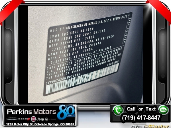 AWD 2.0L TSI DOHC 8-Speed Automatic with Tiptronic<br><br>AWD, 6 Speakers, Brake assist, Electronic Stability Control, Forward collision: FCW w/Autonomous Emergency Braking mitigation, Radio data system, Radio: Composition Color AM/FM, Wheels: 17 Multi-Spoke 2-Tone Alloy.<br><br><br>CARFAX One-Owner. Clean CARFAX.<br><br>Check us out at www.perkinsmotors.com to see our specials! Since opening our doors in 1944, we’ve been proud to serve Colorado Springs, CO, and the surrounding areas of Pueblo, Castle Rock and Denver, CO. Throughout this time of being family owned for 80 years, we’ve maintained a firm commitment to our customers: to offer a wide selection of New Chrysler, Dodge, Fiat, Jeep, and Ram vehicles and quality pre-owned vehicles, and provide a quick, no-hassle car-buying process that ensures everyone drives off the lot satisfied with their purchase.<br><br><br>AWD, 6 Speakers, Brake assist, Electronic Stability Control, Forward collision: FCW w/Autonomous Emergency Braking mitigation, Radio data system, Radio: Composition Color AM/FM, Wheels: 17 Multi-Spoke 2-Tone Alloy, 3.33 Axle Ratio, 4-Wheel Disc Brakes, 4-Wheel Independent Suspension, ABS brakes, Air Conditioning, Alloy wheels, AM/FM radio, Bumpers: body-color, Cloth Seating Surfaces, Compass, Cruise Control, Delay-off headlights, Driver door bin, Driver vanity mirror, Dual front impact airbags, Dual front side impact airbags, Emergency communication system: VW Car-Net services (capabilities require enrollment or subscription), Exterior Parking Camera Rear, Four wheel independent suspension, Front anti-roll bar, Front Bucket Seats, Front Center Armrest, Front reading lights, Fully automatic headlights, Heated door mirrors, Illuminated entry, Low tire pressure warning, Occupant sensing airbag, Outside temperature display, Overhead airbag, Overhead console, Panic alarm, Passenger door bin, Passenger vanity mirror, Power door mirrors, Power steering, Power windows, Rear anti-roll bar, Rear seat center armrest, Rear window defroster, Rear window wiper, Remote keyless entry, Roof rack: rails only, Speed-sensing steering, Split folding rear seat, Spoiler, Steering wheel mounted audio controls, Tachometer, Telescoping steering wheel, Tilt steering wheel, Traction control, Trip computer, Turn signal indicator mirrors, and Variably intermittent wipers.