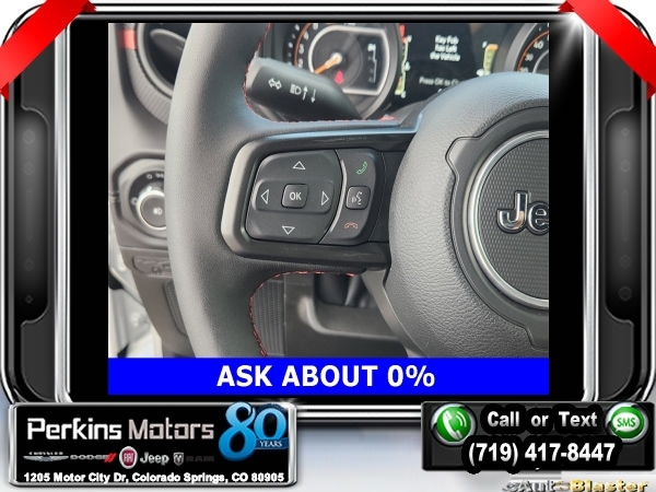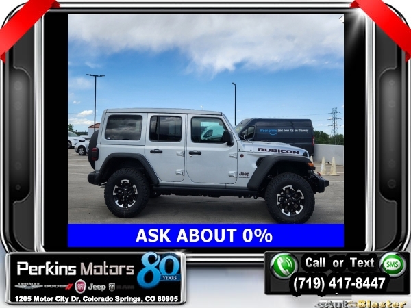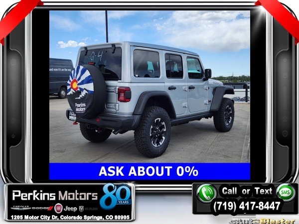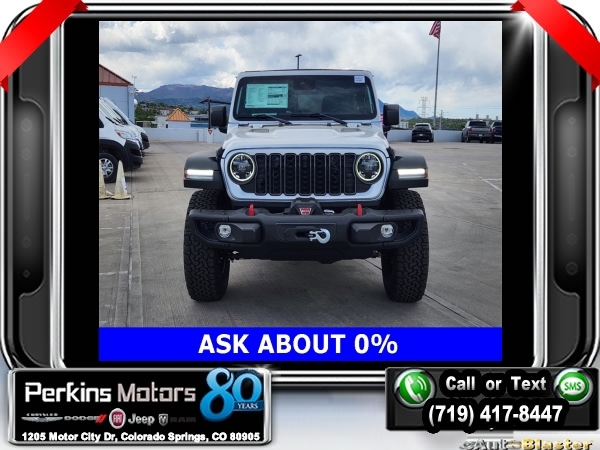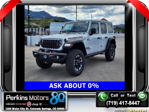 Factory MSRP: $72,520 $19,000 off MSRP! Silver Zynith Clearcoat 2024 Jeep Wrangler Rubicon 4WD 8-Speed Automatic 3.6L V6 24V VVT<br><br>Check us out at www.perkinsmotors.com to see our specials! Since opening our doors in 1944, we’ve been proud to serve Colorado Springs, CO, and the surrounding areas of Pueblo, Castle Rock and Denver, CO. Throughout this time of being family owned for 80 years, we’ve maintained a firm commitment to our customers: to offer a wide selection of New Chrysler, Dodge, Fiat, Jeep, and Ram vehicles and quality pre-owned vehicles, and provide a quick, no-hassle car-buying process that ensures everyone drives off the lot satisfied with their purchase.<br><br>Capability Package (Steel Rear Bumper and Warn Winch), Convenience Group (Heated Steering Wheel), Quick Order Package 24R Rubicon, Technology Group (12.3 Touchscreen Display, Apple CarPlay, Connectivity - US/Canada, Disassociated Touchscreen Display, Google Android Auto, HD Radio, Integrated Center Stack Radio, Integrated Voice Command w/Bluetooth, Radio: Uconnect 5 Nav w/12.3 Display, and SiriusXM w/360L), 4-Wheel Disc Brakes, 4.10 Rear Axle Ratio, 8 Speakers, 97 MPH Vehicle Max Speed Calibration, ABS brakes, Air Conditioning, Alloy wheels, AM/FM radio: SiriusXM, Apple CarPlay/Android Auto, Automatic temperature control, Aux Battery, Brake assist, Cloth Low-Back Bucket Seats, Compass, Cruise Control, Delay-off headlights, Driver door bin, Driver vanity mirror, Dual front impact airbags, Dual front side impact airbags, Electronic Stability Control, Emergency communication system: Jeep Connect, Front anti-roll bar, Front Bucket Seats, Front Center Armrest w/Storage, Front dual zone A/C, Front fog lights, Front License Plate Bracket, Front reading lights, Fully automatic headlights, Heated door mirrors, Illuminated entry, Integrated roll-over protection, Jeep Trail Rated Kit, Low tire pressure warning, MOPAR All-Weather Floor Mats, Non-Lock Fuel Cap w/o Discriminator, Occupant sensing airbag, Outside temperature display, Overhead airbag, Panic alarm, ParkView Rear Back-Up Camera, Passenger door bin, Passenger vanity mirror, Performance Suspension, Power door mirrors, Power steering, Power windows, Radio data system, Radio: Uconnect 5 w/12.3 Display, Rear anti-roll bar, Rear reading lights, Rear Window Defroster, Remote keyless entry, Removable Rear Quarter Windows, Security system, Sky 1-Touch Power Top, Split folding rear seat, Steering wheel mounted audio controls, Stop-Start Dual Battery System, Tachometer, Telescoping steering wheel, Tilt steering wheel, Traction control, Trip computer, Variably intermittent wipers, Voltmeter, Wheels: 17 x 7.5 Machined w/Black Pockets, and Wheels: 17 x 7.5 Machined/Painted Black. Sale price includes all manufacture's incentives and dealer discounts. Sale price not available on lease or compatible with special APR. $2000 - 2024 Bonus Cash . Exp. 09/30/2024 $6,000 - Exp. 09/30/2024