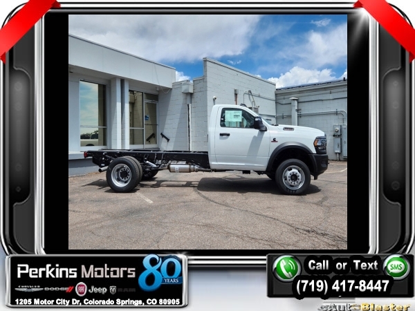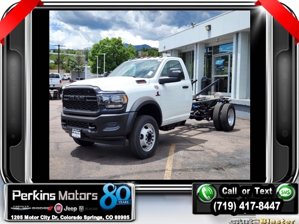 Factory MSRP: $77,365 $6,236 off MSRP! Bright White Clearcoat 2024 Ram 5500HD Tradesman 4WD Aisin 6-Speed Automatic Cummins 6.7L I6 Turbodiesel<br><br>Check us out at www.perkinsmotors.com to see our specials! Since opening our doors in 1944, we’ve been proud to serve Colorado Springs, CO, and the surrounding areas of Pueblo, Castle Rock and Denver, CO. Throughout this time of being family owned for 80 years, we’ve maintained a firm commitment to our customers: to offer a wide selection of New Chrysler, Dodge, Fiat, Jeep, and Ram vehicles and quality pre-owned vehicles, and provide a quick, no-hassle car-buying process that ensures everyone drives off the lot satisfied with their purchase.<br><br>Cold Weather Group (Engine Block Heater), Electrical Accessory Group (Voltage Monitoring Auto Idle Up System), Heavy Duty Snow Plow Prep Group, Max Tow Package (4.89 Axle Ratio), Quick Order Package 2YA Tradesman (Black Key Fob, Black Wheel Flares, Door Sill Scuff Pads, Halogen Quad Headlamps, Map/Courtesy Lamp, and Matte Black Grille Surround), SiriusXM Satellite Radio (For More Info, Call 800-643-2112 and SiriusXM Radio Service), Tradesman Level 1 Equipment Group (Black Exterior Mirrors, Exterior Mirrors Courtesy Lamps, Front 1-Touch Down Power Windows, Manual Folding Exterior Mirrors, Manual Telescoping Mirrors, Mirror Running Lights, Overhead Console, Overhead Cupholder Lamp, Power Adjust Mirrors, Power-Adjustable Convex Aux Mirrors, Remote Keyless Entry, and Upgraded Door Trim Panel), 19.5 x 6.0 Steel Wheels, 4 Speakers, 4-Wheel Disc Brakes, 4.44 Axle Ratio, 40/20/40 Split Bench Seat, 8.4 Touchscreen Display, 87 mph Maximum Speed, ABS brakes, Air Conditioning, All Radio Equipped Vehicles, Apple CarPlay, Bluetooth Handsfree Phone & Audio, Compass, Connectivity - US/Canada, Cruise Control, Delay-off headlights, Driver door bin, Dual front impact airbags, Dual rear wheels, Electric Shift-On-The-Fly Transfer Case, Electronic Stability Control, Electronically Controlled Throttle, Emergency communication system: SiriusXM Guardian, For Details, Visit DriveUconnect.com, Front anti-roll bar, Front Bucket Seats, Front License Plate Bracket, Fully automatic headlights, Global Telematics Box Module (TBM), Google Android Auto, GPS Antenna Input, HD Vinyl 40/20/40 Split Bench Seat, Heavy Duty Front Suspension Group, Integrated Voice Command w/Bluetooth, Manual Adjust 4-Way Driver Seat, Manual Adjust 4-Way Front Passenger Seat, Manual DPF Regeneration, Manufacturer's Statement of Origin, MOPAR Front Rubber Floor Mats, Occupant sensing airbag, Outside temperature display, Passenger door bin, Passenger vanity mirror, Power steering, Radio data system, Radio: Uconnect 3 w/5 Display, Radio: Uconnect 5 w/8.4 Display, Rear anti-roll bar, Remote USB Port - Charge Only, Storage Tray, Tachometer, Temperature & Compass Gauge, Tilt steering wheel, Traction control, Trailer Brake Control, Variably intermittent wipers, and VoltmeteR. $1,000 - Exp. 01/02/2025