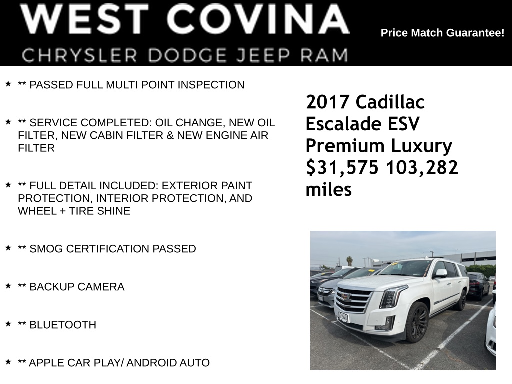 WE SPECIALIZE IN ALL CREDIT PROFILES! See what we can do for you! Call to find out (626) 899-9302.Recent Arrival!** PASSED FULL MULTI POINT INSPECTION, ** SERVICE COMPLETED: OIL CHANGE, NEW OIL FILTER, NEW CABIN FILTER & NEW ENGINE AIR FILTER, ** FULL DETAIL INCLUDED: EXTERIOR PAINT PROTECTION, INTERIOR PROTECTION, AND WHEEL + TIRE SHINE, ** SMOG CERTIFICATION PASSED, ** BACKUP CAMERA, ** BLUETOOTH, ** APPLE CAR PLAY/ ANDROID AUTO, 4WD.Crystal White Tricoat2017 Cadillac Escalade ESV Premium 4WD 8-Speed Automatic Vortec 6.2L V8 SIDI**********All Pricing and Advertised Prices for any/all vehicles offered for sale does not include dealer installed accessories which can be purchased for an additional cost.********** The Factory Rebates may not be available on this vehicle if you elect to take advantage of a Special Alternative APR or Special Lease program. Some Factory Rebates are California Resident specific and may vary for residents of other states. NO sales to Dealers, Brokers or Exporters. For out of state purchase, customers must be present to purchase. If shipping is required, dealership must facilitate; no exceptions. Please contact us for special Multi-Vehicle or Fleet pricing. Prices are plus government fees and taxes, any finance charges, $85 documentary fee, $29 electronic registration fee, any emission testing charge and $1.75 per new tire state tire fee. *** We make every effort to provide accurate information, but please verify before purchasing. Leasing & financing available on approved credit. Trade-ins accepted. Subject to prior sale.Reviews: * Strong V8 engine is never at a loss for power; capable of towing up to 8,100 pounds; cabin remains quiet regardless of road conditions; seating for up to eight passengers Source: Edmunds