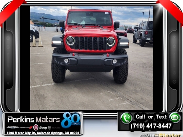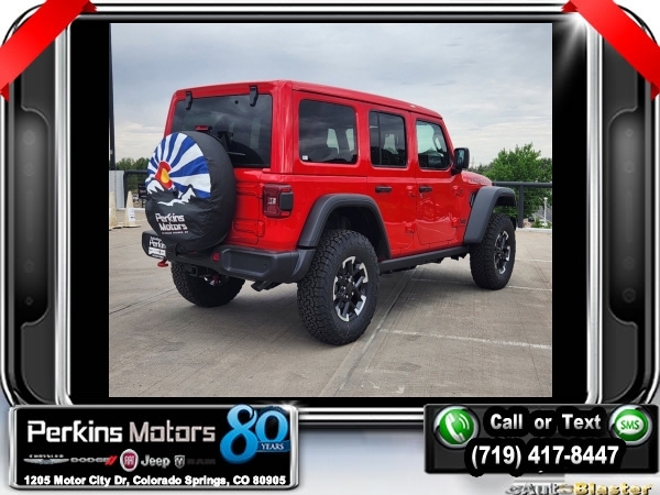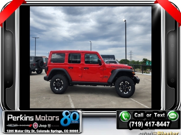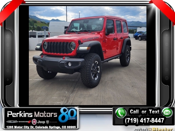 Factory MSRP: $68,025 $14,000 off MSRP! Firecracker Red Clearcoat 2024 Jeep Wrangler Rubicon 4WD 8-Speed Automatic 3.6L V6 24V VVT<br><br>Check us out at www.perkinsmotors.com to see our specials! Since opening our doors in 1944, we’ve been proud to serve Colorado Springs, CO, and the surrounding areas of Pueblo, Castle Rock and Denver, CO. Throughout this time of being family owned for 80 years, we’ve maintained a firm commitment to our customers: to offer a wide selection of New Chrysler, Dodge, Fiat, Jeep, and Ram vehicles and quality pre-owned vehicles, and provide a quick, no-hassle car-buying process that ensures everyone drives off the lot satisfied with their purchase.<br><br>Convenience Group, Quick Order Package 24R Rubicon, Safety Group (Blind Spot & Cross Path Detection), 12.3 Touchscreen Display, 4-Wheel Disc Brakes, 4.10 Rear Axle Ratio, 8 Speakers, 97 MPH Vehicle Max Speed Calibration, ABS brakes, Air Conditioning, Alloy wheels, AM/FM radio: SiriusXM, Apple CarPlay, Apple CarPlay/Android Auto, Automatic temperature control, Aux Battery, Brake assist, Cloth Low-Back Bucket Seats, Compass, Connectivity - US/Canada, Cruise Control, Delay-off headlights, Disassociated Touchscreen Display, Driver door bin, Driver vanity mirror, Dual front impact airbags, Dual front side impact airbags, Electronic Stability Control, Emergency communication system: Jeep Connect, Front anti-roll bar, Front Bucket Seats, Front Center Armrest w/Storage, Front dual zone A/C, Front fog lights, Front License Plate Bracket, Front reading lights, Fully automatic headlights, Google Android Auto, Heated door mirrors, Illuminated entry, Integrated Center Stack Radio, Integrated roll-over protection, Integrated Voice Command w/Bluetooth, Jeep Trail Rated Kit, Low tire pressure warning, MOPAR All-Weather Floor Mats, Non-Lock Fuel Cap w/o Discriminator, Occupant sensing airbag, Outside temperature display, Overhead airbag, Panic alarm, ParkView Rear Back-Up Camera, Passenger door bin, Passenger vanity mirror, Performance Suspension, Power door mirrors, Power steering, Power windows, Radio data system, Radio: Uconnect 5 w/12.3 Display, Rear anti-roll bar, Rear reading lights, Rear Window Defroster, Remote keyless entry, Removable Rear Quarter Windows, Security system, Sky 1-Touch Power Top, Split folding rear seat, Steering wheel mounted audio controls, Stop-Start Dual Battery System, Tachometer, Telescoping steering wheel, Tilt steering wheel, Traction control, Trip computer, Variably intermittent wipers, Voltmeter, Wheels: 17 x 7.5 Machined w/Black Pockets, and Wheels: 17 x 7.5 Machined/Painted Black. Sale price includes all manufacture's incentives and dealer discounts. Sale price not available on lease or compatible with special APR. $3000 - 2024 Bonus Cash . Exp. 09/30/2024
