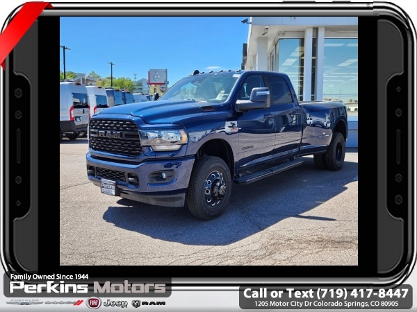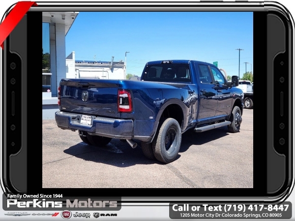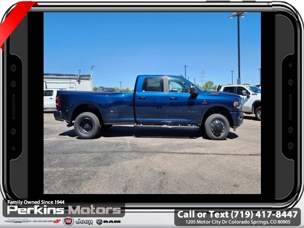 Factory MSRP: $90,620 $11,500 off MSRP! Patriot Blue Pearlcoat 2024 Ram 3500 Big Horn 4WD Aisin 6-Speed Automatic 6.7L I6<br><br>Check us out at www.perkinsmotors.com to see our specials! Since opening our doors in 1944, we’ve been proud to serve Colorado Springs, CO, and the surrounding areas of Pueblo, Castle Rock and Denver, CO. Throughout this time of being family owned for 80 years, we’ve maintained a firm commitment to our customers: to offer a wide selection of New Chrysler, Dodge, Fiat, Jeep, and Ram vehicles and quality pre-owned vehicles, and provide a quick, no-hassle car-buying process that ensures everyone drives off the lot satisfied with their purchase.<br><br>Bed Utility Group (LED Bed Lighting, MOPAR Deployable Bed Step, and MOPAR Spray In Bedliner), Cold Weather Group (Engine Block Heater), Heated Seats & Wheel Group (Heated Front Seats, Heated Steering Wheel, Leather Wrapped Steering Wheel, and Steering Wheel Mounted Audio Controls), Heavy Duty Snow Plow Prep Group (220 Amp Alternator), Level 1 Equipment Group (2 Way Rear Headrest Seat, 4 Way Front Headrests, 40/20/40 Split Bench Seat, 4G LTE Wi-Fi Hot Spot, Black Exterior Mirrors, Bluetooth Handsfree Phone & Audio, Center Hub, Connectivity - US/Canada, Exterior Mirrors Courtesy Lamps, Exterior Mirrors w/Heating Element, Exterior Mirrors w/Supplemental Signals, Footwell Courtesy Lamp, For Details Visit DriveUconnect.com, For More Info, Call 800-643-2112, Forward & Reverse Utility Lights, Front Armrest w/Cupholders, Front Fog Lamps, Front Seat Back Map Pockets, Global Telematics Box Module (TBM), GPS Antenna Input, Integrated Voice Command w/Bluetooth, Locking Lower Glove Box, Manual Adjust 4-Way Front Passenger Seat, Power Adjust Mirrors, Power Heated Fold Telescopic Mirrors, Power-Adjustable Convex Aux Mirrors, Premium Cloth 40/20/40 Bench Seat, Remote USB Port - Charge Only, SiriusXM Radio Service, Storage Tray, and Wheels: 18 x 8.0 Polished Aluminum), Night Edition (Black Exterior Truck Badging, Black Interior Accents, Black Tail Lamp Bezels, Body Color Door Handles, Body Color Grille Surround, and Gloss Black Nostrils/Molded in Color Black Grille), Protection Group, Quick Order Package 21Z Big Horn, Safety Group (Adaptive Cruise Control w/Stop and Rain Sensitive Windshield Wipers), Tow Technology Plus Group (Digital 3.0 Rear View Auto Dimming Mirror and Trailer Reverse Steering Control), Towing Technology Group (CTR Stop Lamp w/Cargo View Camera and Surround View Camera System), 12 Touchscreen Display, 3.73 Axle Ratio, 4-Wheel Disc Brakes, 4.10 Axle Ratio, 50 Gallon Fuel Tank, 5th Wheel/Gooseneck Towing Prep Group, 6 Speakers, 9 Alpine Speakers w/Subwoofer, ABS brakes, Active Noise Control System, Air Conditioning, Air Conditioning ATC w/Dual Zone Control, Auto Level Rear Air Suspension, Blind Spot & Cross Path Detection, Brake assist, Bumpers: chrome, Clearance Lamps, Cloth 40/20/40 Bench Seat, Compass, Connected Travel & Traffic Services, Cruise Control, Delay-off headlights, Disassociated Touchscreen Display, Driver door bin, Dual front impact airbags, Dual front side impact airbags, Dual Rear Wheels, Electronic Stability Control, Electronically Controlled Throttle, Emergency communication system: SiriusXM Guardian, Front anti-roll bar, Front Center Armrest w/Storage, Front License Plate Bracket, Front reading lights, Fully automatic headlights, HD Radio, Heated door mirrors, Illuminated entry, LED Tail Lamps, Low tire pressure warning, Manual Adjust 4-Way Driver Seat, Manufacturer's Statement of Origin, MOPAR Front & Rear Rubber Floor Mats, Occupant sensing airbag, Outside temperature display, Overhead airbag, Overhead console, Painted Flat Cab-Length Side Steps, Panic alarm, ParkSense Front/Rear Park Assist System, ParkView Rear Back-Up Camera, Passeng Sale price includes all manufacture's incentives and dealer discounts. Sale price not available on lease or compatible with special APR. $2500 - 2024 National Truck Month Bonus Cash. Exp. 0