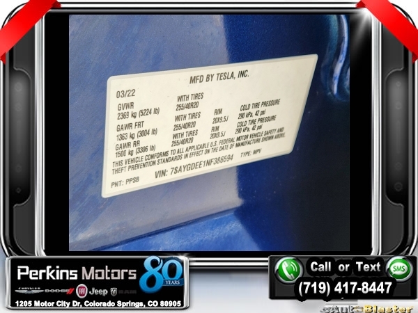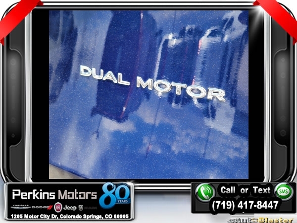 Blue AWD Electric Motor 1-Speed Automatic<br><br><br>CARFAX One-Owner. Clean CARFAX.<br><br>Check us out at www.perkinsmotors.com to see our specials! Since opening our doors in 1944, we’ve been proud to serve Colorado Springs, CO, and the surrounding areas of Pueblo, Castle Rock and Denver, CO. Throughout this time of being family owned for 80 years, we’ve maintained a firm commitment to our customers: to offer a wide selection of New Chrysler, Dodge, Fiat, Jeep, and Ram vehicles and quality pre-owned vehicles, and provide a quick, no-hassle car-buying process that ensures everyone drives off the lot satisfied with their purchase.<br><br><br>14 Speakers, 4-Wheel Disc Brakes, 5 Seat Interior, 9.0 Axle Ratio, ABS brakes, Air Conditioning, Alloy wheels, Audio memory, Auto High-beam Headlights, Auto tilt-away steering wheel, Auto-dimming door mirrors, Auto-dimming Rear-View mirror, Automatic temperature control, Brake assist, Bumpers: body-color, Compass, Cruise Control, Delay-off headlights, Driver door bin, Driver vanity mirror, Dual front impact airbags, Dual front side impact airbags, Electronic Stability Control, Exterior Parking Camera Rear, Four wheel independent suspension, Front anti-roll bar, Front Bucket Seats, Front Center Armrest, Front dual zone A/C, Front fog lights, Front reading lights, Fully automatic headlights, Genuine wood dashboard insert, Heated door mirrors, Heated front seats, Heated rear seats, Heated steering wheel, HVAC memory, Illuminated entry, Knee airbag, Lane Departure Warning System, Low tire pressure warning, Memory seat, Navigation System, Occupant sensing airbag, Outside temperature display, Overhead airbag, Passenger door bin, Passenger vanity mirror, Power door mirrors, Power driver seat, Power Liftgate, Power passenger seat, Power steering, Power windows, Premium Audio System, Premium Seat Trim, Radio data system, Rain sensing wipers, Rear reading lights, Rear seat center armrest, Rear window defroster, Remote keyless entry, Security system, Speed-sensing steering, Split folding rear seat, Steering wheel memory, Steering wheel mounted A/C controls, Steering wheel mounted audio controls, Telescoping steering wheel, Tilt steering wheel, Traction control, Trip computer, Variably intermittent wipers, and Wheels: 19 x 9.5 Gemini.