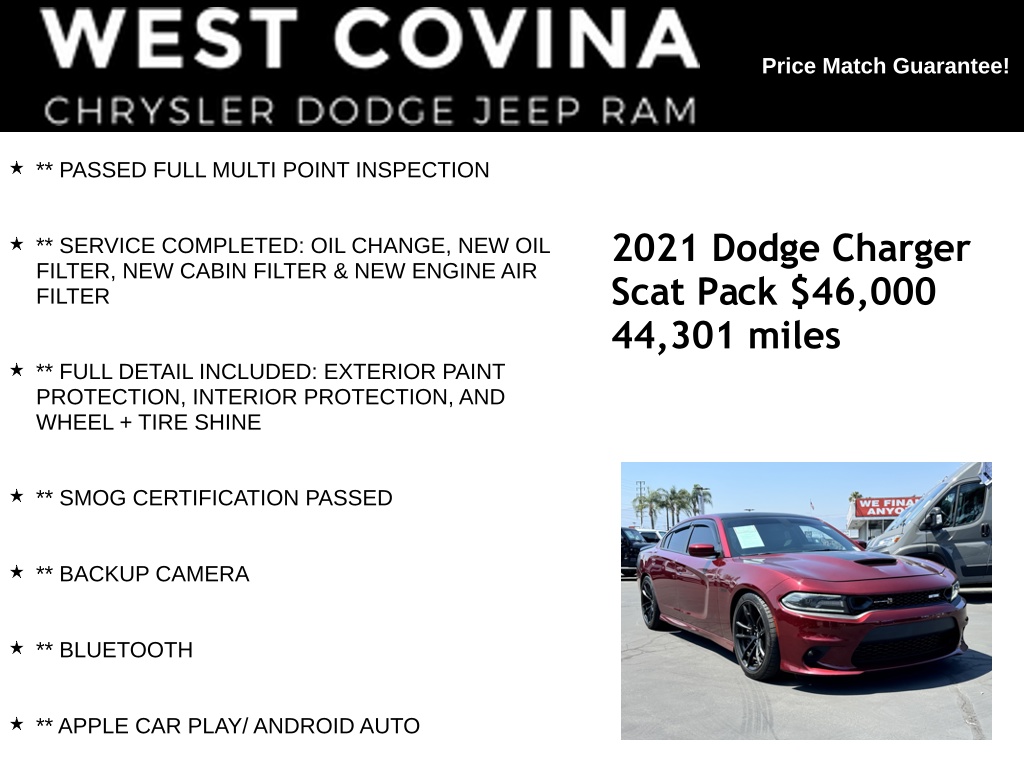 INDEPENDENCE DAY CELEBRATION HAS BEGUN. COME CHECK OUT OUR HARD TO BEAT INVENTORY PRICES. CALL (626) 899-9302 TO GET MORE INFORMATIONWE SPECIALIZE IN ALL CREDIT PROFILES! See what we can do for you! Call to find out (626) 899-9302.Recent Arrival! CARFAX One-Owner.** PASSED FULL MULTI POINT INSPECTION, ** SERVICE COMPLETED: OIL CHANGE, NEW OIL FILTER, NEW CABIN FILTER & NEW ENGINE AIR FILTER, ** FULL DETAIL INCLUDED: EXTERIOR PAINT PROTECTION, INTERIOR PROTECTION, AND WHEEL + TIRE SHINE, ** SMOG CERTIFICATION PASSED, ** BACKUP CAMERA, ** BLUETOOTH, ** APPLE CAR PLAY/ ANDROID AUTO, Black Artificial Leather.Octane Red Pearlcoat2021 Dodge Charger R/T Scat Pack RWD 8-Speed Automatic SRT HEMI 6.4L V8 MDS**********All Pricing and Advertised Prices for any/all vehicles offered for sale does not include dealer installed accessories which can be purchased for an additional cost.********** The Factory Rebates may not be available on this vehicle if you elect to take advantage of a Special Alternative APR or Special Lease program. Some Factory Rebates are California Resident specific and may vary for residents of other states. NO sales to Dealers, Brokers or Exporters. For out of state purchase, customers must be present to purchase. If shipping is required, dealership must facilitate; no exceptions. Please contact us for special Multi-Vehicle or Fleet pricing. Prices are plus government fees and taxes, any finance charges, $85 documentary fee, $29 electronic registration fee, any emission testing charge and $1.75 per new tire state tire fee. *** We make every effort to provide accurate information, but please verify before purchasing. Leasing & financing available on approved credit. Trade-ins accepted. Subject to prior sale.