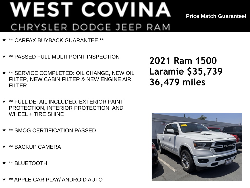 INDEPENDENCE DAY CELEBRATION HAS BEGUN. COME CHECK OUT OUR HARD TO BEAT INVENTORY PRICES. CALL (626) 899-9302 TO GET MORE INFORMATIONWE SPECIALIZE IN ALL CREDIT PROFILES! See what we can do for you! Call to find out (626) 899-9302.Recent Arrival! CARFAX One-Owner. Clean CARFAX.** CARFAX BUYBACK GUARANTEE **, ** PASSED FULL MULTI POINT INSPECTION, ** SERVICE COMPLETED: OIL CHANGE, NEW OIL FILTER, NEW CABIN FILTER & NEW ENGINE AIR FILTER, ** FULL DETAIL INCLUDED: EXTERIOR PAINT PROTECTION, INTERIOR PROTECTION, AND WHEEL + TIRE SHINE, ** SMOG CERTIFICATION PASSED, ** BACKUP CAMERA, ** BLUETOOTH, ** APPLE CAR PLAY/ ANDROID AUTO, Auto Dimming Exterior Passenger Mirror, Auto High Beam Headlamp Control, Bed Utility Group, Black Interior Accents, Blind Spot & Cross Path Detection, Body Color Door Handles, Body Color Exterior Mirrors, Body Color Front Bumper, Body Color Premium Power Mirrors, Body Color Rear Bumper w/Step Pads, Foam Bottle Insert (Door Trim Panel), Grille Surround 3 Body Color Tex 2 Black, Laramie Level 1 Equipment Group (DISC), MOPAR 4 Adjustable Cargo Tie-Down Hooks, MOPAR Deployable Bed Step, MOPAR Spray In Bedliner, ParkSense Front/Rear Park Assist w/Stop, Pick-Up Box Lighting, Quick Order Package 25H Laramie (DISC), Rain Sensitive Windshield Wipers, Rear 60/40 Folding Split Recline Seat, Remote Tailgate Release, Sport Appearance Package, Sport Decal, Sport Performance Hood, Tailgate Ajar Warning Lamp, Wheels: 20" x 9" Premium Painted w/Inserts.Bright White Clearcoat2021 Ram 1500 Laramie RWD 8-Speed Automatic HEMI 5.7L V8 Multi Displacement VVT**********All Pricing and Advertised Prices for any/all vehicles offered for sale does not include dealer installed accessories which can be purchased for an additional cost.********** The Factory Rebates may not be available on this vehicle if you elect to take advantage of a Special Alternative APR or Special Lease program. Some Factory Rebates are California Resident specific and may vary for residents of other states. NO sales to Dealers, Brokers or Exporters. For out of state purchase, customers must be present to purchase. If shipping is required, dealership must facilitate; no exceptions. Please contact us for special Multi-Vehicle or Fleet pricing. Prices are plus government fees and taxes, any finance charges, $85 documentary fee, $29 electronic registration fee, any emission testing charge and $1.75 per new tire state tire fee. *** We make every effort to provide accurate information, but please verify before purchasing. Leasing & financing available on approved credit. Trade-ins accepted. Subject to prior sale.Awards: * JD Power Automotive Performance, Execution and Layout (APEAL) Study * Motor Trend Automobiles of the year