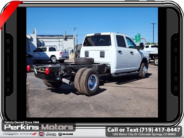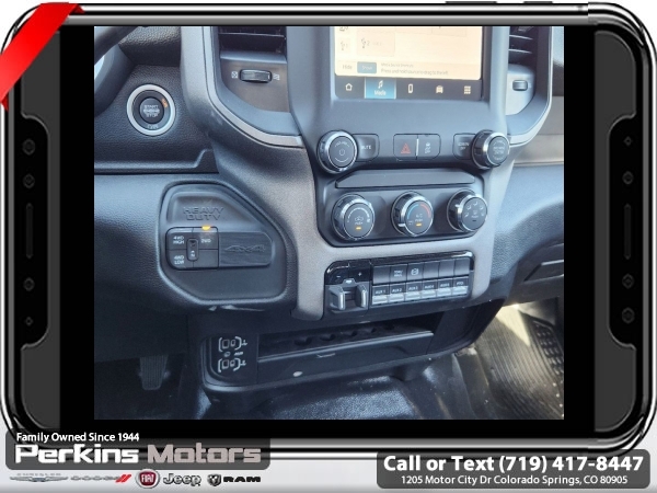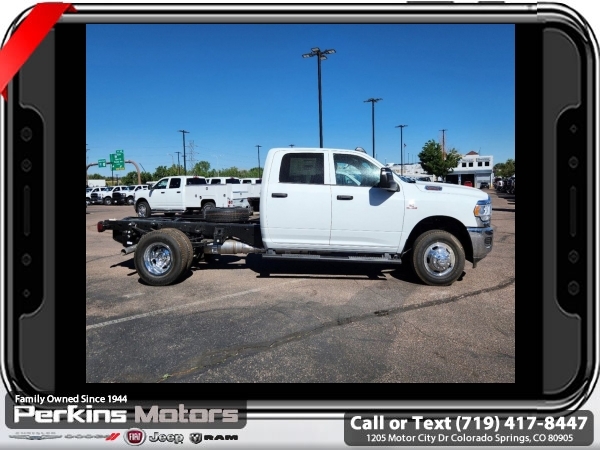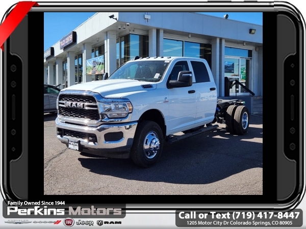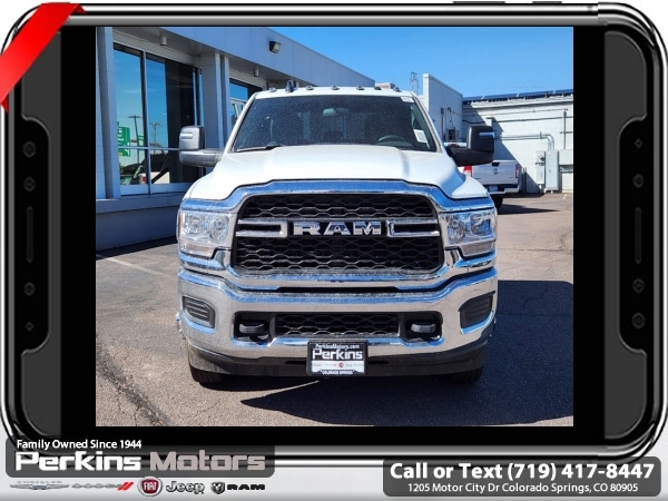 Factory MSRP: $77,465 Bright White Clearcoat 2024 Ram 3500 Tradesman 4WD Aisin 6-Speed Automatic Cummins 6.7L I6 Turbodiesel<br><br>Check us out at www.perkinsmotors.com to see our specials! Since opening our doors in 1944, we’ve been proud to serve Colorado Springs, CO, and the surrounding areas of Pueblo, Castle Rock and Denver, CO. Throughout this time of being family owned for 80 years, we’ve maintained a firm commitment to our customers: to offer a wide selection of New Chrysler, Dodge, Fiat, Jeep, and Ram vehicles and quality pre-owned vehicles, and provide a quick, no-hassle car-buying process that ensures everyone drives off the lot satisfied with their purchase.<br><br>Chrome Appearance Group (Bright Front Bumper, Bright Wheel Skins, Center Hub, Chrome Grille Surround, Chrome Headlamp Bezels, and Matte Black Mesh Grille w/Chrome), Cold Weather Group (Engine Block Heater and MOPAR Winter Front Grille Cover), Electrical Accessory Group (Voltage Monitoring Auto Idle Up System), Heavy Duty Snow Plow Prep Group, Max Tow Package (12.0 Dual Wheel Rear Axle and Add 4.10 Axle Ratio), Quick Order Package 2YA Tradesman (Black Exterior Truck Badging, Black Key Fob, Door Sill Scuff Pads, Glove Box, Halogen Quad Headlamps, Map/Courtesy Lamp, Matte Black Grille Surround, Overhead Console, Overhead Cupholder Lamp, and Rear Dome Lamp), 102 mph Maximum Speed, 11.50 Dual Wheels Rear Axle, 4-Wheel Disc Brakes, 4.10 Axle Ratio, 40/20/40 Split Bench Seat, 4G LTE Wi-Fi Hot Spot, 6 Speakers, 6000# Front Axle w/Hub Ext, 8.4 Touchscreen Display, ABS brakes, Air Conditioning, All R1 Low Radios, All Radio-Equipped Vehicles, Apple CarPlay, Bluetooth Handsfree Phone & Audio, Compass, Connectivity - US/Canada, Cruise Control, Delay-off headlights, Driver door bin, Dual front impact airbags, Dual Rear Wheels, Electric Shift-On-The-Fly Transfer Case, Electronic Stability Control, Emergency communication system: SiriusXM Guardian, Engine Calibration Flash, For Details, Visit DriveUconnect.com, For More Info, Call 800-643-2112, Front anti-roll bar, Front Bucket Seats, Front License Plate Bracket, Fully automatic headlights, Global Telematics Box Module (TBM), Google Android Auto, GPS Antenna Input, HD Vinyl 40/20/40 Split Bench Seat, Heated door mirrors, Integrated Center Stack Radio, Integrated Voice Command w/Bluetooth, LED Tail Lamps, Manual Adjust 4-Way Driver Seat, Manual Adjust 4-Way Front Passenger Seat, Manual DPF Regeneration, Manufacturer's Statement of Origin, Mopar Black Tubular Side Steps, MOPAR Front & Rear Rubber Floor Mats, Occupant sensing airbag, Outside temperature display, Overhead console, ParkView Rear Back-Up Camera, Passenger door bin, Passenger vanity mirror, Power door mirrors, Power steering, Power windows, Radio data system, Radio: Uconnect 3 w/5 Display, Radio: Uconnect 5 w/8.4 Display, Rear anti-roll bar, Rear Backup Alarm, Rear Folding Seat, Remote Keyless Entry, Remote USB Port - Charge Only, SiriusXM Radio Service, SiriusXM Satellite Radio, Storage Tray, Tachometer, Temperature & Compass Gauge, Tilt steering wheel, Tow Hooks, Traction control, Trailer Brake Control, Trailer Light Check, Turn signal indicator mirrors, Variably intermittent wipers, Voltmeter, Wheels: 17 x 6.0 Steel Chrome Clad, and Wheels: 18 x 8.0 SteeL. Sale price includes all manufacture's incentives and dealer discounts. Sale price not available on lease or compatible with special APR. $7335 - 2024 National Minimum Employee Pricing Discount . Exp. 06/02/2025 Price includes $15,995 in dealer added accessories.