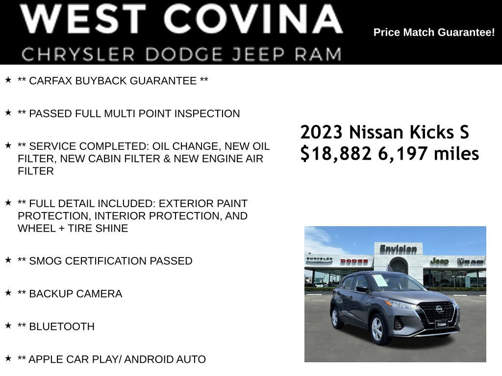 INDEPENDENCE DAY CELEBRATION HAS BEGUN. COME CHECK OUT OUR HARD TO BEAT INVENTORY PRICES. CALL (626) 899-9302 TO GET MORE INFORMATIONWE SPECIALIZE IN ALL CREDIT PROFILES! See what we can do for you! Call to find out (626) 899-9302.Recent Arrival! CARFAX One-Owner. Clean CARFAX.Odometer is 8701 miles below market average! 31/36 City/Highway MPG ** CARFAX BUYBACK GUARANTEE **, ** PASSED FULL MULTI POINT INSPECTION, ** SERVICE COMPLETED: OIL CHANGE, NEW OIL FILTER, NEW CABIN FILTER & NEW ENGINE AIR FILTER, ** FULL DETAIL INCLUDED: EXTERIOR PAINT PROTECTION, INTERIOR PROTECTION, AND WHEEL + TIRE SHINE, ** SMOG CERTIFICATION PASSED, ** BACKUP CAMERA, ** BLUETOOTH, ** APPLE CAR PLAY/ ANDROID AUTO.Gun Metallic2023 Nissan Kicks S FWD CVT with Xtronic 1.6L 4-Cylinder DOHC 16V**********All Pricing and Advertised Prices for any/all vehicles offered for sale does not include dealer installed accessories which can be purchased for an additional cost.********** The Factory Rebates may not be available on this vehicle if you elect to take advantage of a Special Alternative APR or Special Lease program. Some Factory Rebates are California Resident specific and may vary for residents of other states. NO sales to Dealers, Brokers or Exporters. For out of state purchase, customers must be present to purchase. If shipping is required, dealership must facilitate; no exceptions. Please contact us for special Multi-Vehicle or Fleet pricing. Prices are plus government fees and taxes, any finance charges, $85 documentary fee, $29 electronic registration fee, any emission testing charge and $1.75 per new tire state tire fee. *** We make every effort to provide accurate information, but please verify before purchasing. Leasing & financing available on approved credit. Trade-ins accepted. Subject to prior sale.