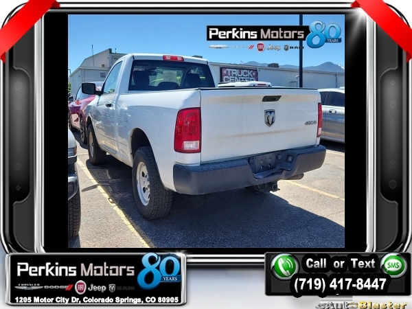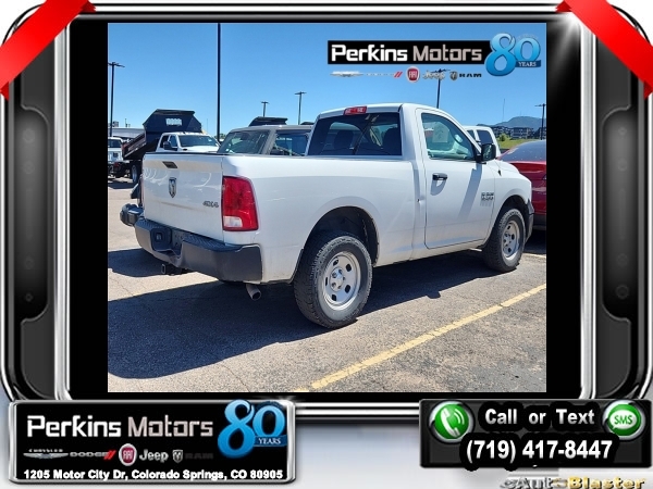 Bright White Clearcoat 4WD 3.6L V6 24V VVT 8-Speed Automatic<br><br><br>CARFAX One-Owner. Clean CARFAX.<br><br>Check us out at www.perkinsmotors.com to see our specials! Since opening our doors in 1944, we’ve been proud to serve Colorado Springs, CO, and the surrounding areas of Pueblo, Castle Rock and Denver, CO. Throughout this time of being family owned for 80 years, we’ve maintained a firm commitment to our customers: to offer a wide selection of New Chrysler, Dodge, Fiat, Jeep, and Ram vehicles and quality pre-owned vehicles, and provide a quick, no-hassle car-buying process that ensures everyone drives off the lot satisfied with their purchase.<br><br><br>Popular Equipment Group (40/20/40 Split Bench Seat, Cloth 40/20/40 Bench Seat, Front Armrest w/3 Cupholders, and SIRIUSXM Satellite Radio), Power & Remote Entry Group (Black Exterior Mirrors, Exterior Mirrors w/Heating Element, Premium Vinyl Door Trim w/Map Pocket, and Remote Keyless Entry w/All-Secure), Protection Group (Tow Hooks), Quick Order Package 22B Tradesman, Tradesman Package, 17 x 7 Steel Wheels, 3.21 Rear Axle Ratio, 4-Wheel Disc Brakes, 6 Speakers, ABS brakes, Active Grille Shutters, Air Conditioning, AM/FM radio, Audio Jack Input for Mobile Devices, Black Rotary Shifter, Brake assist, Center Hub, Charge Only Remote USB Port, Cruise Control, Delay-off headlights, Driver door bin, Dual front impact airbags, Dual front side impact airbags, Electronic Shift, Electronic Stability Control, Front anti-roll bar, Front Center Armrest, Front wheel independent suspension, Fully automatic headlights, Heavy Duty Vinyl 40/20/40 Split Bench Seat, Integrated Voice Command w/Bluetooth, Low tire pressure warning, Media Hub (USB, AUX), Occupant sensing airbag, Overhead airbag, ParkView Rear Back-Up Camera, Passenger door bin, Power steering, Radio data system, Radio: 3.0, Radio: Uconnect 5.0, Rear anti-roll bar, Rear step bumper, Rear View Mirror w/Microphone, Remote USB Port, Tachometer, Temperature & Compass Gauge, Tilt steering wheel, Tip Start, Traction control, Trailer Brake Control, Variably intermittent wipers, Vendor Painted Cargo Box Tracking, and Voltmeter.