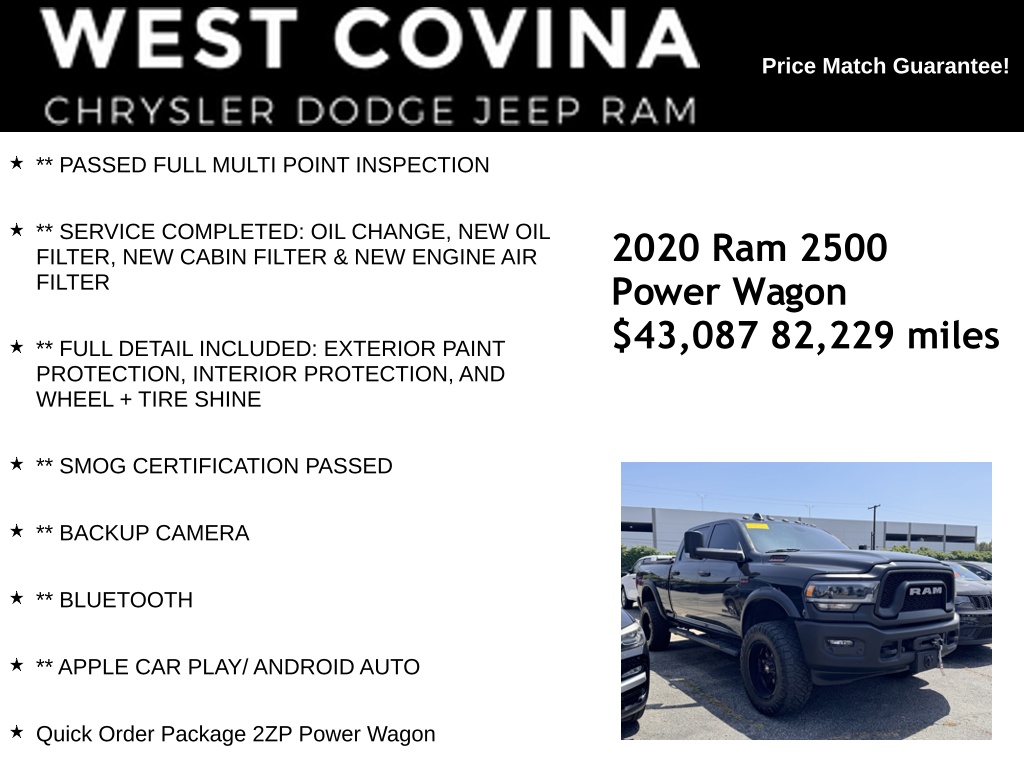 INDEPENDENCE DAY CELEBRATION HAS BEGUN. COME CHECK OUT OUR HARD TO BEAT INVENTORY PRICES. CALL (626) 899-9302 TO GET MORE INFORMATIONWE SPECIALIZE IN ALL CREDIT PROFILES! See what we can do for you! Call to find out (626) 899-9302.Recent Arrival! CARFAX One-Owner. Clean CARFAX.** PASSED FULL MULTI POINT INSPECTION, ** SERVICE COMPLETED: OIL CHANGE, NEW OIL FILTER, NEW CABIN FILTER & NEW ENGINE AIR FILTER, ** FULL DETAIL INCLUDED: EXTERIOR PAINT PROTECTION, INTERIOR PROTECTION, AND WHEEL + TIRE SHINE, ** SMOG CERTIFICATION PASSED, ** BACKUP CAMERA, ** BLUETOOTH, ** APPLE CAR PLAY/ ANDROID AUTO, 2nd Row In Floor Storage Bins, Foam Bottle Insert (Door Trim Panel), GPS Navigation, Heated Front Seats, Heated Steering Wheel, Power Adjustable Pedals, Power Wagon Level 1 Equipment Group, Quick Order Package 2ZP Power Wagon, Remote Start System, Remote Tailgate Release, Sun Visors w/Illuminated Vanity Mirrors, Universal Garage Door Opener.Diamond Black Crystal Pearlcoat2020 Ram 2500 Power Wagon 4WD 8-Speed Automatic 6.4L Heavy Duty V8 HEMI w/MDS**********All Pricing and Advertised Prices for any/all vehicles offered for sale does not include dealer installed accessories which can be purchased for an additional cost.********** The Factory Rebates may not be available on this vehicle if you elect to take advantage of a Special Alternative APR or Special Lease program. Some Factory Rebates are California Resident specific and may vary for residents of other states. NO sales to Dealers, Brokers or Exporters. For out of state purchase, customers must be present to purchase. If shipping is required, dealership must facilitate; no exceptions. Please contact us for special Multi-Vehicle or Fleet pricing. Prices are plus government fees and taxes, any finance charges, $85 documentary fee, $29 electronic registration fee, any emission testing charge and $1.75 per new tire state tire fee. *** We make every effort to provide accurate information, but please verify before purchasing. Leasing & financing available on approved credit. Trade-ins accepted. Subject to prior sale.Awards: * Motor Trend Automobiles of the year