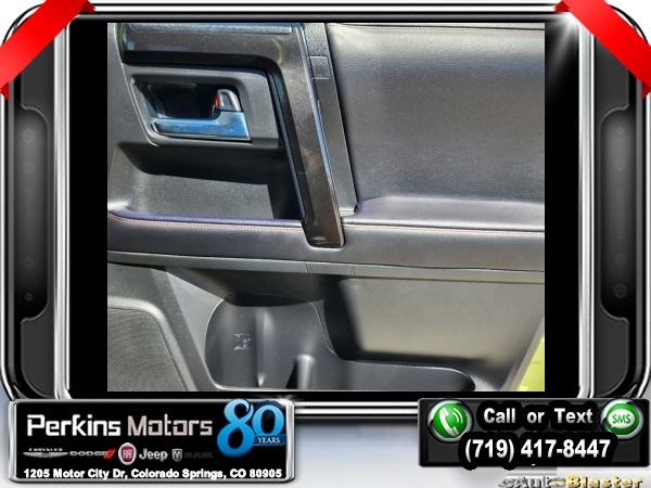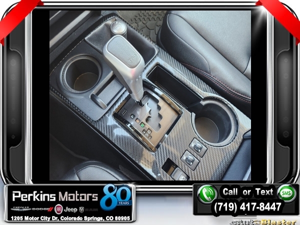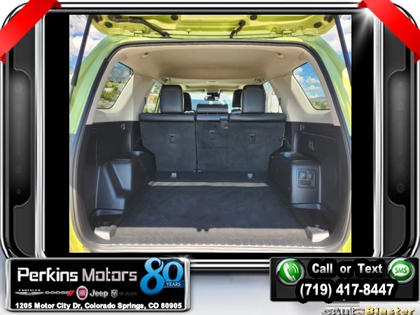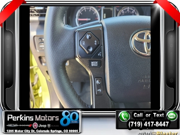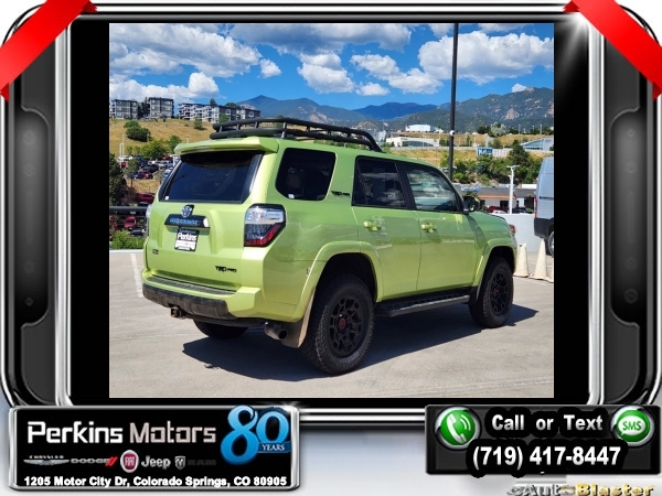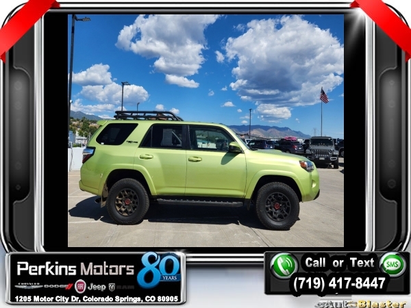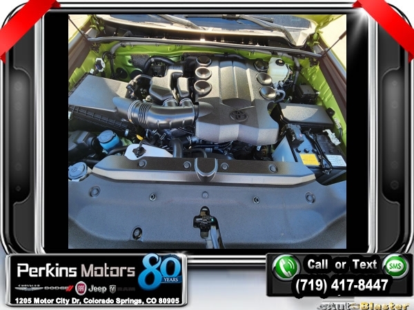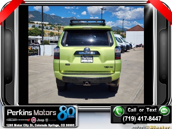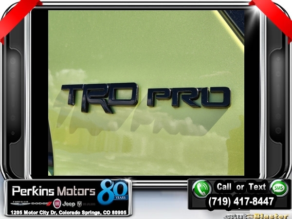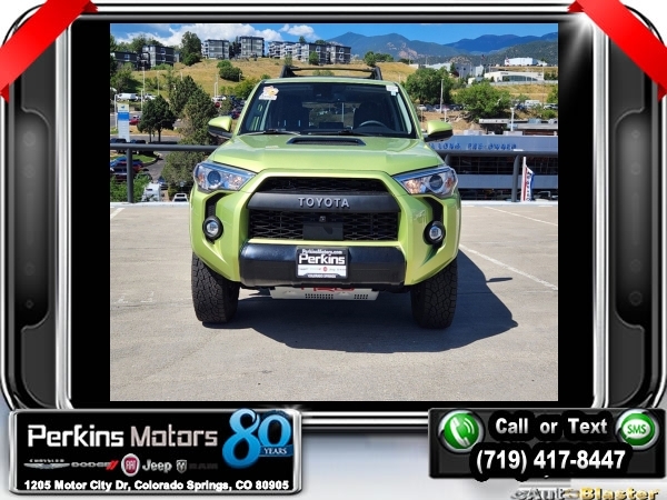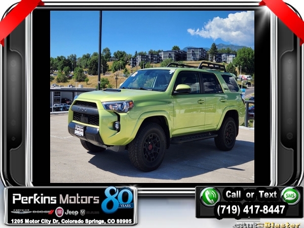 Lime Rush 4WD 4.0L V6 DOHC 24V 5-Speed with ECT<br><br>4WD, 15 Speakers, Black Lug Nuts, Blind Spot Monitor (BSM), Dual Zone Auto Climate Control, Fog Lights, Fox Shocks, Front dual zone A/C, Garage Door Opener, Multi-Terrain Back Monitor, Navigation System, Outside Rear View Mirror, Power driver seat, Power moonroof, Power Tilt & Slide Moonroof w/Sunshade, Radio: Premium Audio w/JBL, Roof Rack, TRD Badging, TRD Pro All Weather Floor Liner, TRD Pro Exhaust, TRD Pro Package, TRD Shift Knob, Wheel Locks.<br><br><br>Clean CARFAX.<br><br>Check us out at www.perkinsmotors.com to see our specials! Since opening our doors in 1944, we’ve been proud to serve Colorado Springs, CO, and the surrounding areas of Pueblo, Castle Rock and Denver, CO. Throughout this time of being family owned for 80 years, we’ve maintained a firm commitment to our customers: to offer a wide selection of New Chrysler, Dodge, Fiat, Jeep, and Ram vehicles and quality pre-owned vehicles, and provide a quick, no-hassle car-buying process that ensures everyone drives off the lot satisfied with their purchase.<br><br><br>TRD Pro Package (Black Lug Nuts, Blind Spot Monitor (BSM), Dual Zone Auto Climate Control, Fog Lights, Fox Shocks, Garage Door Opener, Multi-Terrain Back Monitor, Outside Rear View Mirror, Power Tilt & Slide Moonroof w/Sunshade, Roof Rack, TRD Badging, TRD Pro All Weather Floor Liner, TRD Pro Exhaust, TRD Shift Knob, and Wheel Locks), 4WD, 15 Speakers, Front dual zone A/C, Navigation System, Power driver seat, Power moonroof, Radio: Premium Audio w/JBL, 3.727 Axle Ratio, 4-Wheel Disc Brakes, ABS brakes, Air Conditioning, Alloy wheels, AM/FM radio: SiriusXM, Anti-whiplash front head restraints, Apple CarPlay/Android Auto, Auto High-beam Headlights, Auto-dimming Rear-View mirror, Automatic temperature control, Brake assist, Bumpers: body-color, Compass, Cruise Control, Driver door bin, Driver vanity mirror, Dual front impact airbags, Dual front side impact airbags, Electronic Stability Control, Emergency communication system: Safety Connect with 1-year trial, Front anti-roll bar, Front Bucket Seats, Front Center Armrest, Front fog lights, Front reading lights, Front wheel independent suspension, Garage door transmitter: HomeLink, Heated door mirrors, Heated Front Bucket Seats, Heated front seats, Illuminated entry, Knee airbag, Leather Shift Knob, Low tire pressure warning, Occupant sensing airbag, Outside temperature display, Overhead airbag, Overhead console, Panic alarm, Passenger door bin, Passenger vanity mirror, Power door mirrors, Power passenger seat, Power steering, Power windows, Rear anti-roll bar, Rear seat center armrest, Rear window defroster, Rear window wiper, Remote keyless entry, Roof rack, Security system, SofTex Seat Trim, Speed-sensing steering, Split folding rear seat, Spoiler, Steering wheel mounted audio controls, Tachometer, Telescoping steering wheel, Tilt steering wheel, Traction control, Trip computer, Turn signal indicator mirrors, Variably intermittent wipers, and Wheels: 17 Matte Black Flow-Formed TRD Alloy.