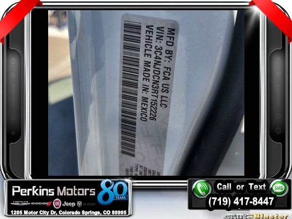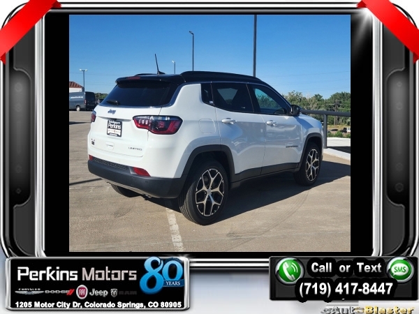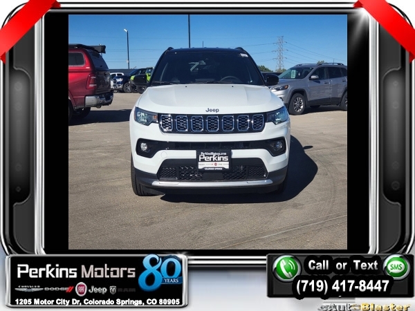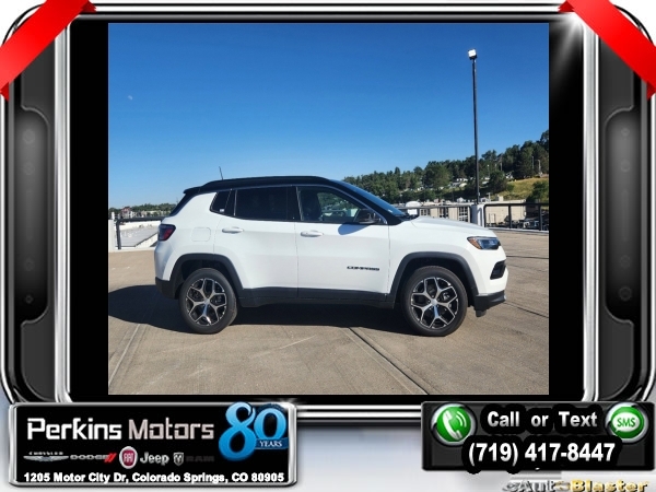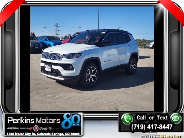 Factory MSRP: $35,340 $3,800 off MSRP! Bright White Clearcoat 2024 Jeep Compass Limited 4WD 8-Speed Automatic 2.0L I4 DOHC<br>4WD.<br>Check us out at www.perkinsmotors.com to see our specials! Since opening our doors in 1944, we’ve been proud to serve Colorado Springs, CO, and the surrounding areas of Pueblo, Castle Rock and Denver, CO. Throughout this time of being family owned for 80 years, we’ve maintained a firm commitment to our customers: to offer a wide selection of New Chrysler, Dodge, Fiat, Jeep, and Ram vehicles and quality pre-owned vehicles, and provide a quick, no-hassle car-buying process that ensures everyone drives off the lot satisfied with their purchase.<br><br>Quick Order Package 29G Limited, 4WD, 10.1 Touchscreen Display, 3.73 Final Drive Ratio, 4-Wheel Disc Brakes, 4G LTE Wi-Fi Hot Spot, 6 Speakers, ABS brakes, Air Conditioning, Alloy wheels, AM/FM radio: SiriusXM, Auto High-beam Headlights, Auto-dimming Rear-View mirror, Automatic temperature control, Brake assist, Bumpers: body-color, Compass, Cruise Control, Delay-off headlights, Disassociated Touchscreen Display, Driver door bin, Driver vanity mirror, Dual front impact airbags, Dual front side impact airbags, Electronic Stability Control, Emergency communication system: Jeep Connect, For Details, Visit DriveUconnect.com, For More Info, Call 800-643-2112, Four wheel independent suspension, Front anti-roll bar, Front Bucket Seats, Front Center Armrest w/Storage, Front dual zone A/C, Front fog lights, Front License Plate Bracket, Front reading lights, Fully automatic headlights, Global Telematics Box Module (TBM), Heated door mirrors, Heated front seats, Heated steering wheel, Illuminated entry, Knee airbag, Leather Shift Knob, Leather steering wheel, Leatherette Seats, Low tire pressure warning, Occupant sensing airbag, Outside temperature display, Overhead airbag, Overhead console, Panic alarm, ParkView Rear Back-Up Camera, Passenger door bin, Passenger vanity mirror, Power door mirrors, Power driver seat, Power steering, Power windows, Radio: Uconnect 5 w/10.1 Display, Rain sensing wipers, Rear anti-roll bar, Rear seat center armrest, Rear window defroster, Rear window wiper, Remote keyless entry, Roof rack: rails only, Security system, SiriusXM Guardian - Included Trial (B), SiriusXM Radio Service, Split folding rear seat, Spoiler, Steering wheel mounted audio controls, Tachometer, Telescoping steering wheel, Tilt steering wheel, Traction control, Trip computer, Turn signal indicator mirrors, Variably intermittent wipers, and Wheels: 18 x 7 Painted Diamond Cut AluminuM.<br><br>24/32 City/Highway MPG Sale price includes all manufacture's incentives and dealer discounts. Sale price not available on lease or compatible with special APR. $500 - 2024 National Retail Consumer Cash . Exp. 07/31/2024