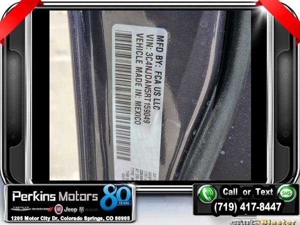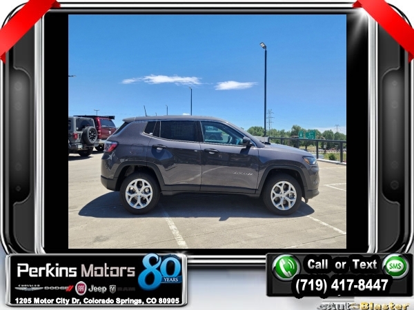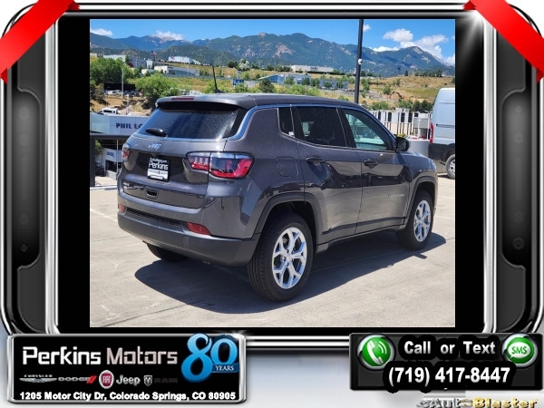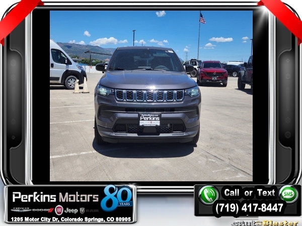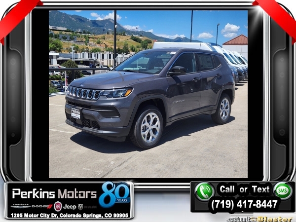 Factory MSRP: $28,090 $1,045 off MSRP! Baltic Gray Metallic Clearcoat 2024 Jeep Compass Sport 4WD 8-Speed Automatic 2.0L I4 DOHC<br>4WD.<br>Check us out at www.perkinsmotors.com to see our specials! Since opening our doors in 1944, we’ve been proud to serve Colorado Springs, CO, and the surrounding areas of Pueblo, Castle Rock and Denver, CO. Throughout this time of being family owned for 80 years, we’ve maintained a firm commitment to our customers: to offer a wide selection of New Chrysler, Dodge, Fiat, Jeep, and Ram vehicles and quality pre-owned vehicles, and provide a quick, no-hassle car-buying process that ensures everyone drives off the lot satisfied with their purchase.<br><br>Quick Order Package 29A, 4WD, 17 x 7 Aluminum Wheels, 3.73 Final Drive Ratio, 4-Wheel Disc Brakes, 6 Speakers, ABS brakes, Air Conditioning, Alloy wheels, AM/FM radio: SiriusXM, Brake assist, Bumpers: body-color, Cloth Low-Back Bucket Seats, Compass, Cruise Control, Delay-off headlights, Driver door bin, Driver vanity mirror, Dual front impact airbags, Dual front side impact airbags, Electronic Stability Control, Emergency communication system: Jeep Connect, Four wheel independent suspension, Front anti-roll bar, Front Bucket Seats, Front Center Armrest w/Storage, Front License Plate Bracket, Front reading lights, Fully automatic headlights, Heated door mirrors, Illuminated entry, Knee airbag, Leather steering wheel, Low tire pressure warning, Occupant sensing airbag, Outside temperature display, Overhead airbag, Overhead console, Panic alarm, ParkView Rear Back-Up Camera, Passenger door bin, Passenger vanity mirror, Power door mirrors, Power steering, Power windows, Radio: Uconnect 5 w/10.1 Display, Rear anti-roll bar, Rear seat center armrest, Rear window defroster, Rear window wiper, Remote keyless entry, Security system, Split folding rear seat, Spoiler, Steering wheel mounted audio controls, Tachometer, Telescoping steering wheel, Tilt steering wheel, Traction control, Trip computer, and Variably intermittent wipers.<br><br>24/32 City/Highway MPG