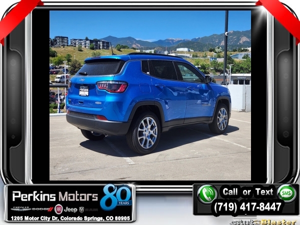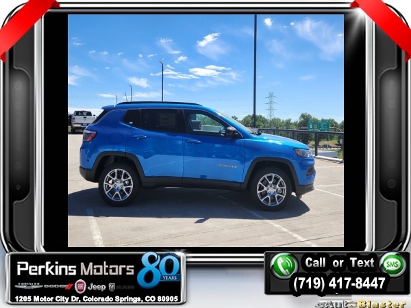 Factory MSRP: $34,085 $5,150 off MSRP! Priced below KBB Fair Purchase Price! Hydro Blue Pearlcoat 2024 Jeep Compass Latitude Lux 4WD 8-Speed Automatic 2.0L I4 DOHC<br>4WD.<br>Check us out at www.perkinsmotors.com to see our specials! Since opening our doors in 1944, we’ve been proud to serve Colorado Springs, CO, and the surrounding areas of Pueblo, Castle Rock and Denver, CO. Throughout this time of being family owned for 80 years, we’ve maintained a firm commitment to our customers: to offer a wide selection of New Chrysler, Dodge, Fiat, Jeep, and Ram vehicles and quality pre-owned vehicles, and provide a quick, no-hassle car-buying process that ensures everyone drives off the lot satisfied with their purchase.<br><br>Quick Order Package 29L, 4WD, 3.73 Final Drive Ratio, 4-Wheel Disc Brakes, 6 Speakers, ABS brakes, Air Conditioning, Alloy wheels, AM/FM radio: SiriusXM, Auto High-beam Headlights, Brake assist, Bumpers: body-color, Compass, Cruise Control, Delay-off headlights, Driver door bin, Driver vanity mirror, Dual front impact airbags, Dual front side impact airbags, Electronic Stability Control, Emergency communication system: Jeep Connect, Four wheel independent suspension, Front anti-roll bar, Front Bucket Seats, Front Center Armrest w/Storage, Front fog lights, Front License Plate Bracket, Front reading lights, Fully automatic headlights, Heated door mirrors, Heated front seats, Heated steering wheel, Illuminated entry, Knee airbag, Leather Shift Knob, Leather steering wheel, Leatherette Seats, Low tire pressure warning, Occupant sensing airbag, Outside temperature display, Overhead airbag, Overhead console, Panic alarm, ParkView Rear Back-Up Camera, Passenger door bin, Passenger vanity mirror, Power door mirrors, Power driver seat, Power steering, Power windows, Radio: Uconnect 5 w/10.1 Display, Rear anti-roll bar, Rear seat center armrest, Rear window defroster, Rear window wiper, Remote keyless entry, Roof rack: rails only, Security system, Split folding rear seat, Spoiler, Steering wheel mounted audio controls, Tachometer, Telescoping steering wheel, Tilt steering wheel, Traction control, Trip computer, Variably intermittent wipers, and Wheels: 18 x 7 Painted Aluminum.<br><br>24/32 City/Highway MPG Sale price includes all manufacture's incentives and dealer discounts. Sale price not available on lease or compatible with special APR. $2500 - 2024 Retail Bonus Cash. Exp. 09/30/2024 $500 - 2024 National Retail Consumer Cash . Exp. 09/30/2024 $1,000 - Exp. 09/30/2024