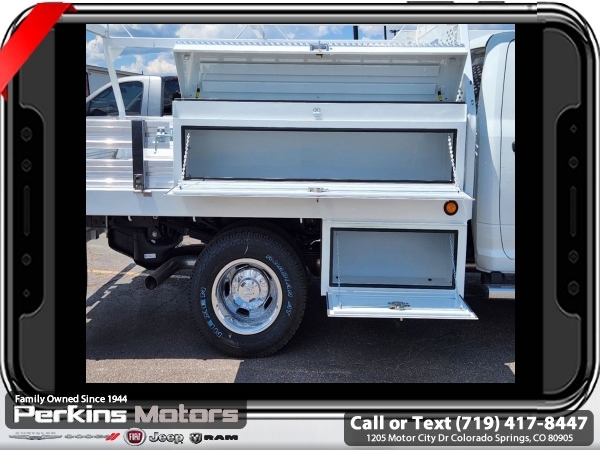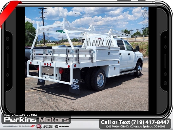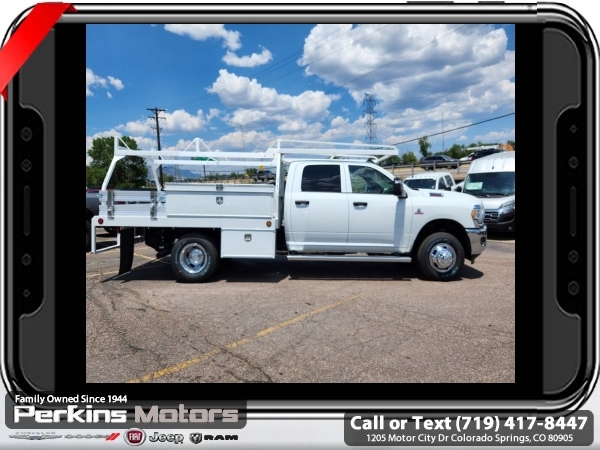 Factory MSRP: $75,240 Bright White Clearcoat 2024 Ram 3500 Tradesman 4WD Aisin 6-Speed Automatic Cummins 6.7L I6 Turbodiesel<br>SCELZI CONTRACTOR BED.<br>Check us out at www.perkinsmotors.com to see our specials! Since opening our doors in 1944, we’ve been proud to serve Colorado Springs, CO, and the surrounding areas of Pueblo, Castle Rock and Denver, CO. Throughout this time of being family owned for 80 years, we’ve maintained a firm commitment to our customers: to offer a wide selection of New Chrysler, Dodge, Fiat, Jeep, and Ram vehicles and quality pre-owned vehicles, and provide a quick, no-hassle car-buying process that ensures everyone drives off the lot satisfied with their purchase.<br><br>Chrome Appearance Group (Bright Front Bumper and Center Hub), Cold Weather Group (Engine Block Heater and MOPAR Winter Front Grille Cover), Heavy Duty Snow Plow Prep Group, Max Tow Package (12.0 Dual Wheel Rear Axle and Add 4.10 Axle Ratio), Quick Order Package 2YA Tradesman (Black Key Fob, Glove Box, Halogen Quad Headlamps, Map/Courtesy Lamp, and Rear Dome Lamp), 102 mph Maximum Speed, 115V Auxiliary Power Outlet, 4-Wheel Disc Brakes, 4.10 Axle Ratio, 40/20/40 Split Bench Seat, 6 Speakers, 6000# Front Axle w/Hub Ext, ABS brakes, Air Conditioning, Cargo & CHMSL Lamp, Compass, Cruise Control, Delay-off headlights, Driver door bin, Dual front impact airbags, Dual Rear Wheels, Electric Shift-On-The-Fly Transfer Case, Electronic Stability Control, Emergency communication system: SiriusXM Guardian, Engine Calibration Flash, For Details, Visit DriveUconnect.com, For More Info, Call 800-643-2112, Front anti-roll bar, Front Bucket Seats, Front Fog Lamps, Front License Plate Bracket, Fully automatic headlights, Global Telematics Box Module (TBM), GPS Antenna Input, HD Vinyl 40/20/40 Split Bench Seat, Heated door mirrors, Integrated Voice Command w/Bluetooth, Manual Adjust 4-Way Driver Seat, Manual Adjust 4-Way Front Passenger Seat, Occupant sensing airbag, Outside temperature display, Overhead console, Passenger door bin, Passenger vanity mirror, Power door mirrors, Power steering, Power windows, Radio data system, Radio: Uconnect 3 w/5 Display, Rear anti-roll bar, Rear Folding Seat, Remote Keyless Entry, Remote USB Port - Charge Only, SiriusXM Radio Service, Tachometer, Temperature & Compass Gauge, Tilt steering wheel, Tow Hooks, Traction control, Trailer Brake Control, Tubular Side Steps, Turn signal indicator mirrors, Variably intermittent wipers, Voltmeter, Wheels: 17 x 6.0 Steel Chrome Clad, and Wheels: 18 x 8.0 SteeL. Sale price includes all manufacture's incentives and dealer discounts. Sale price not available on lease or compatible with special APR. $1500 - 2024 National Stellantis Loyalty Bonus Cash . Exp. 04/30/2025 $2500 - 2024 National Truck Month Bonus Cash. Exp. 04/30/2025 Price includes $15,995 in dealer added accessories.