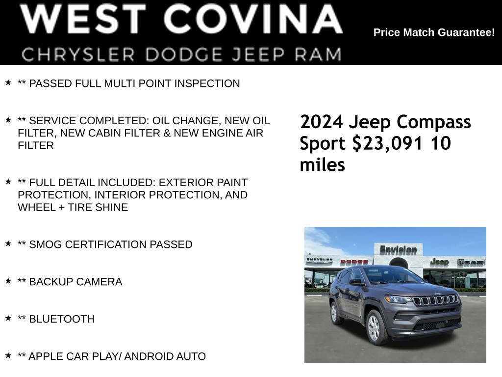 24/32 City/Highway MPG ** PASSED FULL MULTI POINT INSPECTION, ** SERVICE COMPLETED: OIL CHANGE, NEW OIL FILTER, NEW CABIN FILTER & NEW ENGINE AIR FILTER, ** FULL DETAIL INCLUDED: EXTERIOR PAINT PROTECTION, INTERIOR PROTECTION, AND WHEEL + TIRE SHINE, ** SMOG CERTIFICATION PASSED, ** BACKUP CAMERA, ** BLUETOOTH, ** APPLE CAR PLAY/ ANDROID AUTO, 4WD.Baltic Gray Metallic Clearcoat2024 Jeep Compass Sport 4WD 8-Speed Automatic 2.0L I4 DOHC