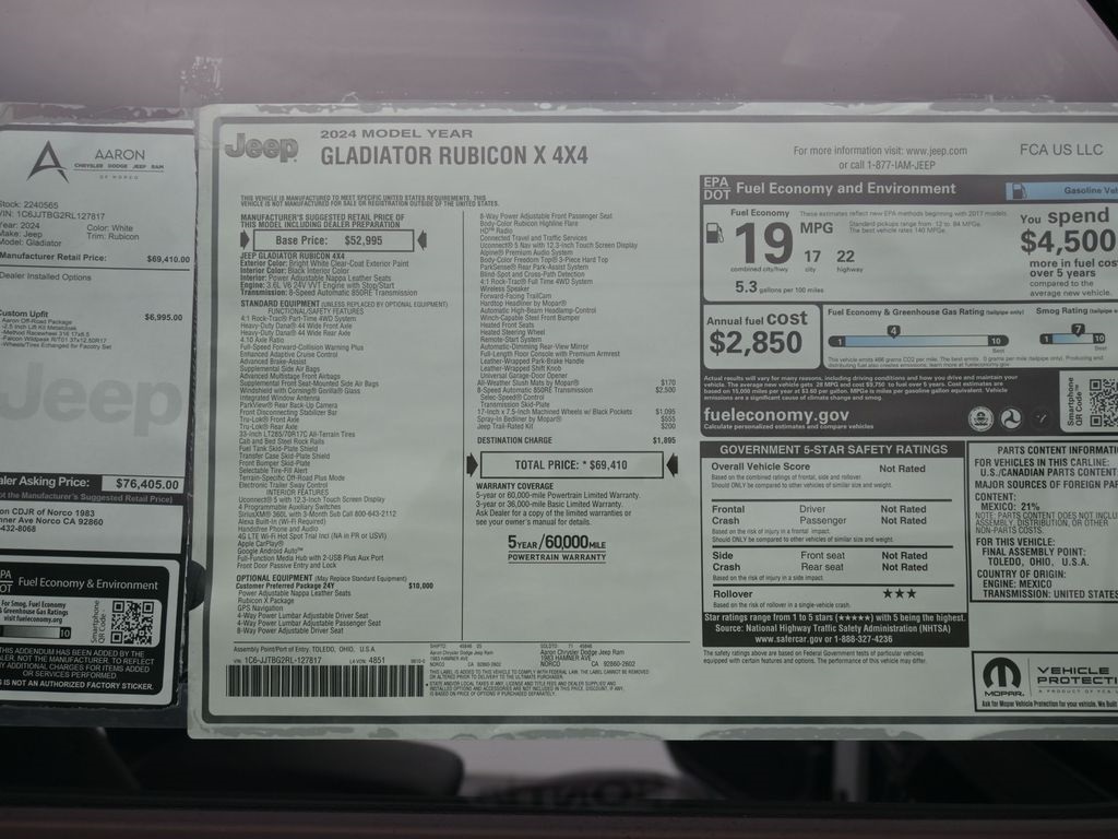 2024 Jeep Gladiator RubiconAaron Off-Road Package-2.5 Inch Lift Kit Metalcloak-Method Racewheel 316 17x8.5-Falcon Wildpeak R/T01 37x12.50R17-Wheels/Tires Echanged for Facotry Set Bright White Clearcoat Dealer Discount of $4,599 off MSRPExplore the latest models from Chrysler, Dodge, Jeep, and Ram at Aaron CDJR of Norco. Whether you're looking for a rugged Jeep Wrangler, a powerful Ram truck, or a sleek Chrysler sedan, our vast inventory has something for everyone. Experience exceptional customer service and find the perfect vehicle to match your lifestyle.4WD 8-Speed Automatic 3.6L V6 24V VVT Price includes: $3250 - 2024 Bonus Cash . Exp. 01/02/2025 $500 - 2024 National Holiday Bonus Cash. Exp. 01/02/2025
