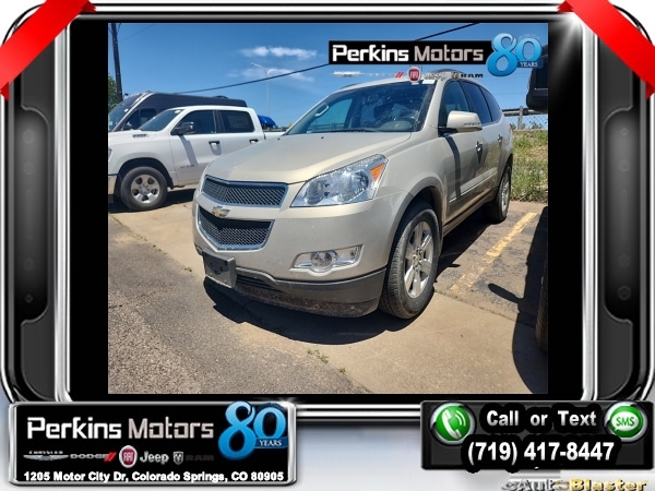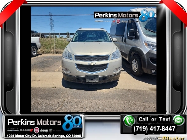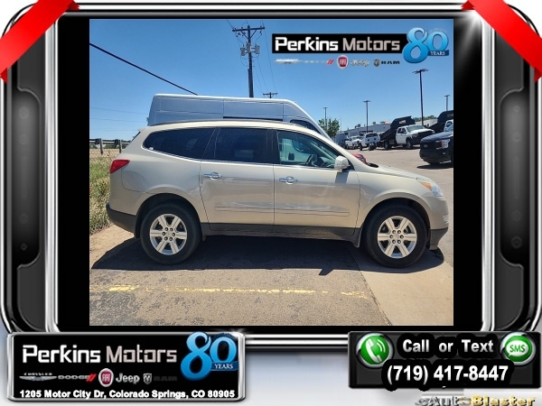 Gold Mist Metallic AWD 3.6L V6 SIDI 6-Speed Automatic Electronic with Overdrive<br><br>AWD, 18 x 7.5 Aluminum (4) Wheels, 3rd row seats: split-bench, 6 Speakers, 8-Passenger Seating (2-3-3 Seating Configuration), 8-Way Power Driver Seat w/Power Lumbar, Air Conditioning, AM/FM Stereo w/MP3 Compatible CD Player, Bluetooth® For Phone, Body-Color Bodyside Moldings, Body-Color Heated Power-Adjustable Outside Mirrors, Enhanced Driver Information Center, Front License Plate Bracket Mounting Package, Preferred Equipment Group 1LT, Rear air conditioning, Rear Park Assist, Redundant Audio Controls on Steering Wheel, Single-Zone Manual Front Climate Control, SIRIUSXM Satellite Radio, Variable Effort Power Steering.<br><br><br>CARFAX One-Owner. Clean CARFAX.<br><br>Check us out at www.perkinsmotors.com to see our specials! Since opening our doors in 1944, we’ve been proud to serve Colorado Springs, CO, and the surrounding areas of Pueblo, Castle Rock and Denver, CO. Throughout this time of being family owned for 80 years, we’ve maintained a firm commitment to our customers: to offer a wide selection of New Chrysler, Dodge, Fiat, Jeep, and Ram vehicles and quality pre-owned vehicles, and provide a quick, no-hassle car-buying process that ensures everyone drives off the lot satisfied with their purchase.<br><br>Reviews:<br> * If you need a vehicle big enough to haul your family and a 5,400-pound trailer, but you don’t want a big, gas-thirsty SUV, the 2012 Chevrolet Traverse is the perfect solution. Roomy yet manageably sized, the Traverse is the ideal family wagon. Source: KBB.com<br> * Compliant ride; seating for as many as eight passengers; adult-friendly third-row seat; massive cargo area; top safety scores. Source: Edmunds<br><br><br>Awards:<br> * 2012 IIHS Top Safety Pick * 2012 KBB.com Best Resale Value Awards<br><br>Front License Plate Bracket Mounting Package, Preferred Equipment Group 1LT (8-Way Power Driver Seat w/Power Lumbar, Bluetooth® For Phone, Body-Color Bodyside Moldings, Body-Color Heated Power-Adjustable Outside Mirrors, Enhanced Driver Information Center, Rear Park Assist, Redundant Audio Controls on Steering Wheel, Single-Zone Manual Front Climate Control, Variable Effort Power Steering, Digital Compass, Integral Spotter Mirrors, and Leather-Wrapped Steering Wheel), AWD, 18 x 7.5 Aluminum (4) Wheels, 3rd row seats: split-bench, 6 Speakers, 8-Passenger Seating (2-3-3 Seating Configuration), Air Conditioning, AM/FM Stereo w/MP3 Compatible CD Player, Rear air conditioning, SIRIUSXM Satellite Radio, 3.16 Axle Ratio, 4-Wheel Disc Brakes, ABS brakes, Alloy wheels, AM/FM radio: SiriusXM, Bodyside moldings, Brake assist, Bumpers: body-color, CD player, Compass, Cruise Control, Delay-off headlights, Driver door bin, Driver vanity mirror, Dual front impact airbags, Dual front side impact airbags, Electronic Stability Control, Emergency communication system: OnStar Directions & Connections, Four wheel independent suspension, Front anti-roll bar, Front Bucket Seats, Front Center Armrest w/Storage, Front reading lights, Fully automatic headlights, Heated door mirrors, Illuminated entry, Low tire pressure warning, Occupant sensing airbag, Outside temperature display, Overhead airbag, Panic alarm, Passenger door bin, Passenger vanity mirror, Power door mirrors, Power driver seat, Power steering, Power windows, Premium Cloth Seat Trim, Radio data system, Rear anti-roll bar, Rear reading lights, Rear seat center armrest, Rear window defroster, Rear window wiper, Reclining Front Bucket Seats, Remote keyless entry, Roof rack: rails only, Security system, Speed-sensing steering, Split folding rear seat, Spoiler, Steering wheel mounted audio controls, Tachometer, Telescoping steering wheel, Tilt steering wheel, Traction control, Trip computer, Turn signal indicator mirrors, Variably intermittent wipers, and Voltmeter.