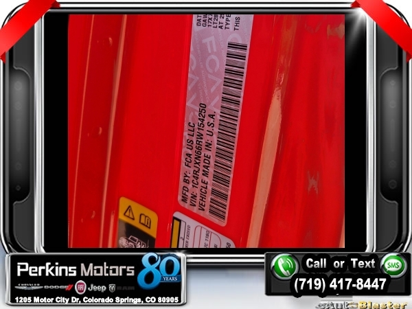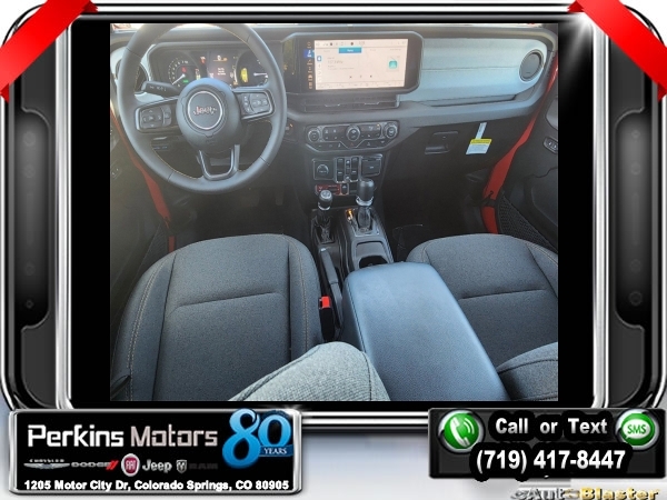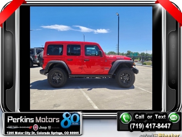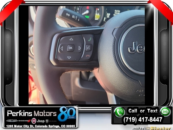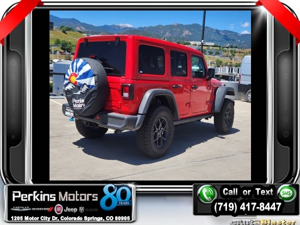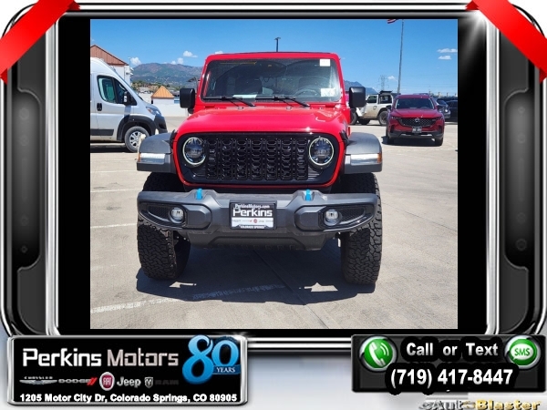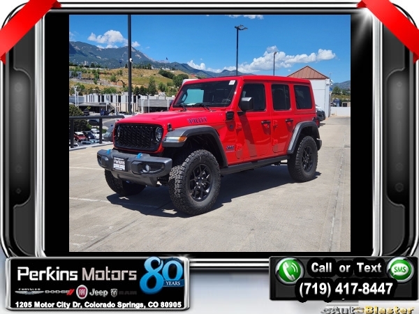 Factory MSRP: $65,210 $10,161 off MSRP! Priced below KBB Fair Purchase Price! Firecracker Red Clearcoat 2024 Jeep Wrangler Willys 4xe 4WD 8-Speed Automatic 2.0L I4 DOHC<br>2.0L I4 DOHC.<br>Check us out at www.perkinsmotors.com to see our specials! Since opening our doors in 1944, we’ve been proud to serve Colorado Springs, CO, and the surrounding areas of Pueblo, Castle Rock and Denver, CO. Throughout this time of being family owned for 80 years, we’ve maintained a firm commitment to our customers: to offer a wide selection of New Chrysler, Dodge, Fiat, Jeep, and Ram vehicles and quality pre-owned vehicles, and provide a quick, no-hassle car-buying process that ensures everyone drives off the lot satisfied with their purchase.<br><br>Convenience Group (2-Door Passive Entry, Front Door Locks, Heated Steering Wheel, and Universal Garage Door Opener), Quick Order Package 29W Willys (7 & 4 Pin Wiring Harness, Black Grille, Conventional Differential Front Axle, Wheels: 17 x 7.5 Painted Black, and Willys 4xe Hood Decal), Technology Group (Alpine Premium Audio System), 2.0L I4 DOHC, 3.73 Rear Axle Ratio, 4-Wheel Disc Brakes, 8 Speakers, ABS brakes, Air Conditioning, Alloy wheels, Apple CarPlay/Android Auto, Automatic temperature control, Brake assist, Cloth Low-Back Bucket Seats, Compass, Cruise Control, Delay-off headlights, Driver door bin, Driver vanity mirror, Dual front impact airbags, Dual front side impact airbags, Electronic Stability Control, Front anti-roll bar, Front Bucket Seats, Front Center Armrest w/Storage, Front dual zone A/C, Front fog lights, Front License Plate Bracket, Front reading lights, Fully automatic headlights, Heated door mirrors, Illuminated entry, Integrated roll-over protection, Low tire pressure warning, Occupant sensing airbag, Outside temperature display, Overhead airbag, Panic alarm, ParkView Rear Back-Up Camera, Passenger door bin, Passenger vanity mirror, Power door mirrors, Power steering, Power windows, Radio data system, Radio: Uconnect 5 w/12.3 Display, Rear anti-roll bar, Rear reading lights, Remote keyless entry, Removable Rear Quarter Windows, Security system, Sky 1-Touch Power Top, Split folding rear seat, Sport Suspension, Steering wheel mounted audio controls, Tachometer, Telescoping steering wheel, Tilt steering wheel, Traction control, Trip computer, Variably intermittent wipers, Voltmeter, and Wheels: 20 x 8 Machined/Painted Gray. Sale price includes all manufacture's incentives and dealer discounts. Sale price not available on lease or compatible with special APR. $3000 - 2024 National Retail Consumer Cash . Exp. 07/01/2024 $3750 - Federal EV Tax Credit. Exp. 12/31/2024