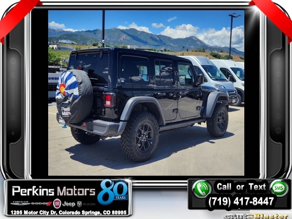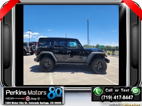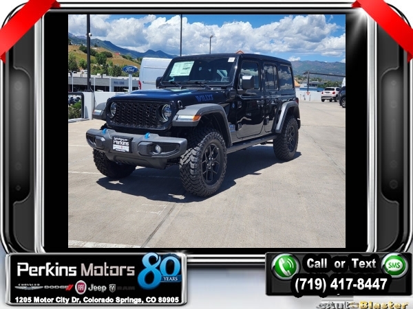 Factory MSRP: $65,210 $7,161 off MSRP! Priced below KBB Fair Purchase Price! Black Clearcoat 2024 Jeep Wrangler Willys 4xe 4WD 8-Speed Automatic 2.0L I4 DOHC<br>2.0L I4 DOHC.<br>Check us out at www.perkinsmotors.com to see our specials! Since opening our doors in 1944, we’ve been proud to serve Colorado Springs, CO, and the surrounding areas of Pueblo, Castle Rock and Denver, CO. Throughout this time of being family owned for 80 years, we’ve maintained a firm commitment to our customers: to offer a wide selection of New Chrysler, Dodge, Fiat, Jeep, and Ram vehicles and quality pre-owned vehicles, and provide a quick, no-hassle car-buying process that ensures everyone drives off the lot satisfied with their purchase.<br><br>Convenience Group (2-Door Passive Entry, Front Door Locks, Heated Steering Wheel, and Universal Garage Door Opener), Quick Order Package 29W Willys (7 & 4 Pin Wiring Harness, Black Grille, Conventional Differential Front Axle, Wheels: 17 x 7.5 Painted Black, and Willys 4xe Hood Decal), Technology Group (Alpine Premium Audio System), 2.0L I4 DOHC, 3.73 Rear Axle Ratio, 4-Wheel Disc Brakes, 8 Speakers, ABS brakes, Air Conditioning, Alloy wheels, Apple CarPlay/Android Auto, Automatic temperature control, Brake assist, Cloth Low-Back Bucket Seats, Compass, Cruise Control, Delay-off headlights, Driver door bin, Driver vanity mirror, Dual front impact airbags, Dual front side impact airbags, Electronic Stability Control, Front anti-roll bar, Front Bucket Seats, Front Center Armrest w/Storage, Front dual zone A/C, Front fog lights, Front License Plate Bracket, Front reading lights, Fully automatic headlights, Heated door mirrors, Illuminated entry, Integrated roll-over protection, Low tire pressure warning, Occupant sensing airbag, Outside temperature display, Overhead airbag, Panic alarm, ParkView Rear Back-Up Camera, Passenger door bin, Passenger vanity mirror, Power door mirrors, Power steering, Power windows, Radio data system, Radio: Uconnect 5 w/12.3 Display, Rear anti-roll bar, Rear reading lights, Remote keyless entry, Removable Rear Quarter Windows, Security system, Sky 1-Touch Power Top, Split folding rear seat, Sport Suspension, Steering wheel mounted audio controls, Tachometer, Telescoping steering wheel, Tilt steering wheel, Traction control, Trip computer, Variably intermittent wipers, Voltmeter, and Wheels: 20 x 8 Machined/Painted Gray. Sale price includes all manufacture's incentives and dealer discounts. Sale price not available on lease or compatible with special APR. $3000 - 2024 National Retail Consumer Cash . Exp. 07/31/2024 $3750 - Federal EV Tax Credit. Exp. 12/31/2024