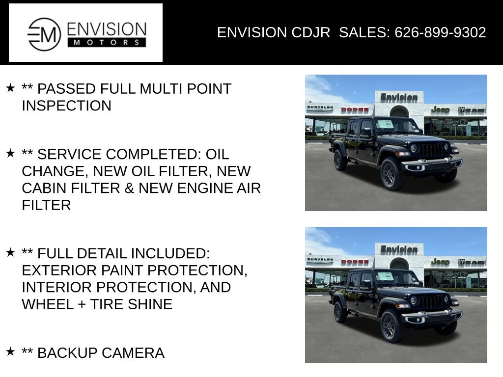 ** PASSED FULL MULTI POINT INSPECTION, ** SERVICE COMPLETED: OIL CHANGE, NEW OIL FILTER, NEW CABIN FILTER & NEW ENGINE AIR FILTER, ** FULL DETAIL INCLUDED: EXTERIOR PAINT PROTECTION, INTERIOR PROTECTION, AND WHEEL + TIRE SHINE, ** BACKUP CAMERA, ** BLUETOOTH, ** APPLE CAR PLAY/ ANDROID AUTO, Advanced Brake Assist, Air Conditioning w/Auto Temperature Control, Auto High Beam Headlamp Control, Automatic Headlamps, Blind Spot & Cross Path Detection, Body Color 3-Piece Hard Top, Body Color Fender Flares (2-Piece), Cluster 7.0" TFT Color Display, Convenience Group, Corning Gorilla Glass, Daytime Running Lamp System, Deep Tint Sunscreen Windows, Emergency/Assistance Call, Enhanced Adaptive Cruise Control, Front 1-Touch Down Power Windows, Front Door Locks 2-Door Passive Entry, Full Speed Forward Collision Warning Plus, Heated Front Seats, Heated Steering Wheel, LED Taillamps, Normal Duty Plus Suspension, ParkSense Rear Park Assist System, Power Heated Mirrors, Power Tailgate Lock, Premium Wrapped Steering Wheel, Quick Order Package 24S Sport S, Remote Keyless Entry, Remote Start System, Safety Group, Security Alarm, Speed Sensitive Power Locks, Sun Visors w/Illuminated Vanity Mirrors, Universal Garage Door Opener, Wheels: 17" x 7.5" Gray.Black Clearcoat2024 Jeep Gladiator Sport S 4X4 4WD 8-Speed Automatic 3.6L V6 24V VVT Price includes: $500 - 2024 National 2024 First Responder Bonus Cash. Exp. 06/30/2025 15% Msrp - 2024 National Standalone 15% Below MSRP (1/B/L/E) . Exp. 04/30/2025