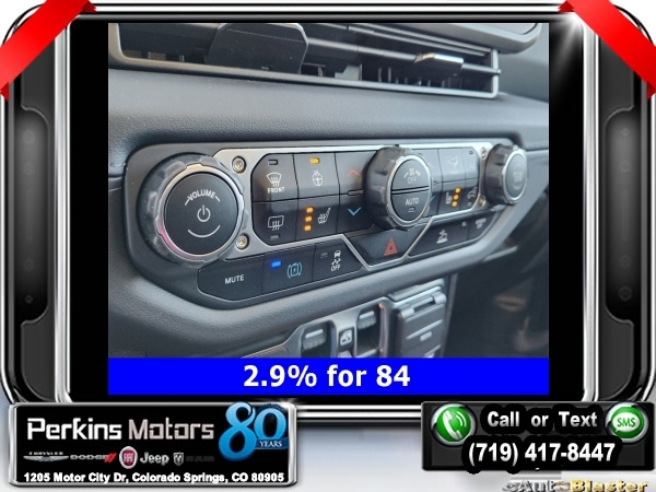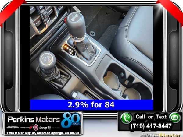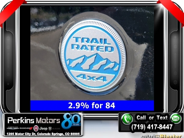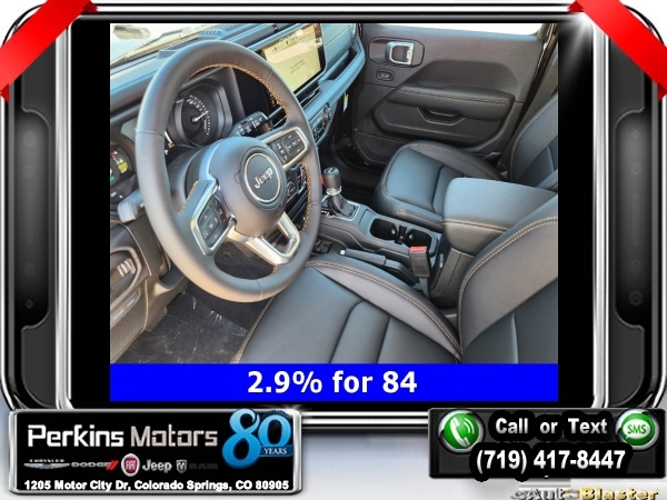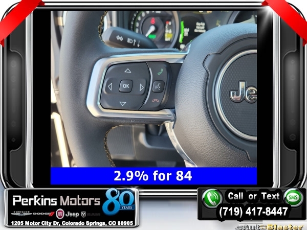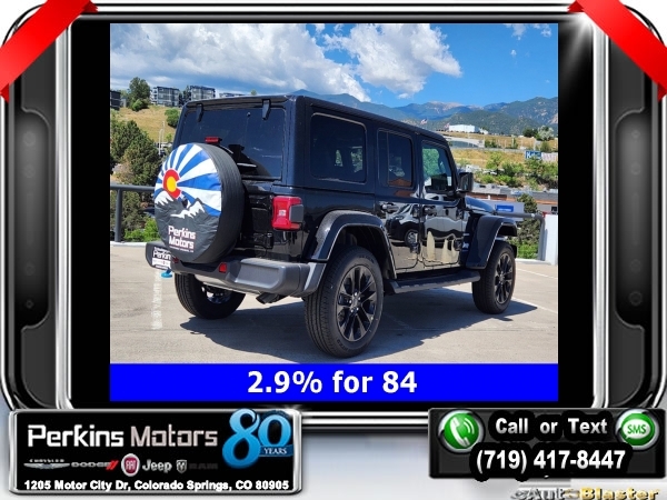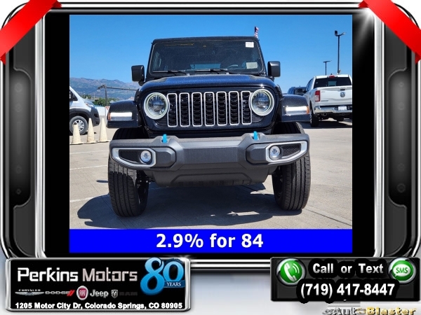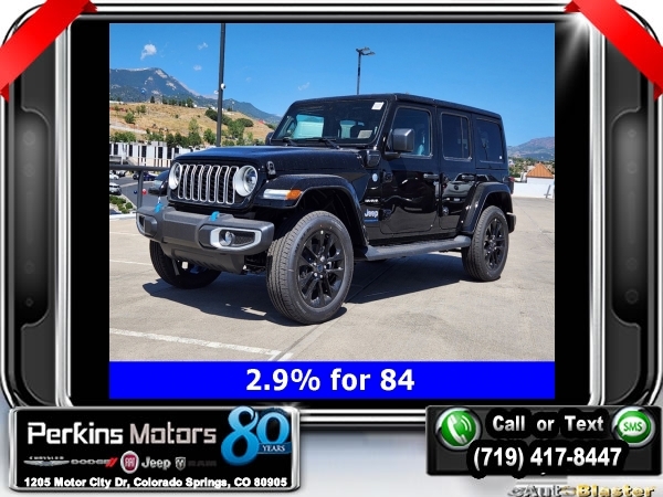 Factory MSRP: $66,465 $14,750 off MSRP! Priced below KBB Fair Purchase Price! Black Clearcoat 2024 Jeep Wrangler Sahara 4xe 4WD 8-Speed Automatic 2.0L I4 DOHC<br>2.0L I4 DOHC, ABS brakes, Adaptive Cruise Control, Alloy wheels, Compass, Electronic Stability Control, Front dual zone A/C, Heated door mirrors, Heated front seats, Illuminated entry, Low tire pressure warning, ParkView Rear Back-Up Camera, Passenger door bin, Remote keyless entry, Traction control.<br>Check us out at www.perkinsmotors.com to see our specials! Since opening our doors in 1944, we’ve been proud to serve Colorado Springs, CO, and the surrounding areas of Pueblo, Castle Rock and Denver, CO. Throughout this time of being family owned for 80 years, we’ve maintained a firm commitment to our customers: to offer a wide selection of New Chrysler, Dodge, Fiat, Jeep, and Ram vehicles and quality pre-owned vehicles, and provide a quick, no-hassle car-buying process that ensures everyone drives off the lot satisfied with their purchase.<br><br>2.0L I4 DOHC, ABS brakes, Adaptive Cruise Control, Alloy wheels, Compass, Electronic Stability Control, Front dual zone A/C, Heated door mirrors, Heated front seats, Illuminated entry, Low tire pressure warning, ParkView Rear Back-Up Camera, Passenger door bin, Remote keyless entry, Traction control, 12.3 Touchscreen Display, 3.73 Rear Axle Ratio, 4-Wheel Disc Brakes, 4G LTE Wi-Fi Hot Spot, 8 Speakers, Air Conditioning, AM/FM radio: SiriusXM, Apple CarPlay, Apple CarPlay/Android Auto, Automatic temperature control, Brake assist, Cloth Low-Back Bucket Seats, Connectivity - US/Canada, Cruise Control, Delay-off headlights, Disassociated Touchscreen Display, Driver door bin, Driver vanity mirror, Dual front impact airbags, Dual front side impact airbags, Front anti-roll bar, Front Bucket Seats, Front Center Armrest w/Storage, Front fog lights, Front reading lights, Fully automatic headlights, Google Android Auto, Heated steering wheel, Integrated Center Stack Radio, Integrated roll-over protection, Integrated Voice Command w/Bluetooth, Occupant sensing airbag, Outside temperature display, Overhead airbag, Panic alarm, Passenger vanity mirror, Power door mirrors, Power steering, Power windows, Radio data system, Radio: Uconnect 5 w/12.3 Display, Rear anti-roll bar, Rear reading lights, Rear seat center armrest, Security system, Split folding rear seat, Sport Suspension, Steering wheel mounted audio controls, Tachometer, Telescoping steering wheel, Tilt steering wheel, Trip computer, Variably intermittent wipers, Voltmeter, and Wheels: 20 x 8 Painted Black Aluminum. Sale price includes all manufacture's incentives and dealer discounts. Sale price not available on lease or compatible with special APR. $3750 - Federal EV Tax Credit. Exp. 12/31/2024 $7500 - 2024 National Retail Consumer Cash . Exp. 10/31/2024