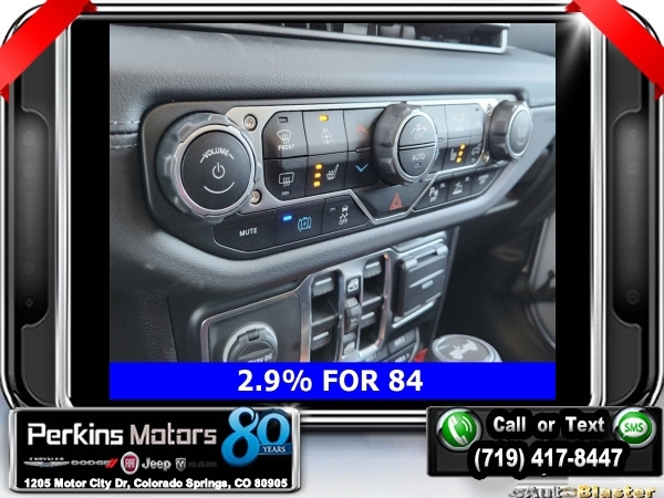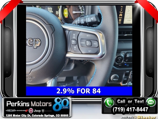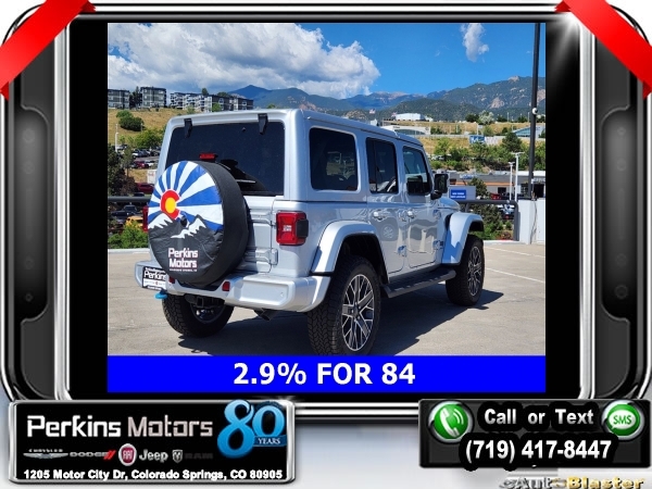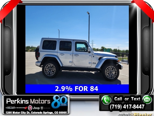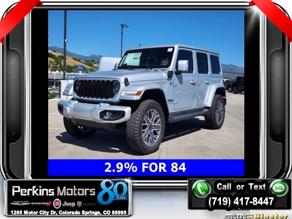 Factory MSRP: $71,650 $14,750 off MSRP! Priced below KBB Fair Purchase Price! Silver Zynith Clearcoat 2024 Jeep Wrangler High Altitude 4xe 4WD 8-Speed Automatic 2.0L I4 DOHC<br>2.0L I4 DOHC, ABS brakes, Adaptive Cruise Control, Alloy wheels, Compass, Electronic Stability Control, Front dual zone A/C, Heated door mirrors, Heated front seats, Illuminated entry, Low tire pressure warning, Navigation System, ParkView Rear Back-Up Camera, Passenger door bin, Remote keyless entry, Traction control.<br>Check us out at www.perkinsmotors.com to see our specials! Since opening our doors in 1944, we’ve been proud to serve Colorado Springs, CO, and the surrounding areas of Pueblo, Castle Rock and Denver, CO. Throughout this time of being family owned for 80 years, we’ve maintained a firm commitment to our customers: to offer a wide selection of New Chrysler, Dodge, Fiat, Jeep, and Ram vehicles and quality pre-owned vehicles, and provide a quick, no-hassle car-buying process that ensures everyone drives off the lot satisfied with their purchase.<br><br>2.0L I4 DOHC, ABS brakes, Adaptive Cruise Control, Alloy wheels, Compass, Electronic Stability Control, Front dual zone A/C, Heated door mirrors, Heated front seats, Illuminated entry, Low tire pressure warning, Navigation System, ParkView Rear Back-Up Camera, Passenger door bin, Remote keyless entry, Traction control, 3.73 Rear Axle Ratio, 4-Wheel Disc Brakes, 9 Speakers, Air Conditioning, AM/FM radio: SiriusXM with 360L, Apple CarPlay/Android Auto, Auto High-beam Headlights, Auto-dimming Rear-View mirror, Automatic temperature control, Brake assist, Bumpers: body-color, Convertible HardTop, Cruise Control, Delay-off headlights, Driver door bin, Driver vanity mirror, Dual front impact airbags, Dual front side impact airbags, Front anti-roll bar, Front Bucket Seats, Front Center Armrest w/Storage, Front fog lights, Front reading lights, Fully automatic headlights, Glass rear window, Heated steering wheel, Integrated roll-over protection, Leather Shift Knob, Nappa Leather Seats, Occupant sensing airbag, Outside temperature display, Overhead airbag, Panic alarm, Passenger vanity mirror, Power door mirrors, Power driver seat, Power passenger seat, Power steering, Power windows, Radio data system, Radio: Uconnect 5 Nav w/12.3 Display, Rear anti-roll bar, Rear reading lights, Rear seat center armrest, Rear window defroster, Rear window wiper, Security system, Split folding rear seat, Sport Suspension, Steering wheel mounted audio controls, Tachometer, Telescoping steering wheel, Tilt steering wheel, Trip computer, Turn signal indicator mirrors, Variably intermittent wipers, Voltmeter, and Wheels: 20 x 8 Machined/Painted Gray. Sale price includes all manufacture's incentives and dealer discounts. Sale price not available on lease or compatible with special APR. $3750 - Federal EV Tax Credit. Exp. 12/31/2024 $7500 - 2024 National Retail Consumer Cash . Exp. 10/31/2024