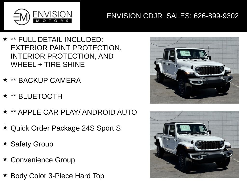 ** FULL DETAIL INCLUDED: EXTERIOR PAINT PROTECTION, INTERIOR PROTECTION, AND WHEEL + TIRE SHINE, ** BACKUP CAMERA, ** BLUETOOTH, ** APPLE CAR PLAY/ ANDROID AUTO, Advanced Brake Assist, Air Conditioning w/Auto Temperature Control, Auto High Beam Headlamp Control, Automatic Headlamps, Blind Spot & Cross Path Detection, Body Color 3-Piece Hard Top, Body Color Fender Flares (2-Piece), Cluster 7.0" TFT Color Display, Convenience Group, Corning Gorilla Glass, Daytime Running Lamp System, Deep Tint Sunscreen Windows, Emergency/Assistance Call, Enhanced Adaptive Cruise Control, Front 1-Touch Down Power Windows, Front Door Locks 2-Door Passive Entry, Full Speed Forward Collision Warning Plus, Heated Front Seats, Heated Steering Wheel, LED Taillamps, Normal Duty Plus Suspension, ParkSense Rear Park Assist System, Power Heated Mirrors, Power Tailgate Lock, Premium Wrapped Steering Wheel, Quick Order Package 24S Sport S, Remote Keyless Entry, Remote Start System, Safety Group, Security Alarm, Speed Sensitive Power Locks, Sun Visors w/Illuminated Vanity Mirrors, Universal Garage Door Opener, Wheels: 17" x 7.5" Gray.Bright White Clearcoat2024 Jeep Gladiator Sport S 4X4 4WD 8-Speed Automatic 3.6L V6 24V VVT Price includes: 15% Msrp - 2024 National Standalone 15% Below MSRP (1/B/L/E) . Exp. 04/30/2025