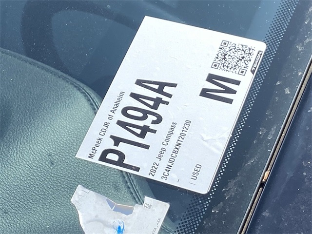Certified. 22/30 City/Highway MPG Clean CARFAX. CARFAX One-Owner. INTERIOR & EXTERIOR PROFESSIONALLY DETAILED FOR DELIVERY, MCPEEK CHRYSLER DODGE JEEP RAM FAMILY OWNED AND OPERATED SINCE 1961 !!!!!, 4WD.Sting-Gray Clearcoat 2022 Jeep Compass Limited 4WD 9-Speed 948TE AutomaticFCA US LLC Certified Pre-Owned Details: * Limited Warranty: 3 Month/3,000 Mile (whichever comes first) after new car warranty expires or from certified purchase date * Warranty Deductible: $100 * Roadside Assistance * Transferable Warranty * Includes First Day Rental, Car Rental Allowance, and Trip Interruption Benefits. SiriusXM 3 month trial subscription * Powertrain Limited Warranty: 84 Month/100,000 Mile (whichever comes first) from original in-service date * 125 Point Inspection * Vehicle HistoryReceive Free lube and oil filter changes for up to 45,000 miles for 3 years!!! McPeek's Dodge of Anahiem 1221 S. Auto Center Drive Anahiem, CA 92806 714-262-4902.