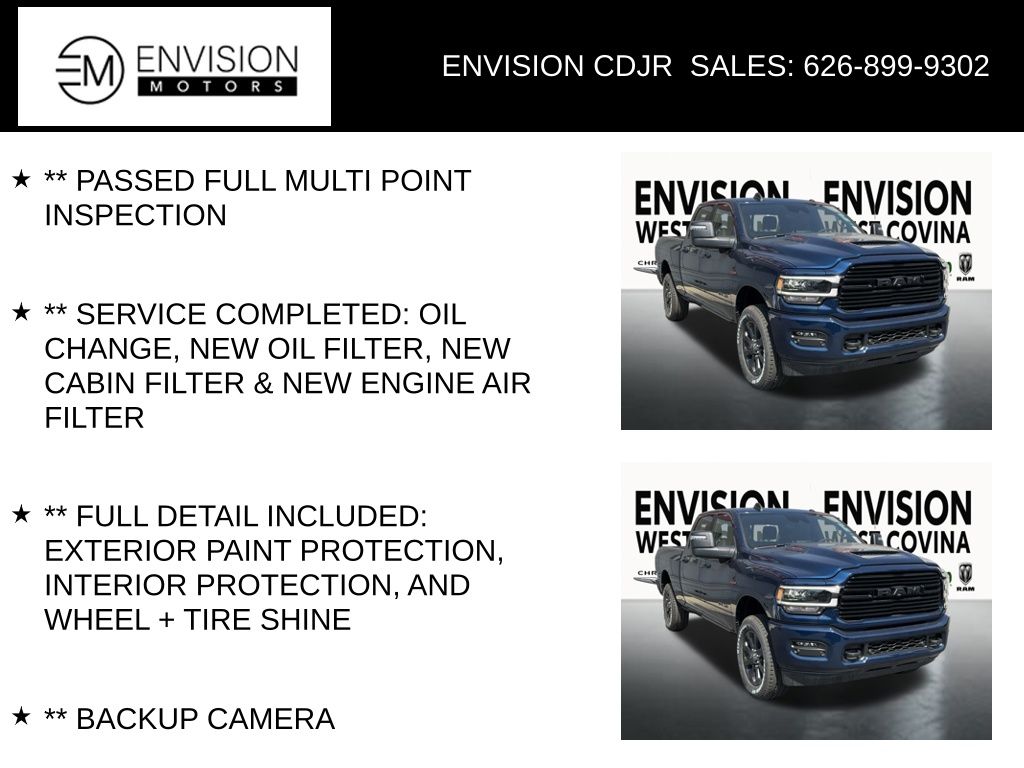 ** PASSED FULL MULTI POINT INSPECTION, ** SERVICE COMPLETED: OIL CHANGE, NEW OIL FILTER, NEW CABIN FILTER & NEW ENGINE AIR FILTER, ** FULL DETAIL INCLUDED: EXTERIOR PAINT PROTECTION, INTERIOR PROTECTION, AND WHEEL + TIRE SHINE, ** BACKUP CAMERA, ** BLUETOOTH, ** APPLE CAR PLAY/ ANDROID AUTO, 12" Touchscreen Display, 17 Speaker harman/kardon Premium Sound, 2nd Row In Floor Storage Bins, 4G LTE Wi-Fi Hot Spot, Adaptive Cruise Control w/Stop, Adaptive Steering System, Alexa Built-In, Apple CarPlay, Auto Adjust In Reverse Exterior Mirrors, Auto Dim Exterior Mirror, Auto High Beam Headlamp Control, Auto Power-Folding Mirrors, Auto-Dimming Exterior Passenger Mirror, Bed Utility Group, Black Exterior Truck Badging, Black Headlamp Bezels, Black Interior Accents, Black Ram Head Tailgate Badge, Black Tail Lamp Bezels, Black Wheel Center Hub, Blind Spot & Cross Path Detection, Body Color Grille Surround, Center Hub, Chrome Exterior Mirrors, Connected Travel & Traffic Services, Connectivity - US/Canada, CTR Stop Lamp w/Cargo View Camera, Digital 3.0 Rear View Auto Dimming Mirror, Disassociated Touchscreen Display, Exterior Mirrors Courtesy Lamps, Exterior Mirrors w/Heating Element, Exterior Mirrors w/Memory, Exterior Mirrors w/Supplemental Signals, Foam Bottle Insert (Door Trim Panel), For Details, Visit DriveUconnect.com, For More Info, Call 800-643-2112, Forward & Reverse Utility Lights, Front LED Fog Lamps, Full Speed Forward Collision Warning Plus, Global Telematics Box Module (TBM), Gloss Black Grille Billets/Accents, Google Android Auto, GPS Antenna Input, GPS Navigation, HD Radio, Heated Second Row Seats, Integrated Voice Command w/Bluetooth, Lane Keep Assist, Laramie Level B Equipment Group, LED Bed Lighting, LED Reflector Headlamps, LED Tail Lamps, Mirror Running Lights, MOPAR Deployable Bed Step, MOPAR Spray In Bedliner, Night Edition, Off-Road Information Pages, ParkSense Front/Rear Park Assist System, Power Adjust Mirrors, Power Adjustable Convex Aux Mirrors, Power Adjustable Pedals w/Memory, Power Heated Fold Telescopic Mirrors w/Memory, Power Sunroof, Power Telescoping Mirrors, Quick Order Package 2HH Laramie, Radio: Uconnect 5 Nav w/12.0" Display, Rain Sensitive Windshield Wipers, Rear Power Sliding Window, Rear Window Defroster, Remote Tailgate Release, Safety Group, Selectable Tire Fill Alert, SiriusXM Radio Service, SiriusXM w/360L, Sport Performance Hood, Surround View Camera System, Tow Technology Plus Group, Towing Technology Group, Trailer Reverse Guidance, Trailer Reverse Steering Control, Trailer Tow Pages, Wheels: 18" x 8.0" Polished Aluminum, Wheels: 20" x 8.0" Black Painted Aluminum.Patriot Blue Pearlcoat2024 Ram 2500 Laramie NIGHT CREW CAB 4X4 4WD 6-Speed Automatic Cummins 6.7L I6 Turbodiesel Price includes: $8126 - 2024 National Minimum Employee Pricing Discount . Exp. 06/30/2025
