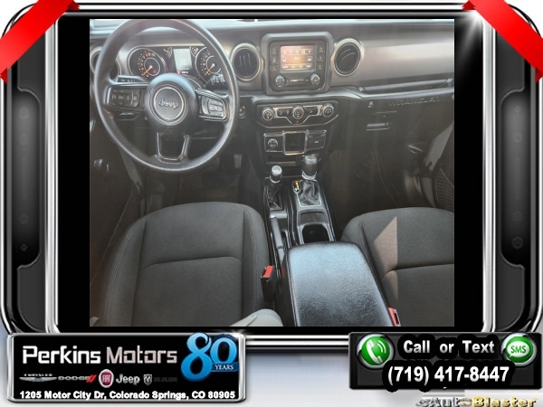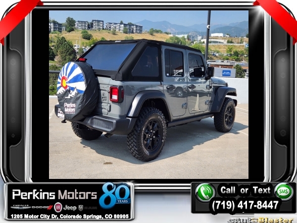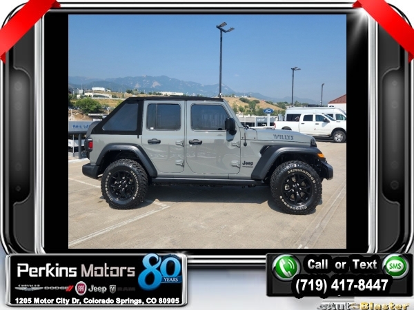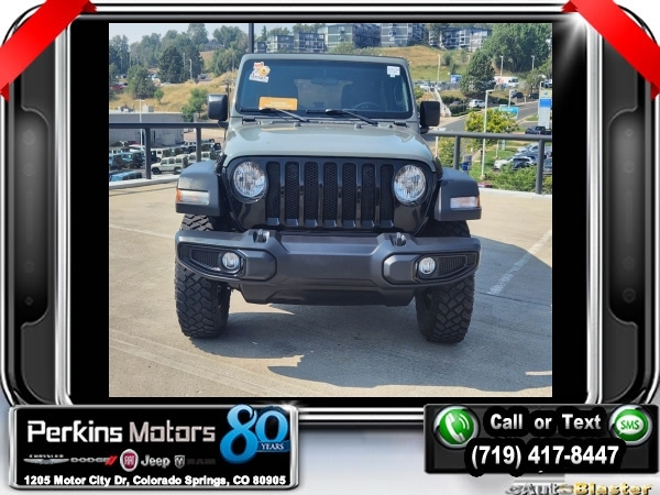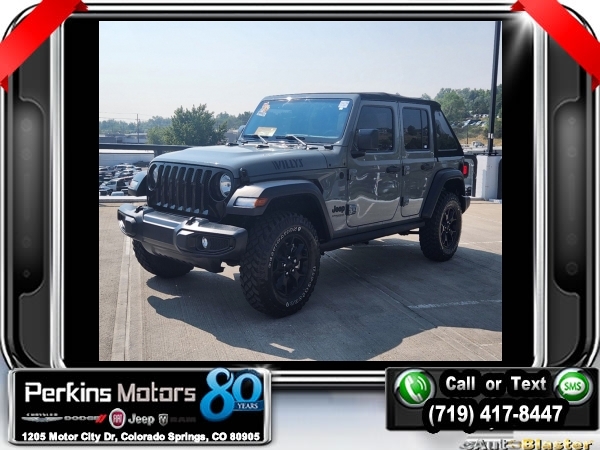 Sting-Gray Clearcoat 4WD 3.6L V6 24V VVT 8-Speed Automatic<br><br>240 Amp Alternator, 4-Wheel Drive Swing Gate Decal, 7 & 4 Pin Wiring Harness, 700 Amp Maintenance Free Battery, Anti-Spin Differential Rear Axle, Auxiliary Switches, Black 3-Piece Hard Top, Black Grille, Black Trail Rated Badge, Class II Receiver Hitch, Deep Tint Sunscreen Windows, Freedom Panel Storage Bag, Matte Black Jeep Badge, Mold In Color Bumper w/Gloss Black, MOPAR All-Weather Floor Mats (DISC), No Soft Top, Quick Order Package 25K Willys Sport (DISC), Rear Window Defroster, Rear Window Wiper/Washer, Trailer Tow & HD Electrical Group, Wheels: 17 x 7.5 Moab Black Aluminum, Willys, Willys Hood Decal, Wrangler Decal.<br><br><br>CARFAX One-Owner.<br><br>Check us out at www.perkinsmotors.com to see our specials! Since opening our doors in 1944, we’ve been proud to serve Colorado Springs, CO, and the surrounding areas of Pueblo, Castle Rock and Denver, CO. Throughout this time of being family owned for 80 years, we’ve maintained a firm commitment to our customers: to offer a wide selection of New Chrysler, Dodge, Fiat, Jeep, and Ram vehicles and quality pre-owned vehicles, and provide a quick, no-hassle car-buying process that ensures everyone drives off the lot satisfied with their purchase.<br><br><br>Quick Order Package 25K Willys Sport (DISC) (4-Wheel Drive Swing Gate Decal, Anti-Spin Differential Rear Axle, Black Grille, Black Trail Rated Badge, Deep Tint Sunscreen Windows, Matte Black Jeep Badge, Mold In Color Bumper w/Gloss Black, MOPAR All-Weather Floor Mats (DISC), Wheels: 17 x 7.5 Moab Black Aluminum, Willys, Willys Hood Decal, and Wrangler Decal), Trailer Tow & HD Electrical Group (240 Amp Alternator, 7 & 4 Pin Wiring Harness, 700 Amp Maintenance Free Battery, Auxiliary Switches, and Class II Receiver Hitch), Black 3-Piece Hard Top, Freedom Panel Storage Bag, No Soft Top, Rear Window Defroster, Rear Window Wiper/Washer, 3.45 Rear Axle Ratio, 4-Wheel Disc Brakes, 8 Speakers, ABS brakes, Air Conditioning, AM/FM radio, Aux Battery, Brake assist, Cloth Low-Back Bucket Seats, Compass, Cruise Control, Delay-off headlights, Driver door bin, Driver vanity mirror, Dual front impact airbags, Dual front side impact airbags, Electronic Stability Control, Front anti-roll bar, Front Bucket Seats, Front Center Armrest w/Storage, Front fog lights, Front reading lights, Integrated roll-over protection, Low tire pressure warning, Manufacturer's Statement of Origin, MOPAR All-Weather Floor Mats, Non-Lock Fuel Cap w/o Discriminator, Normal Duty Suspension, Occupant sensing airbag, Outside temperature display, ParkView Rear Back-Up Camera, Passenger door bin, Passenger vanity mirror, Power steering, Radio data system, Radio: Uconnect 3 w/5 Display, Rear anti-roll bar, Rear reading lights, Split folding rear seat, Steering wheel mounted audio controls, Stop-Start Dual Battery System, Tachometer, Telescoping steering wheel, Tilt steering wheel, Traction control, Trip computer, Variably intermittent wipers, and Wheels: 17 x 7.5 Black Steel Styled.
