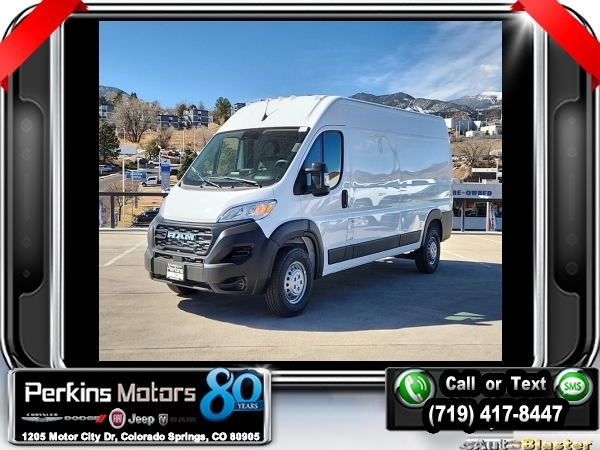 Factory MSRP: $53,705 $7,500 off MSRP! Priced below KBB Fair Purchase Price! Bright White Clearcoat 2024 Ram ProMaster 2500 High Roof FWD 9-Speed 948TE Automatic 3.6L V6 24V VVT<br><br>Check us out at www.perkinsmotors.com to see our specials! Since opening our doors in 1944, we’ve been proud to serve Colorado Springs, CO, and the surrounding areas of Pueblo, Castle Rock and Denver, CO. Throughout this time of being family owned for 80 years, we’ve maintained a firm commitment to our customers: to offer a wide selection of New Chrysler, Dodge, Fiat, Jeep, and Ram vehicles and quality pre-owned vehicles, and provide a quick, no-hassle car-buying process that ensures everyone drives off the lot satisfied with their purchase.<br><br>Quick Order Package 22B Tradesman w/Pass Seat (4-Way Manual Adjust Front Passenger Seat and Passenger Bucket Seat), 4 Speakers, 4-Wheel Disc Brakes, 4.08 Axle Ratio, ABS brakes, Air Conditioning, AM/FM radio: SiriusXM, Apple CarPlay/Android Auto, Black/Gray Seats, Bodyside moldings, Brake assist, Cloth Bucket Seats, Driver door bin, Driver Seat Armrest, Driver's Seat Mounted Armrest, Electronic Stability Control, Exterior Mirrors w/Supplemental Signals, Front anti-roll bar, Front Bucket Seats, Front License Plate Bracket, Front reading lights, Front wheel independent suspension, Heavy Duty Suspension, Illuminated entry, Low tire pressure warning, Manufacturer's Statement of Origin, MOPAR Cargo Area LED Lighting, Outside temperature display, Overhead airbag, Overhead console, ParkView Rear Back-Up Camera, Passenger door bin, Power steering, Power windows, Radio: Uconnect 5 w/7 Display, Remote keyless entry, Steering wheel mounted audio controls, Tachometer, Telescoping steering wheel, Traction control, Trip computer, Turn signal indicator mirrors, Variably intermittent wipers, Wheel Center Cap, and Wheels: 16 x 6.0 Steel.